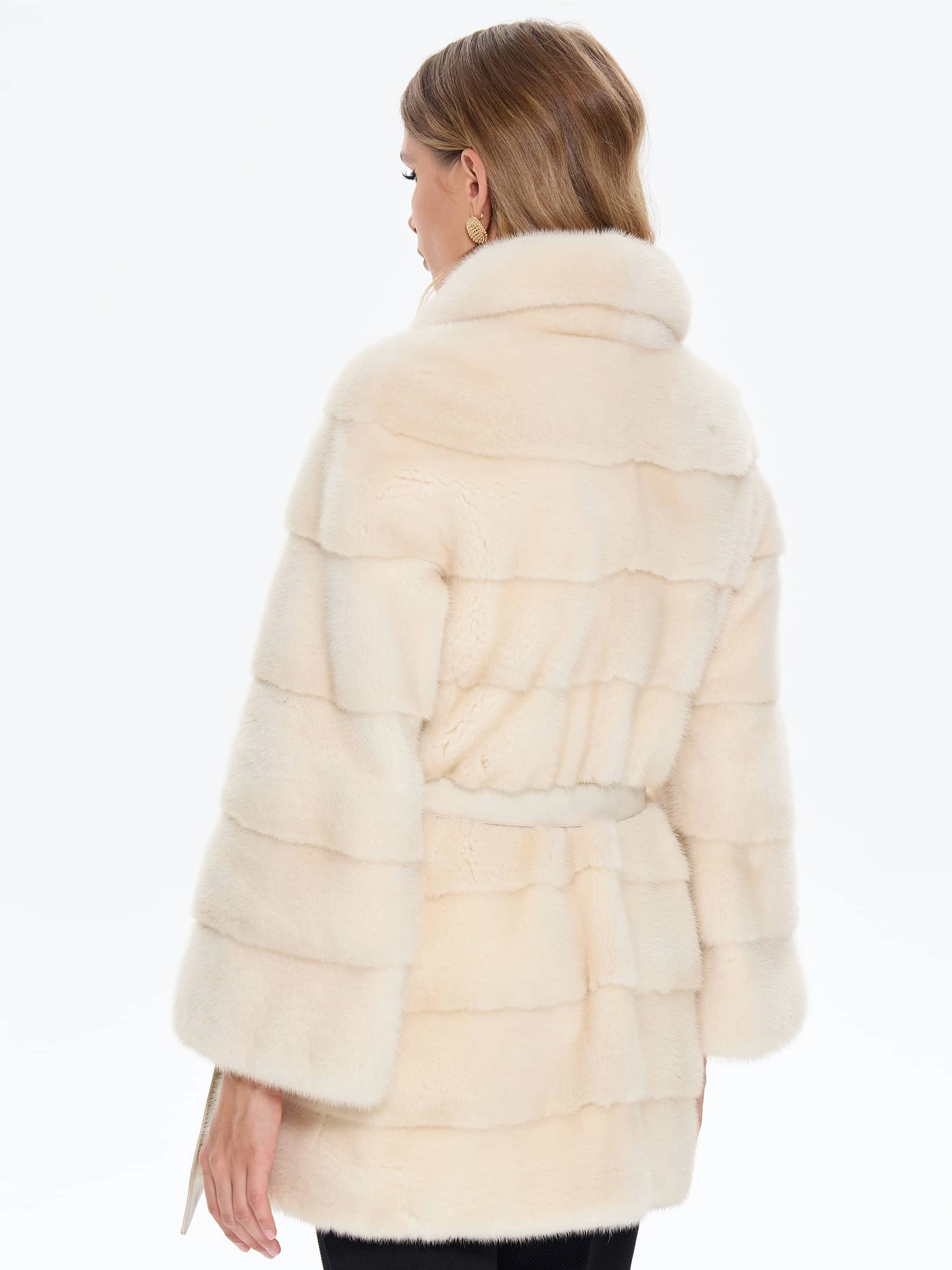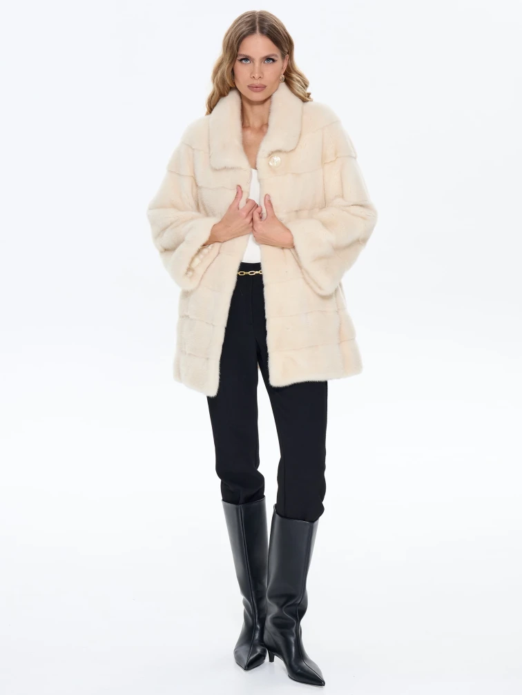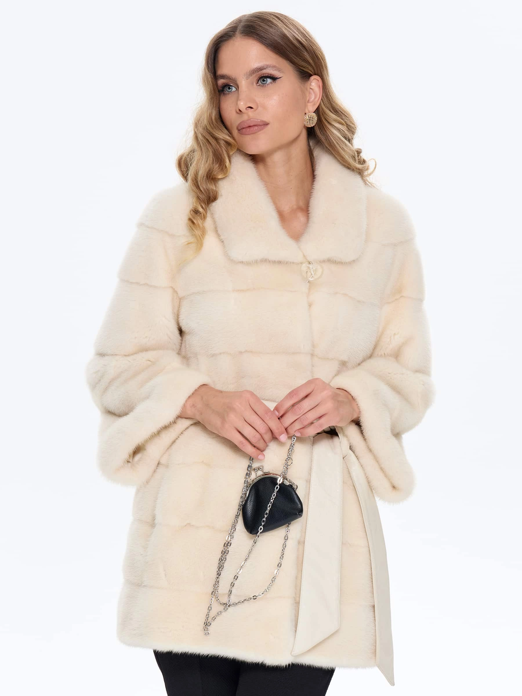 Элегантная короткая шубка из белоснежной норки воплощает зимнюю роскошь, представляя густой шелковистый мех с поперечной раскладкой шкурок, который создает эффект мерцающего снега и переливается при движении. Прямой силуэт обеспечивает свободу и комфорт в автомобиле и на прогулке, а укороченный крой, закрывающий бедра, подчеркивает стройность фигуры. Объемный воротник-стойка с мягкими складками защищает от ветра и добавляет образу воздушности, в то время как шелковая подкладка с антистатической пропиткой обеспечивает нежное прикосновение к коже и дополнительное тепло. Магнитные застежки бережно фиксируют мех, сохраняя его безупречный вид, делая эту шубку идеальным сочетанием с кожаными юбками, вязаными платьями-миди и объемными свитерами, превращая ее не просто в теплую вещь, а в главный акцент зимнего гардероба, требующий особого ухода за чистым белым цветом.
