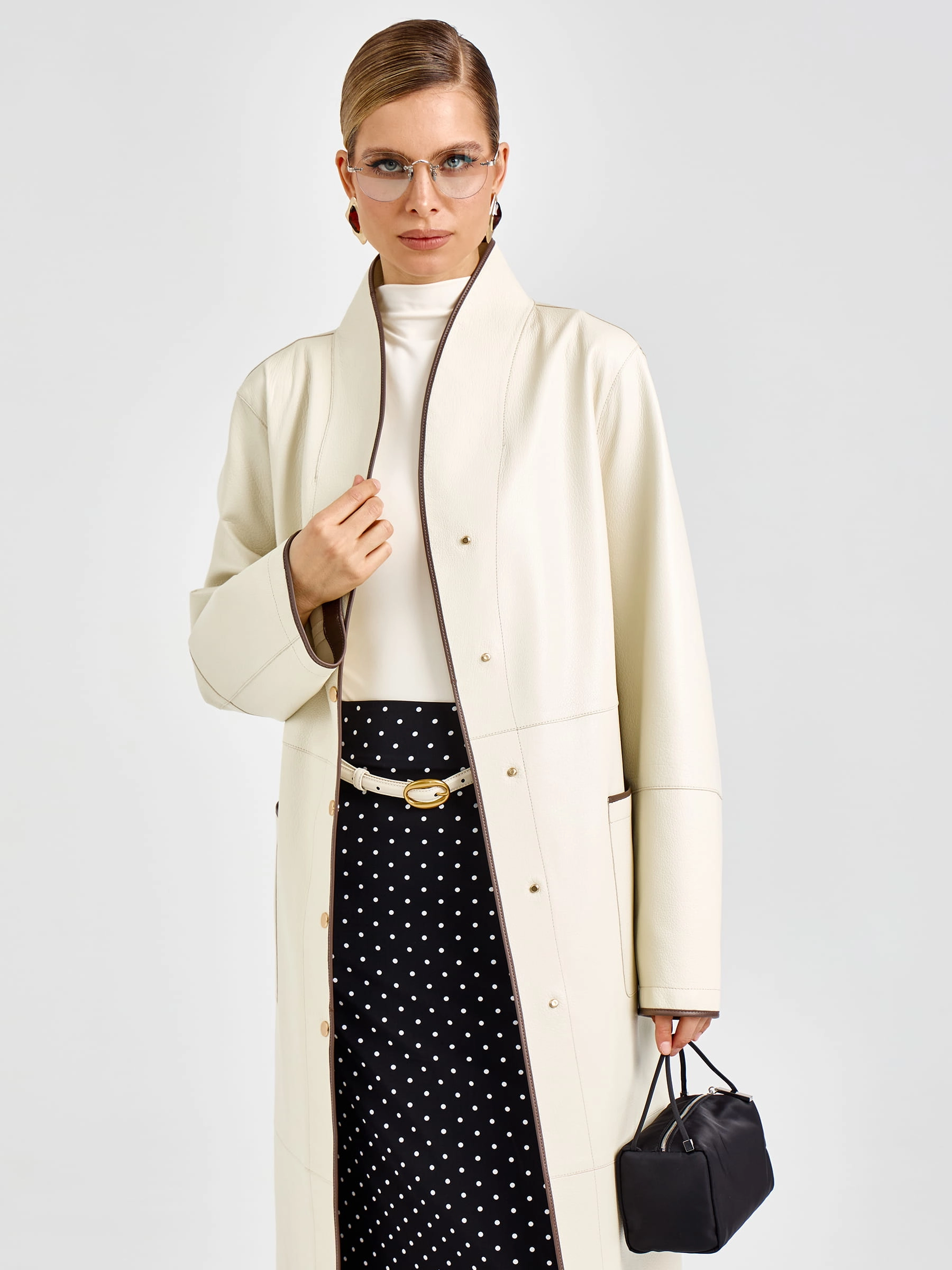 Роскошный белый плащ длиной 125 см из мягкой кожи премиального качества прямого кроя: элегантный шалевидный воротник и боковые накладные карманы создают эффектный силуэт, а длинный пояс-лента позволяет регулировать посадку по фигуре. Застёжка на кнопках добавляет практичности и лаконичности. Совет стилиста: носите с кожаными брюками и сапогами-ботфортами для дерзкого вечернего образа или с платьем-миди и ботильонами для романтичного выхода — этот плащ станет вашей инвестицией в безупречный стиль и подарит ощущение роскоши в любой ситуации.