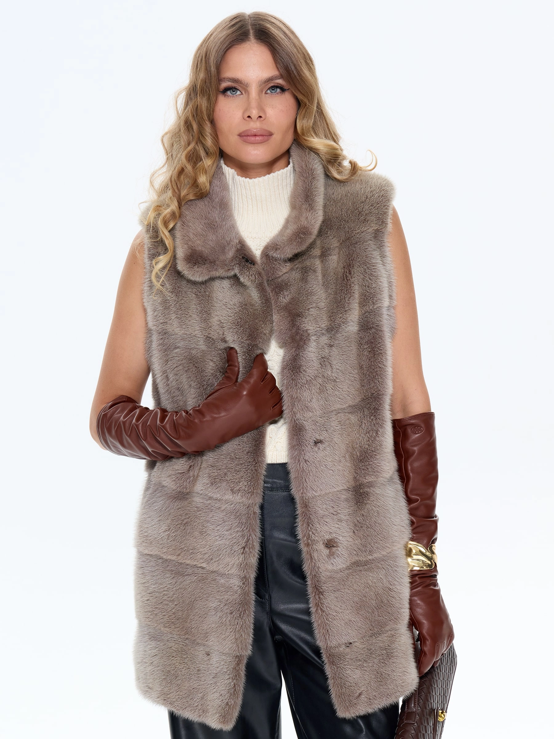 Элегантный длинный жилет из меха норки бежевого оттенка выполнен в классическом прямом силуэте с поперечной раскладкой меха и аккуратным воротником-стойкой. Модель с врезными карманами и длиной 75 см воплощает утонченную роскошь и универсальность. Рекомендация стилиста: сочетайте с водолазкой и кюлотами для дневного образа или накиньте поверх платья-миди с высокими сапогами для вечернего выхода. Этот жилет станет жемчужиной гардероба, добавляя образу безупречный шарм и благородную эстетику.