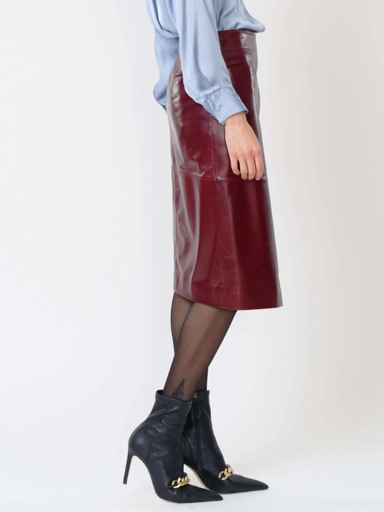 Бордовая кожаная юбка миди 07, размер 42, артикул 85420