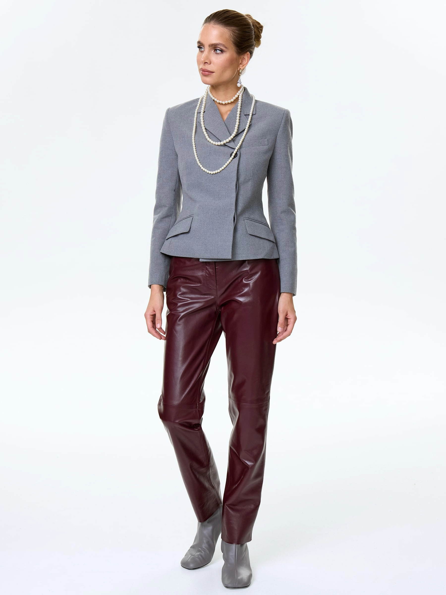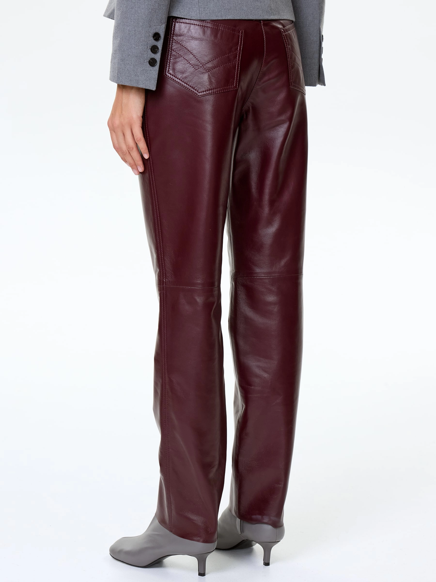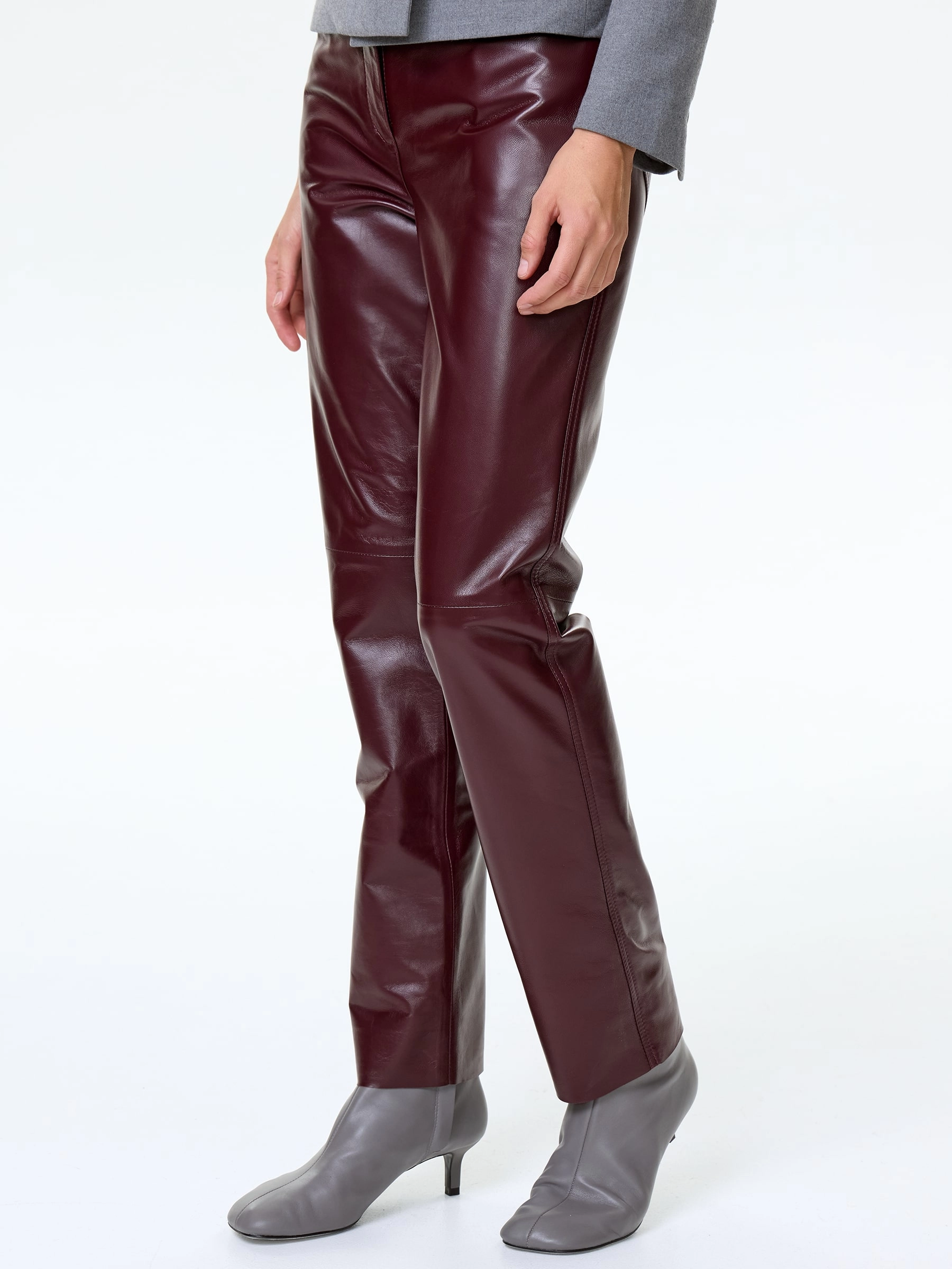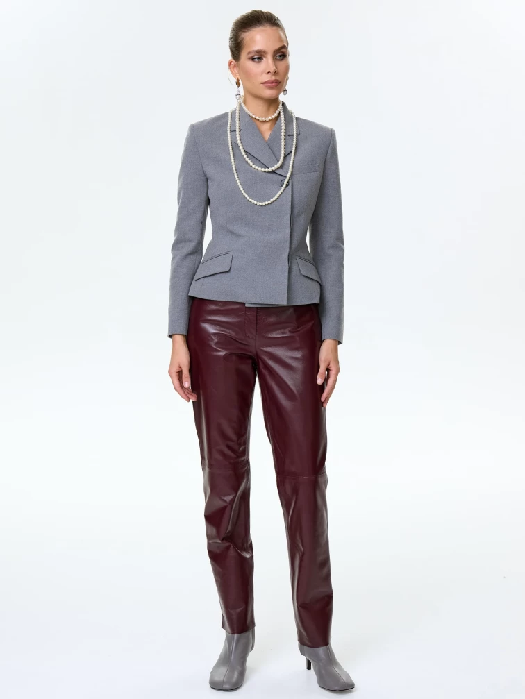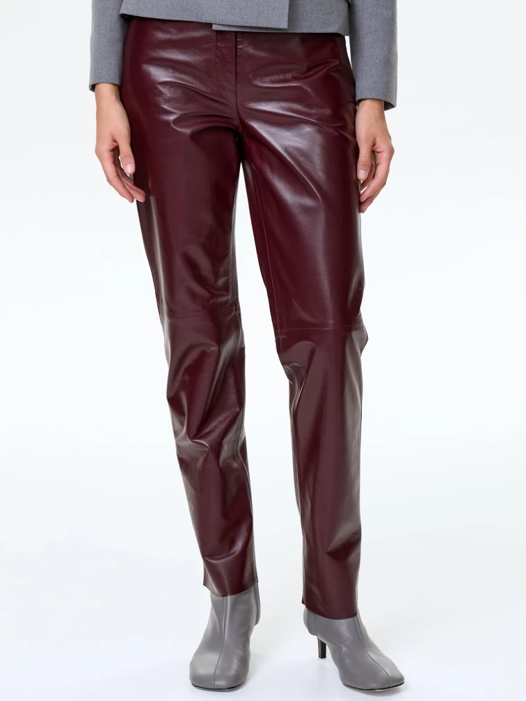 Зауженные брюки из натуральной кожи бордового и черного цвета прямого силуэта со средней посадкой. Модель выполнена из качественной кожи, длина изделия составляет 105 см. Практичность подчеркивают четыре кармана - два боковых и два задних. Элегантность силуэта завершает потайная застежка-молния с декоративной планкой.