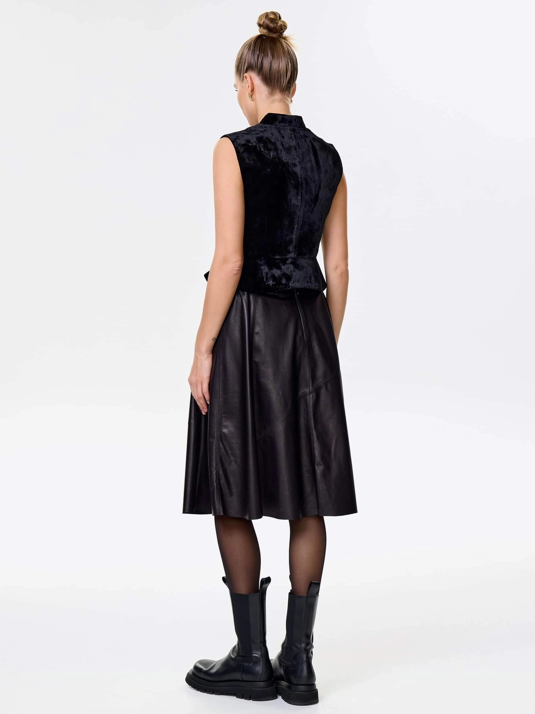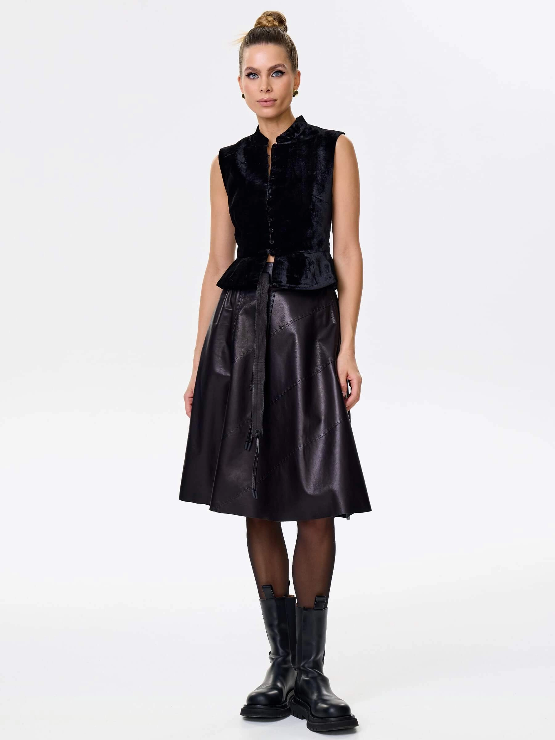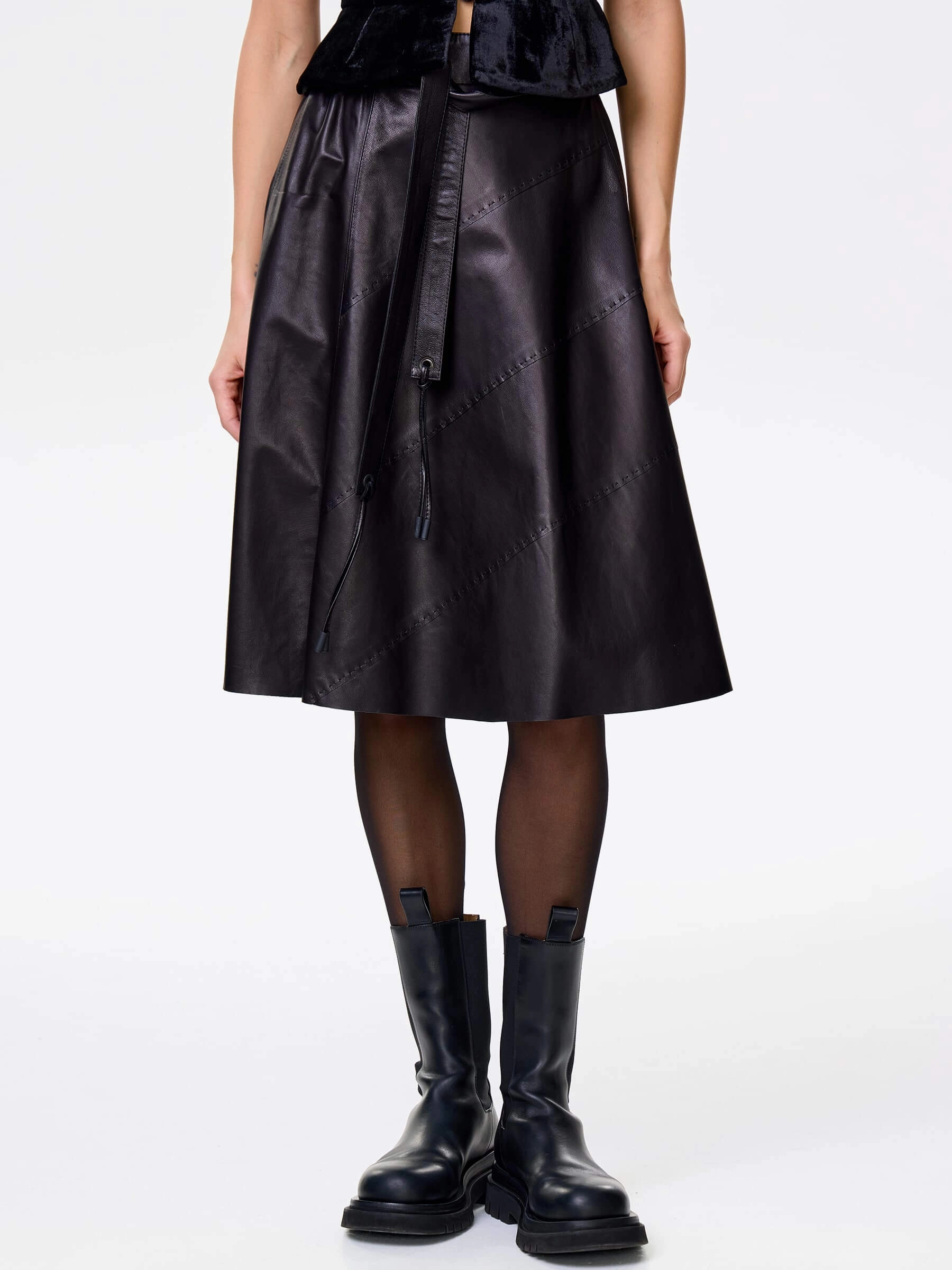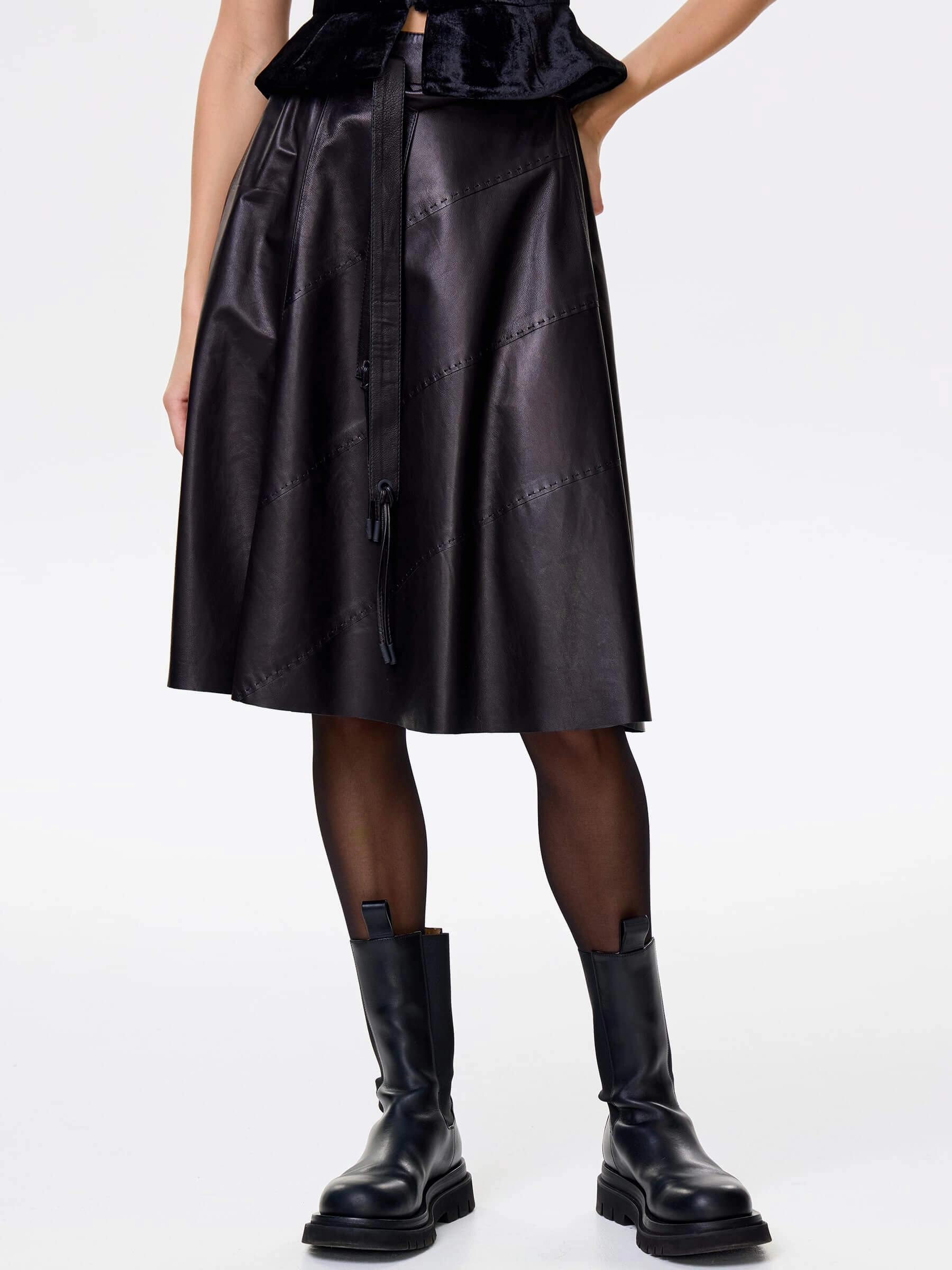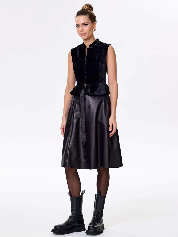 Облегающая расклешённая юбка из натуральной мягкой кожи черного цвета с благородным блеском сочетает комфорт, долговечность и безупречный стиль. Её летящий крой визуально стройнит фигуру, добавляя образу лёгкость и динамику, а эксклюзивная отделка ручной строчкой подчёркивает премиальное качество материала. Длинный пояс из той же кожи служит стильным акцентом, а потайная молния сзади обеспечивает идеальную посадку и чистоту линий, делая эту модель по-настоящему уникальной.