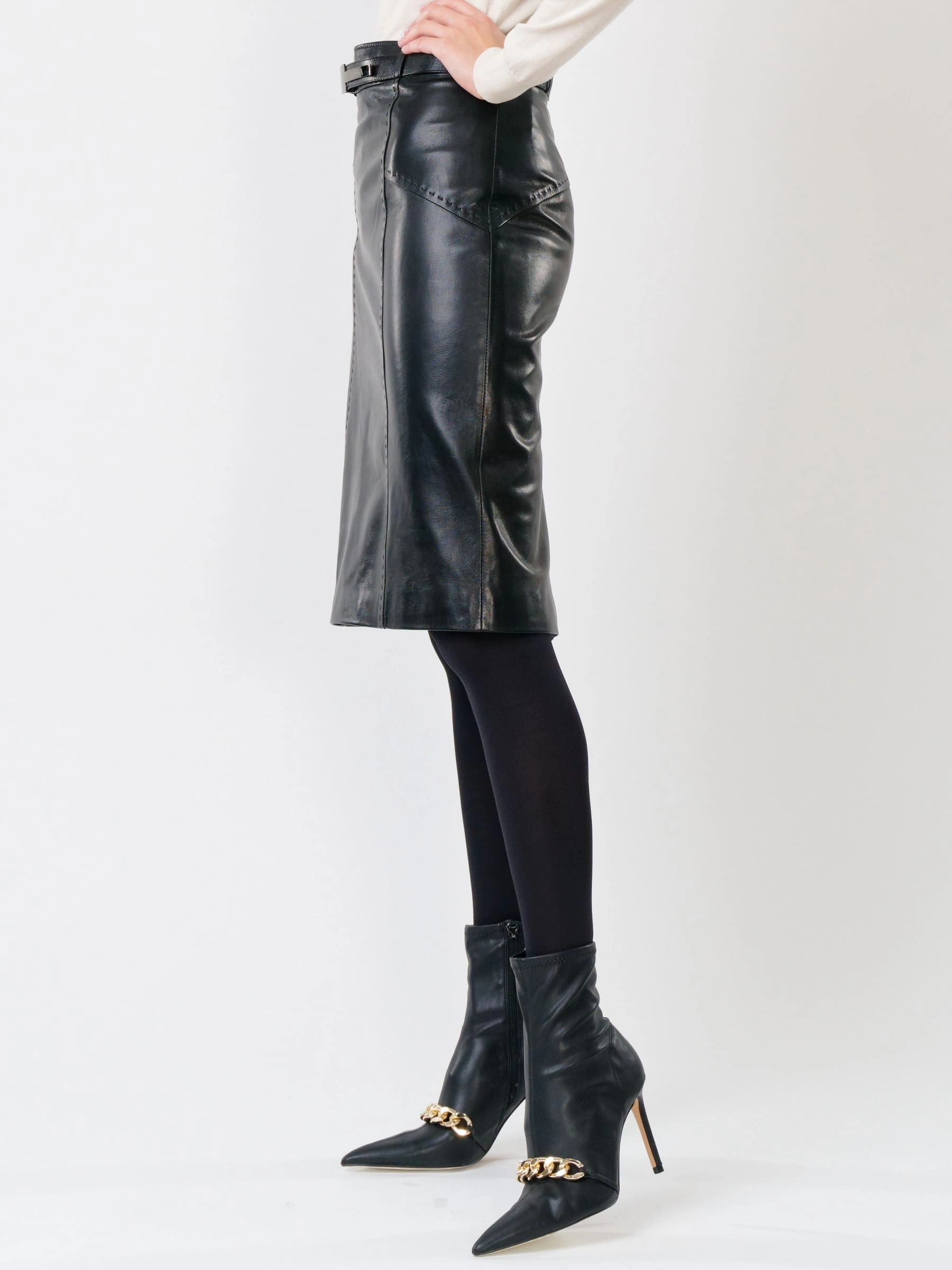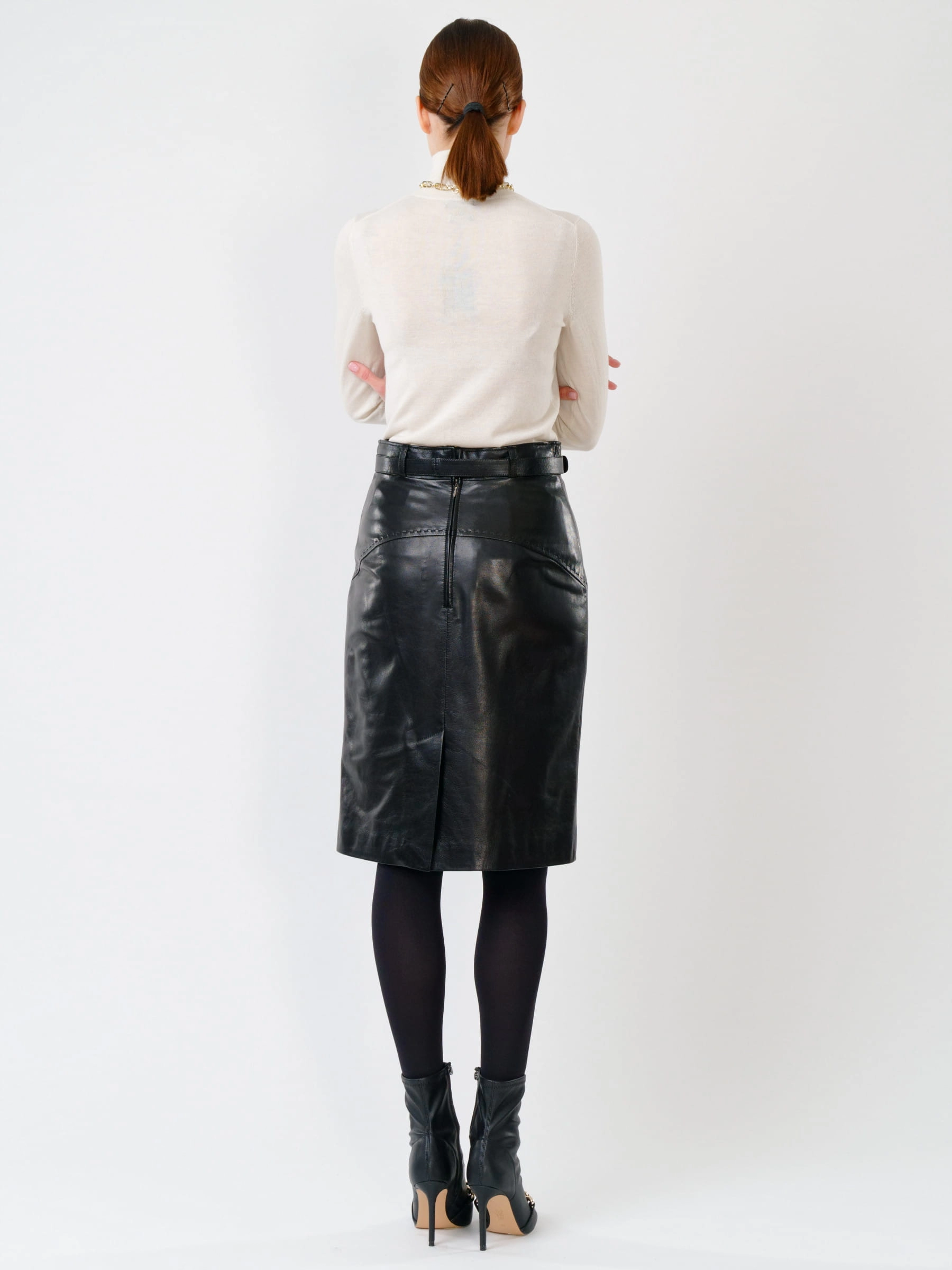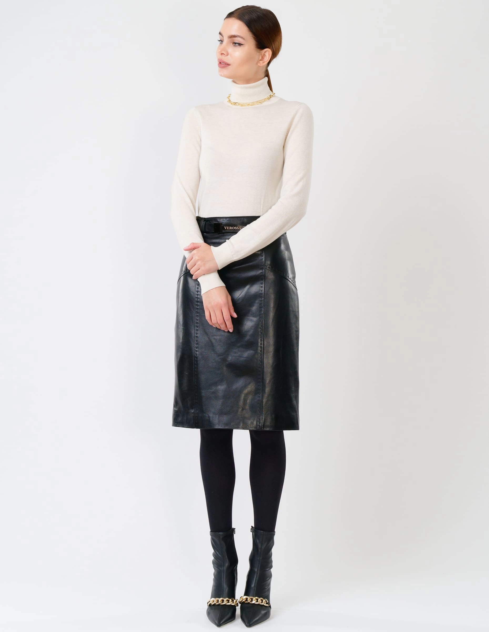 Юбка-карандаш из натуральной черной кожи — это воплощение современной элегантности. Благородный матовый блеск и идеальная плотность кожи создают премиальный внешний вид, в то время как продуманный крой обеспечивает комфорт в течение всего дня. Специально разработанная шлица гарантирует свободу движений, а скрытая застежка подчеркивает чистоту линий. Сочетайте с классической белой блузой для делового образа, с шелковым топом для вечера или с кожаной курткой для городского стиля — эта юбка станет универсальной основой вашего гардероба, сохраняя безупречный вид и форму после многократной носки.