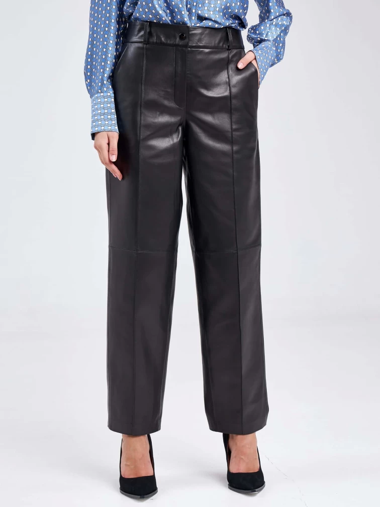 Создать эффектный образ помогут брюки со стрелками из натуральной кожи премиум-класс. Прямой крой, средняя посадка, удобные боковые карманы.