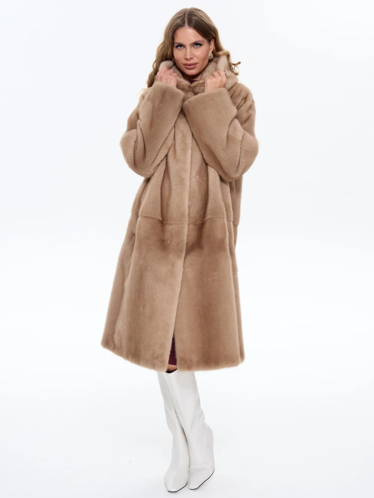 Элегантная длинная шуба из шелковистого меха норки с капюшоном пастельного оттенка модели «Жанет» создает образ утонченной роскоши. А-образный силуэт и объемный капюшон не только обеспечивают комфорт и защиту от непогоды, но и подчеркивают безупречный вкус своей обладательницы. Рекомендация стилиста: эту модель можно носить с облегающими брюками и высокими сапогами для создания элегантного повседневного образа или сочетать с платьем-миди и замшевыми ботильонами для особого случая. Идеальное сочетание королевской элегантности и современного комфорта.