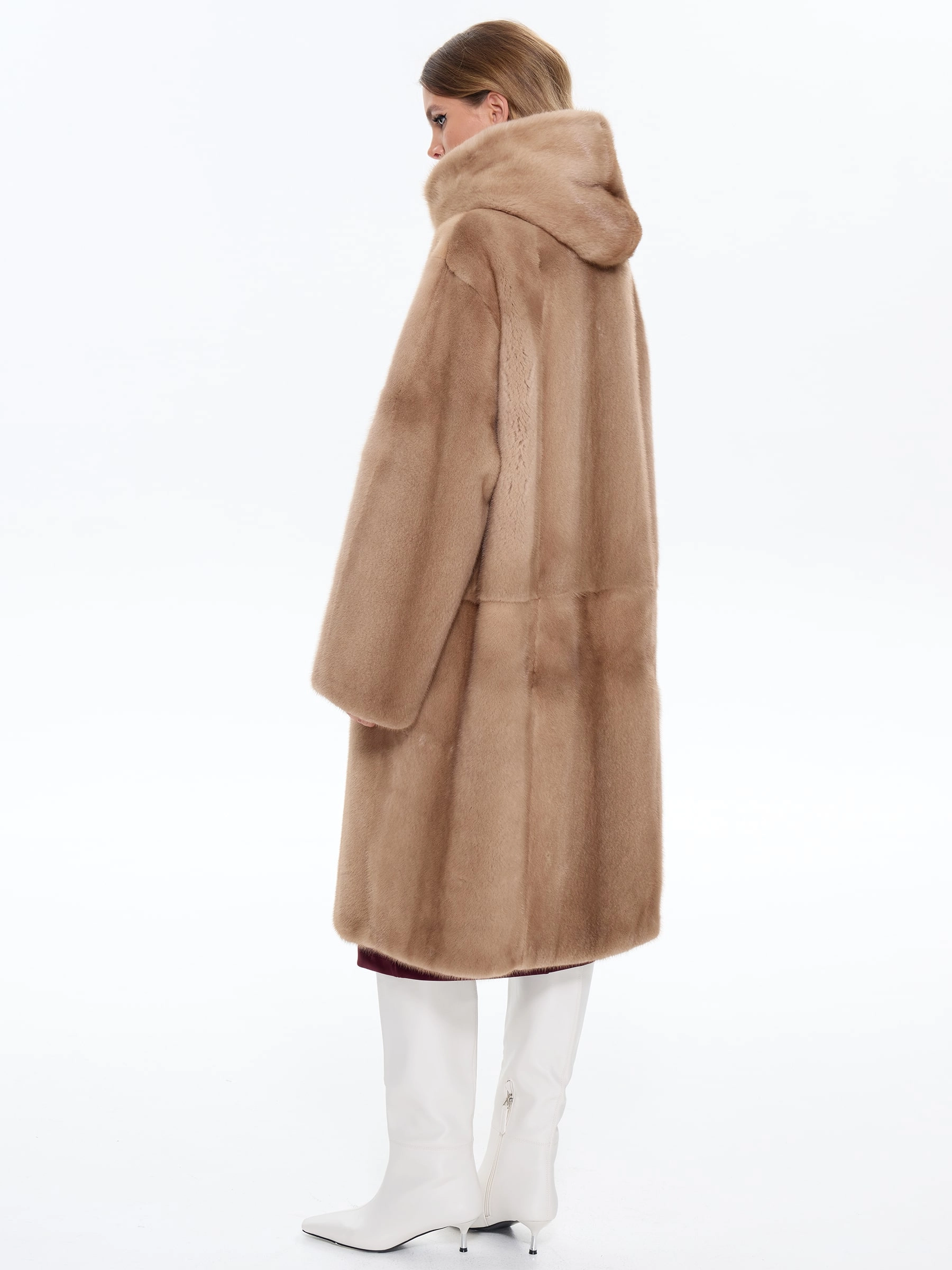 Длинная норковая женская шуба с капюшоном Жанет, пастельная, размер 52, артикул 65170