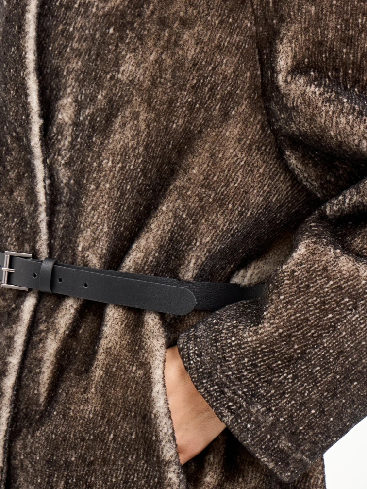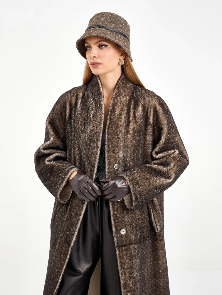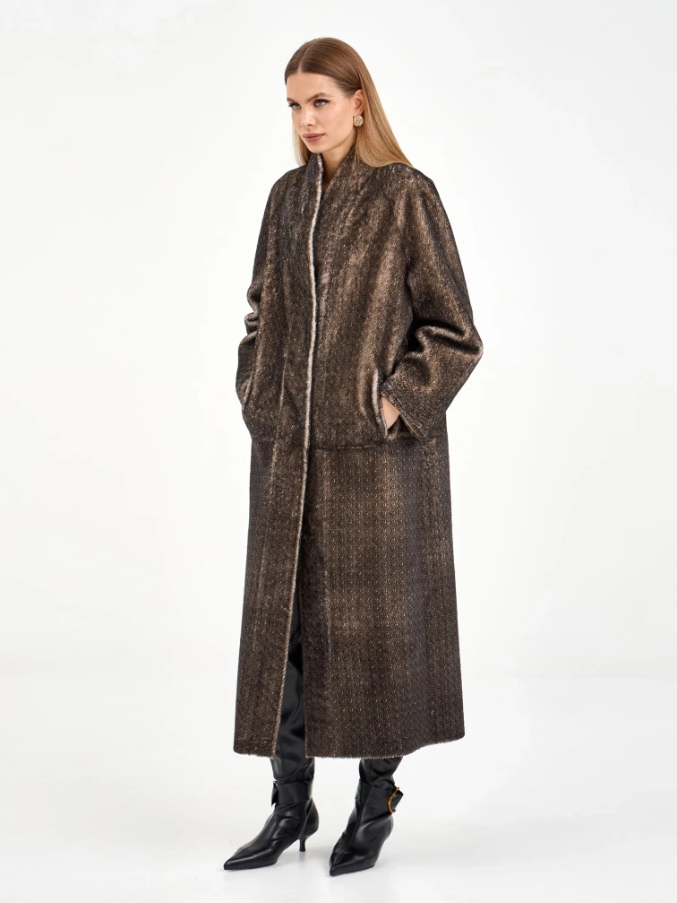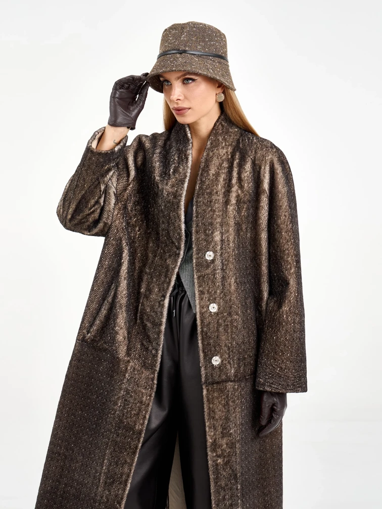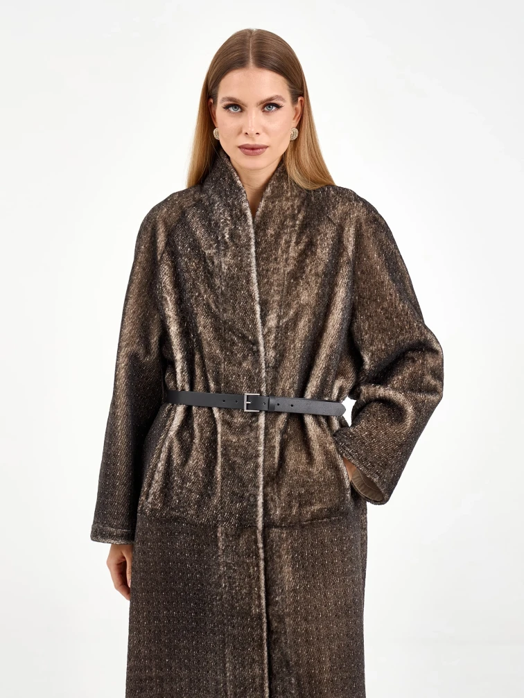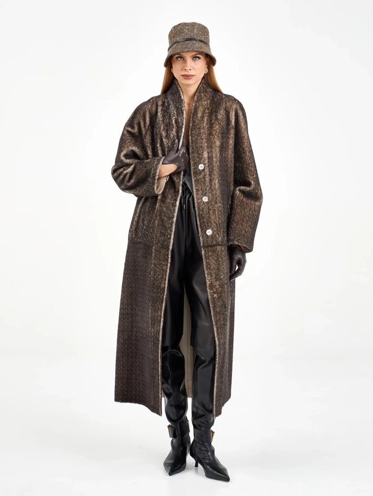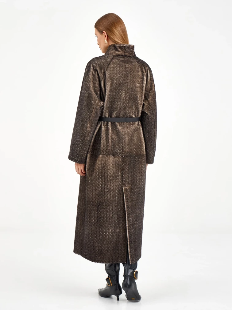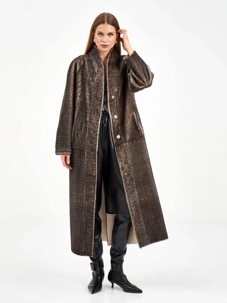Бежевая женская длинная дубленка из натуральной овчины — воплощение элегантности и стиля. Модель с воротником-стойкой и спущенным рукавом застегивается на кнопки и дополнена боковыми карманами с высокой шлицей сзади. Узкий кожаный ремень с пряжкой подчеркнет талию, добавляя образу легкую дерзость и индивидуальность. Совет стилиста: сочетайте с водолазкой, кожаными брюками и грубыми ботинками для смелого повседневного образа или наденьте поверх платья-чехла и сапог-ботфортов для элегантного вечернего выхода. Эта дубленка — идеальный баланс классической роскоши и современной смелости.