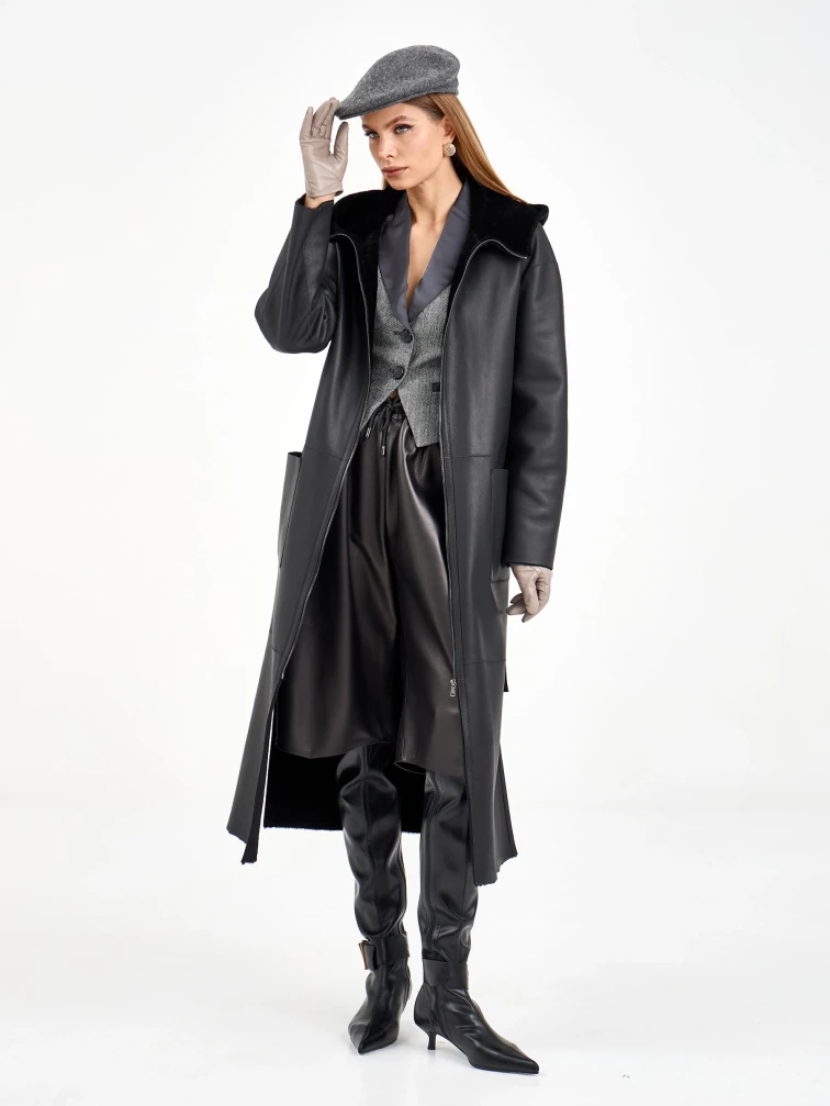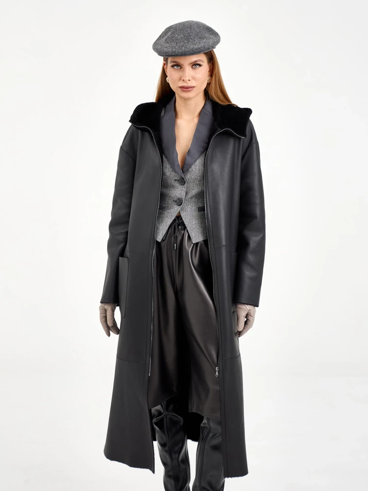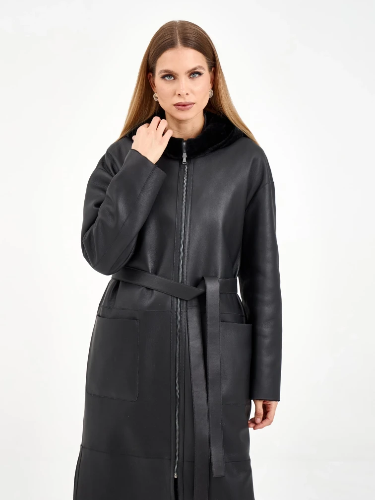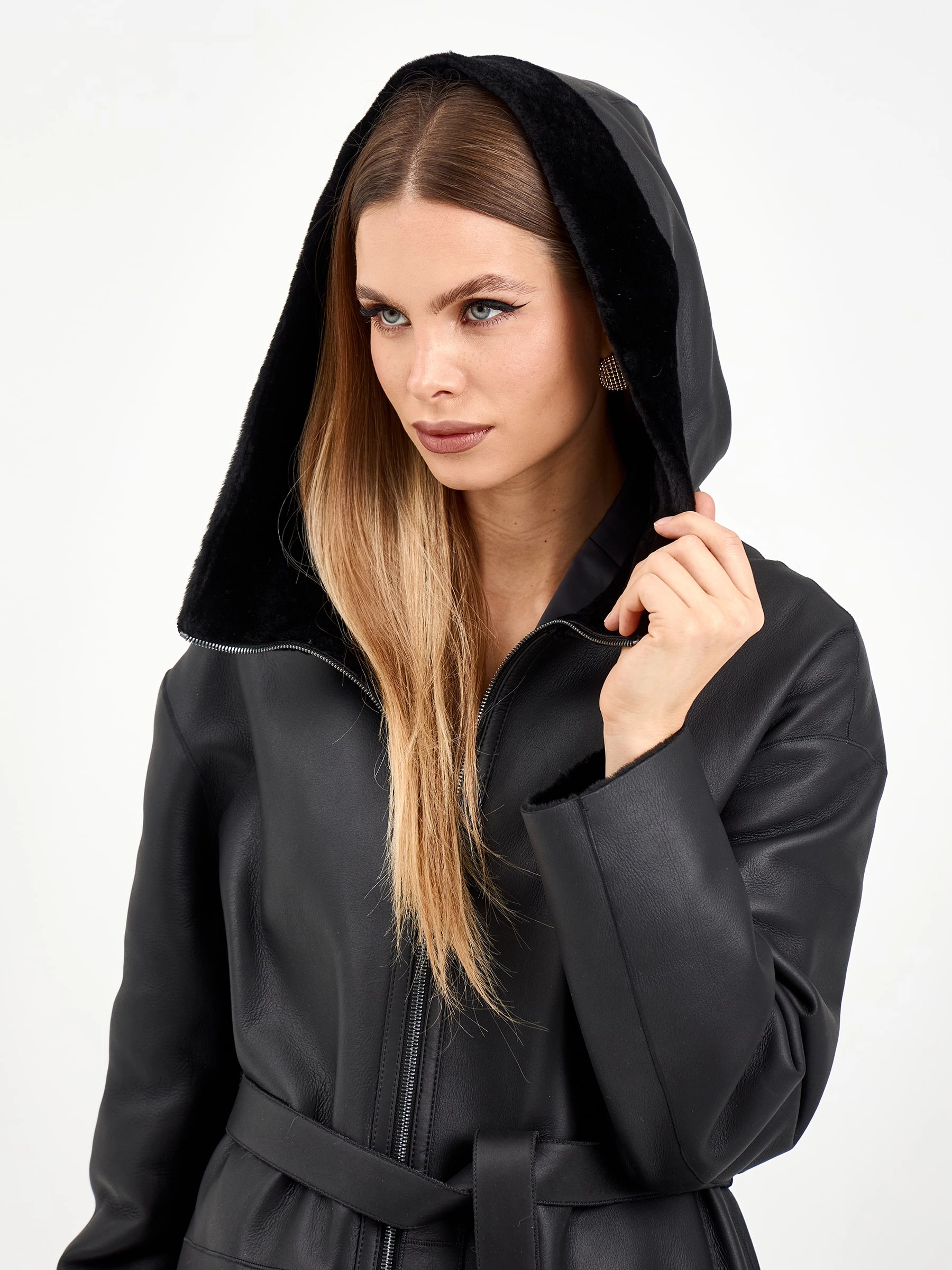 Длинная женская дубленка с капюшоном 2071, черная, размер 50, артикул 65060