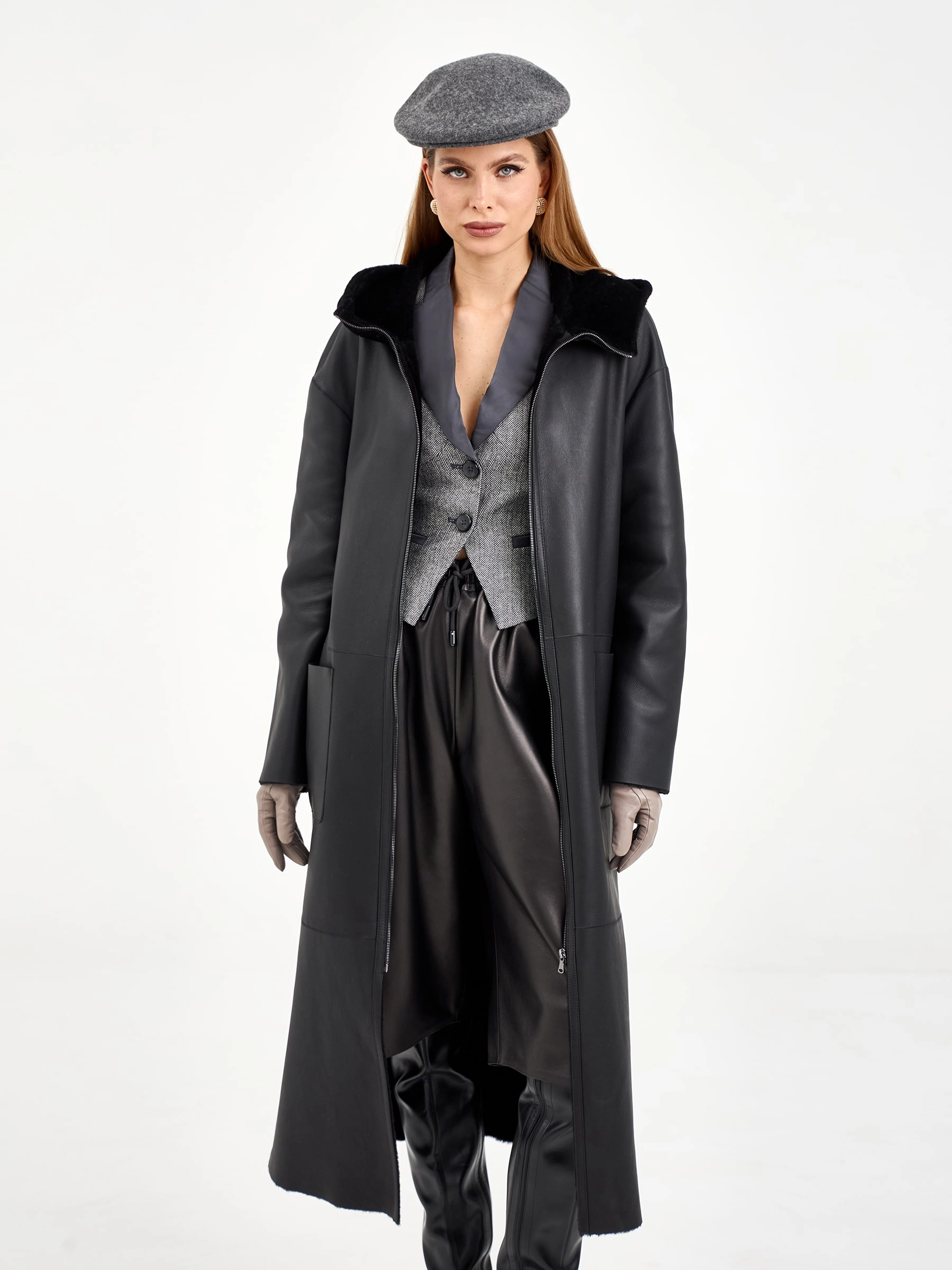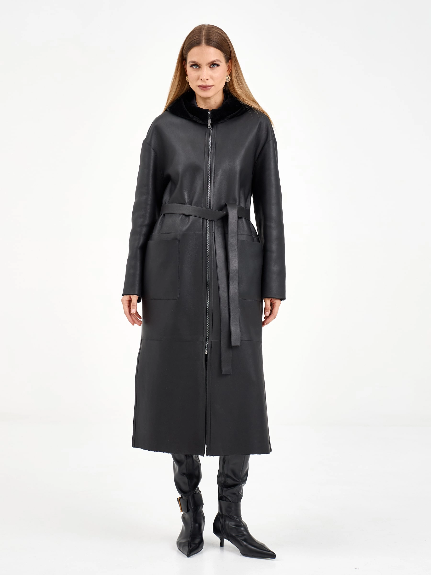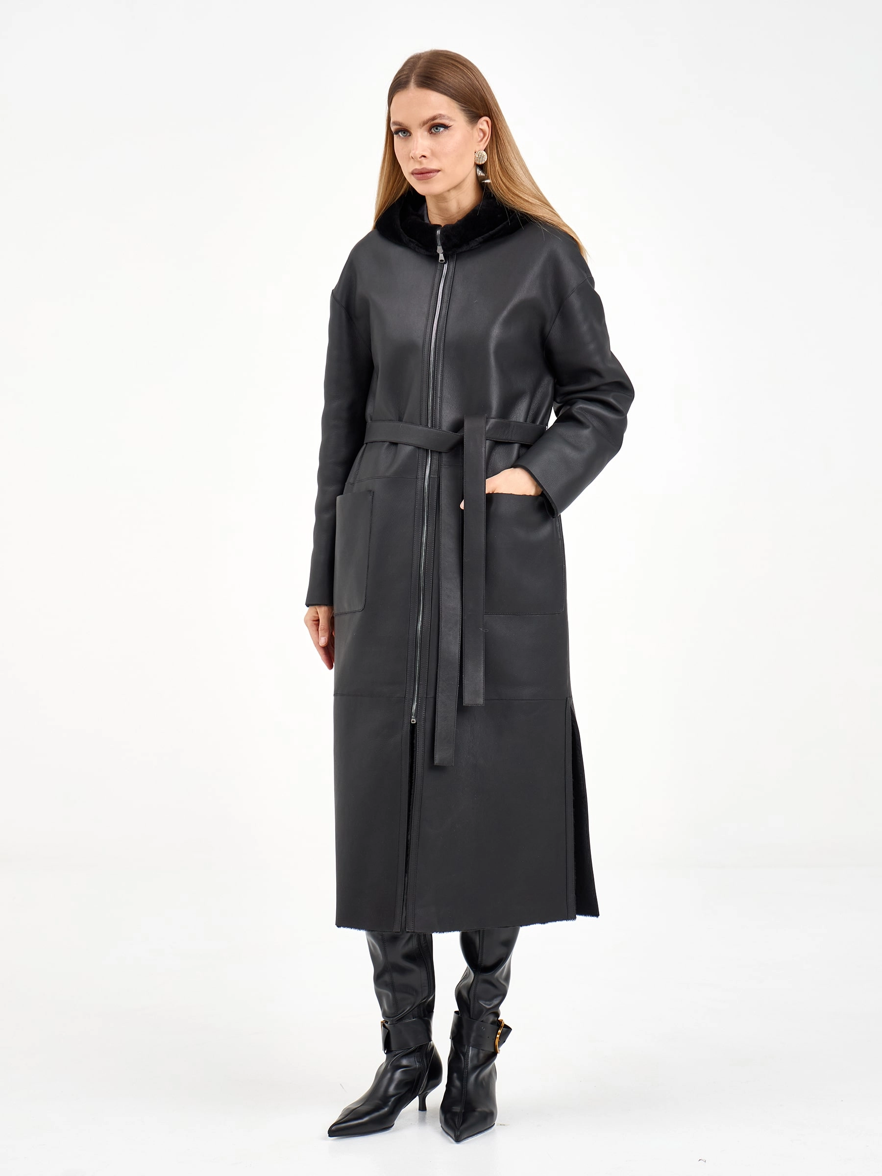 Коричневая длинная дубленка из натуральной овчины мерино свободного кроя с объемным воротником-стойкой. Модель с накладными карманами и изящными высокими боковыми разрезами дополнена длинным поясом, который позволяет менять силуэт. Совет стилиста: сочетайте с водолазкой, кожаными брюками и сапогами-челси для повседневного стиля или наденьте поверх платья с высокими сапогами, подчеркнув талию поясом для элегантного образа. Идеальное сочетание уютной классики и современного дизайна с практичными деталями