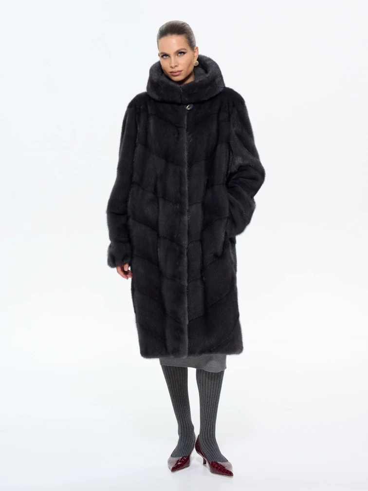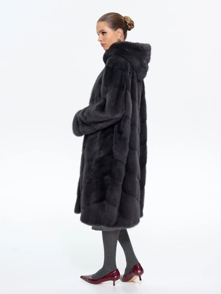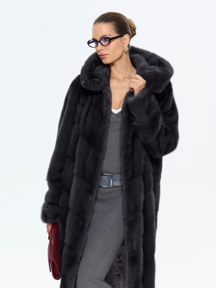 Длинная женская норковая шуба с капюшоном Москвичка-132, черная, размер 52, артикул 65390