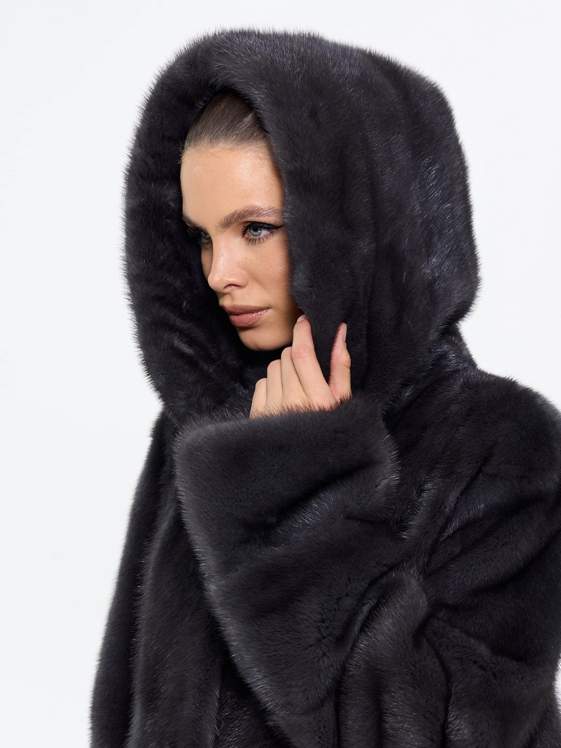 Товар длинная женская норковая шуба с капюшоном москвичка-132, черная, размер 52, артикул 65390 выполнен из мех норки с застежкой клипсы. Рассчитан на сезон: зима. Длина изделия 110 см, силуэт прямой.