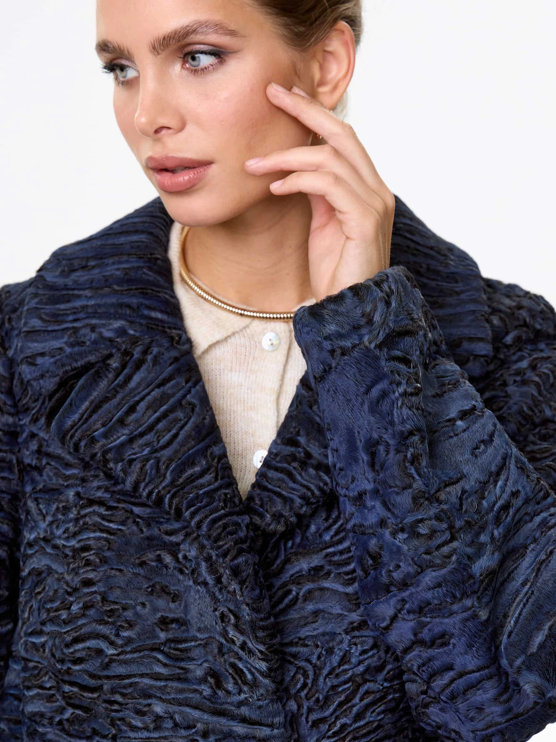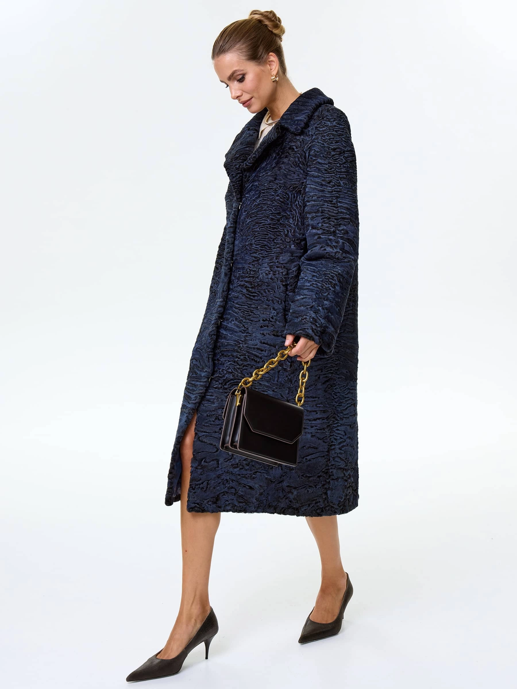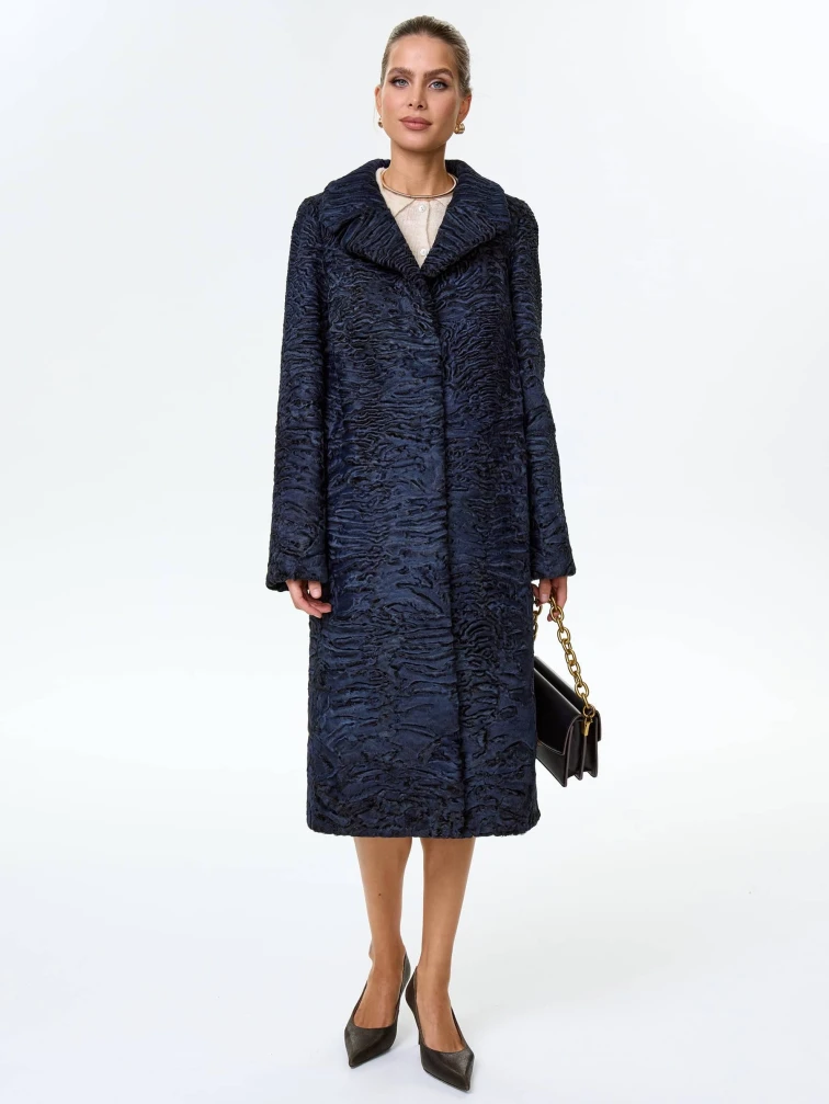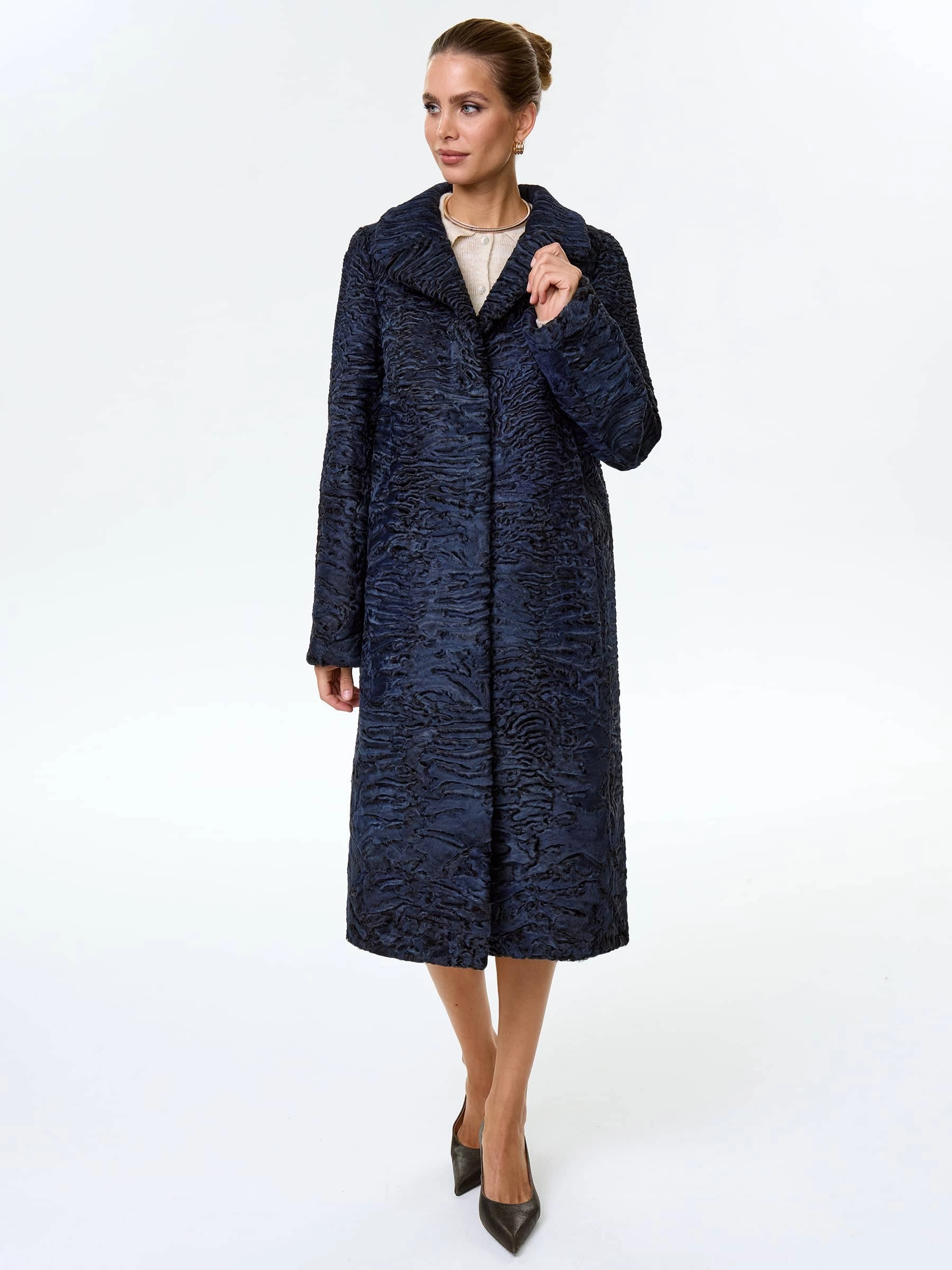 Товар длинная женская шуба из меха каракульчи премиум класса лола(ав), синяя, размер 48, артикул 34010 выполнен из каракульча с застежкой клипсы. Рассчитан на сезон: весна-осень. Длина изделия 118 см, силуэт прямой.