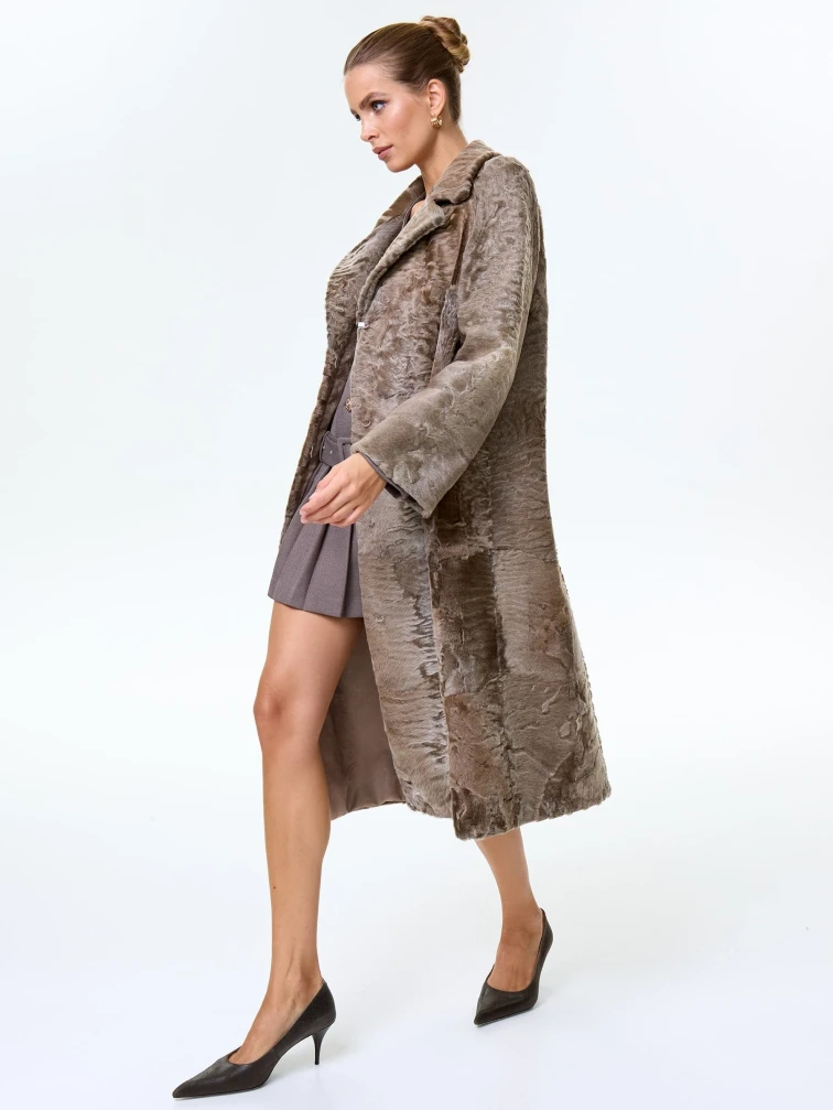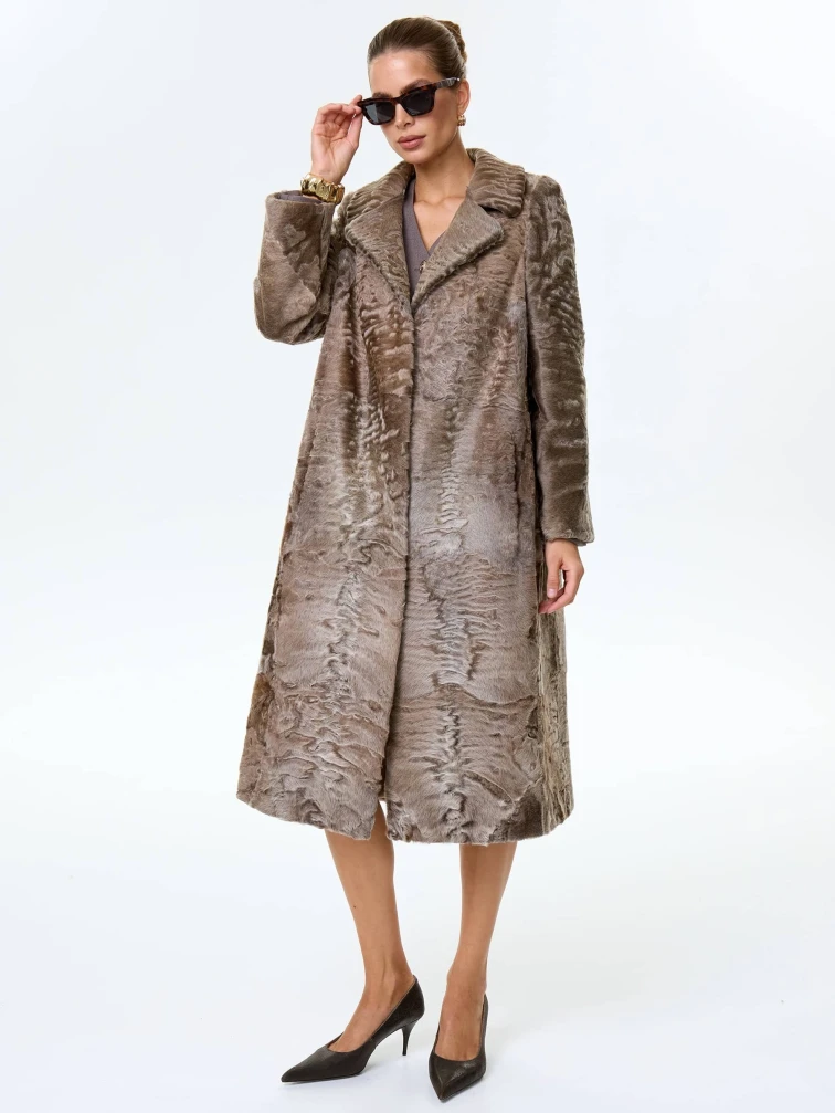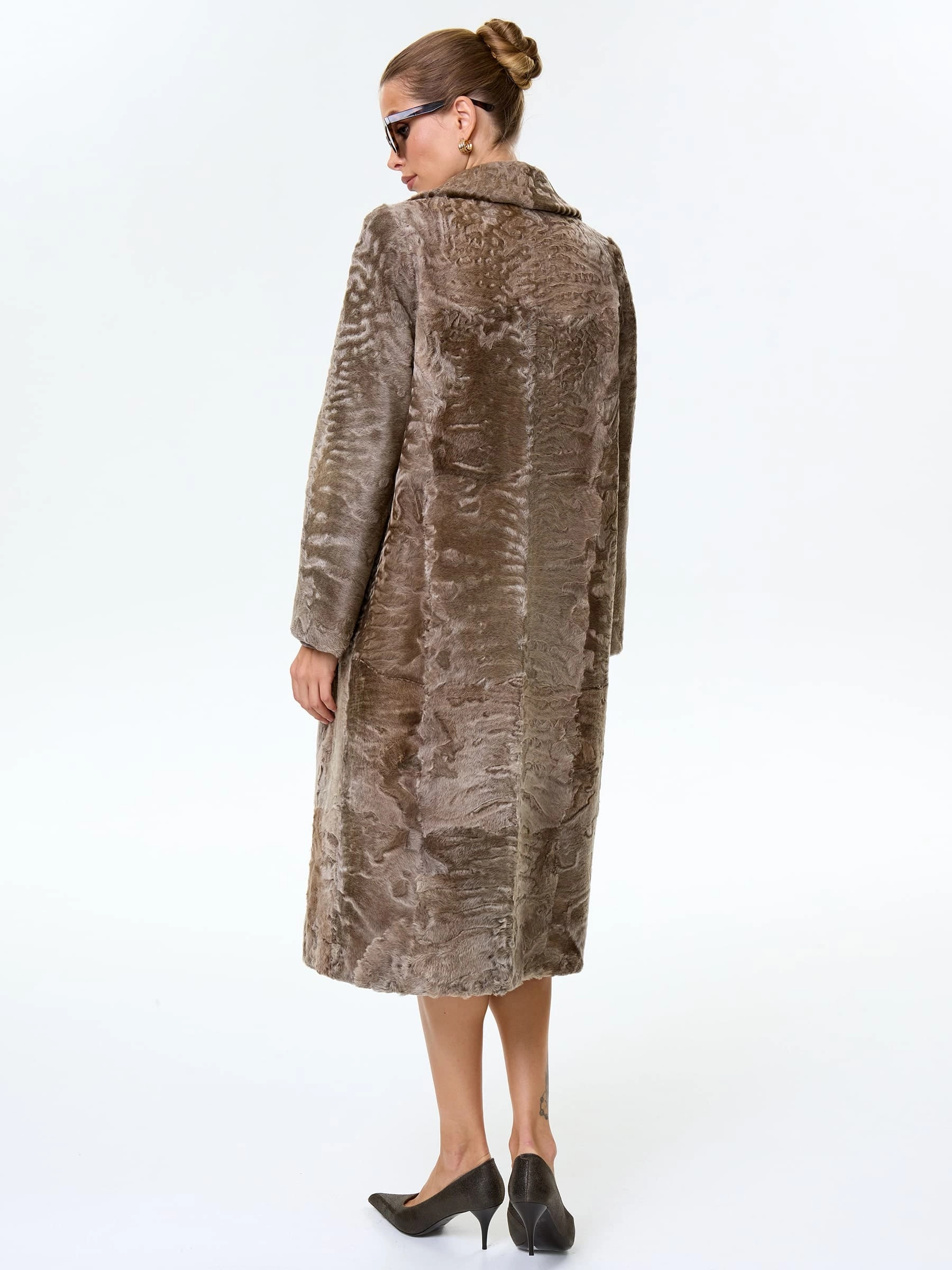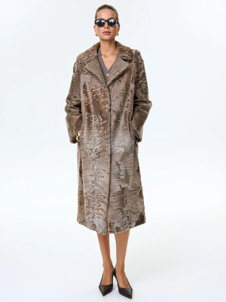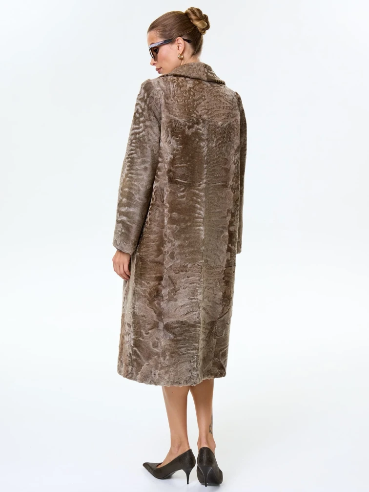 Товар длинная женская шуба из меха каракульчи премиум класса лола(ав), светло-коричневая, размер 50, артикул 33990 выполнен из каракульча с застежкой клипсы. Рассчитан на сезон: весна-осень. Длина изделия 118 см, силуэт прямой.
