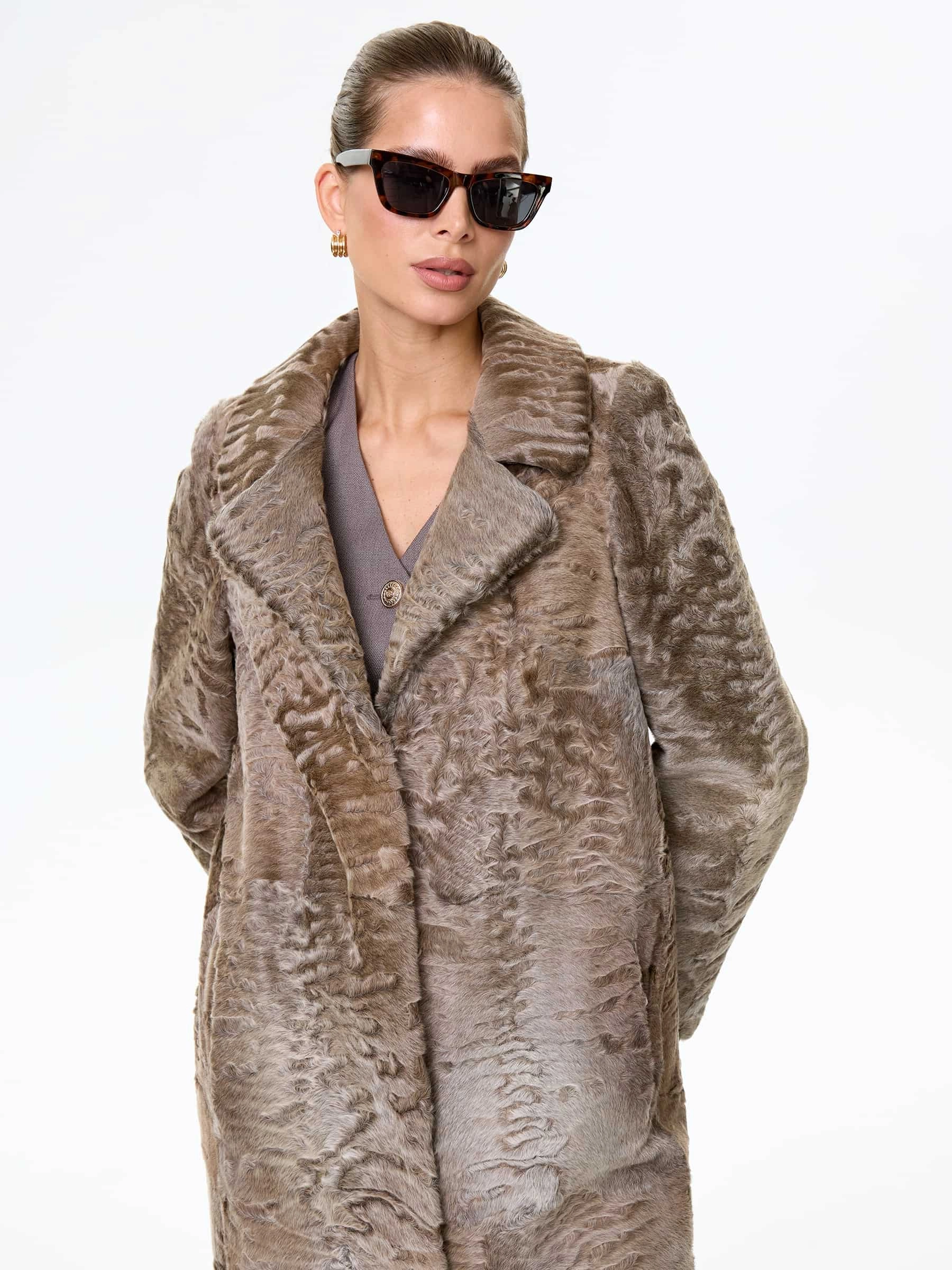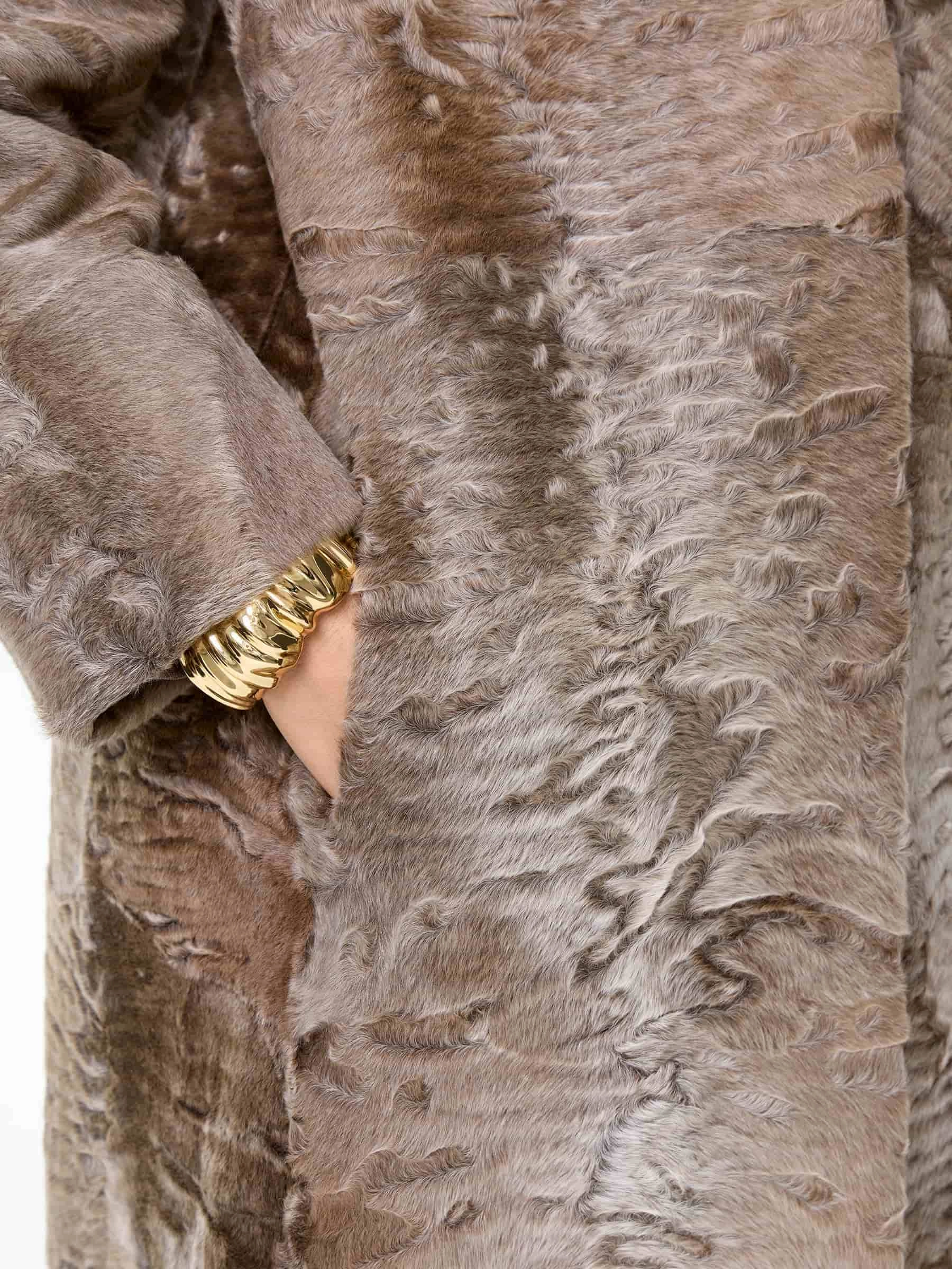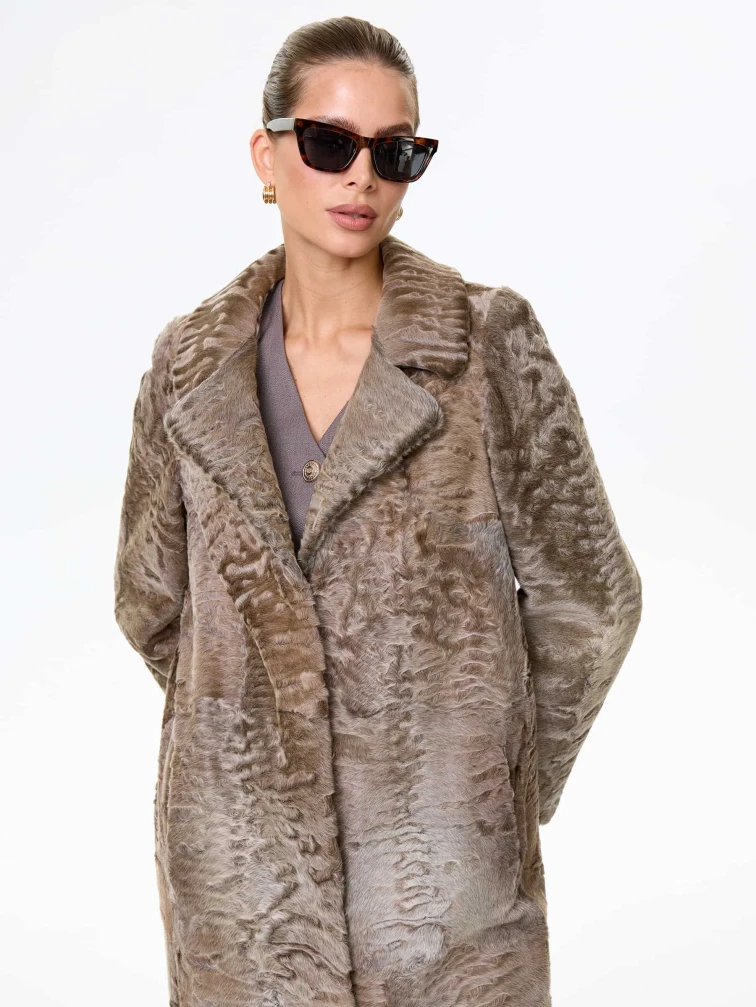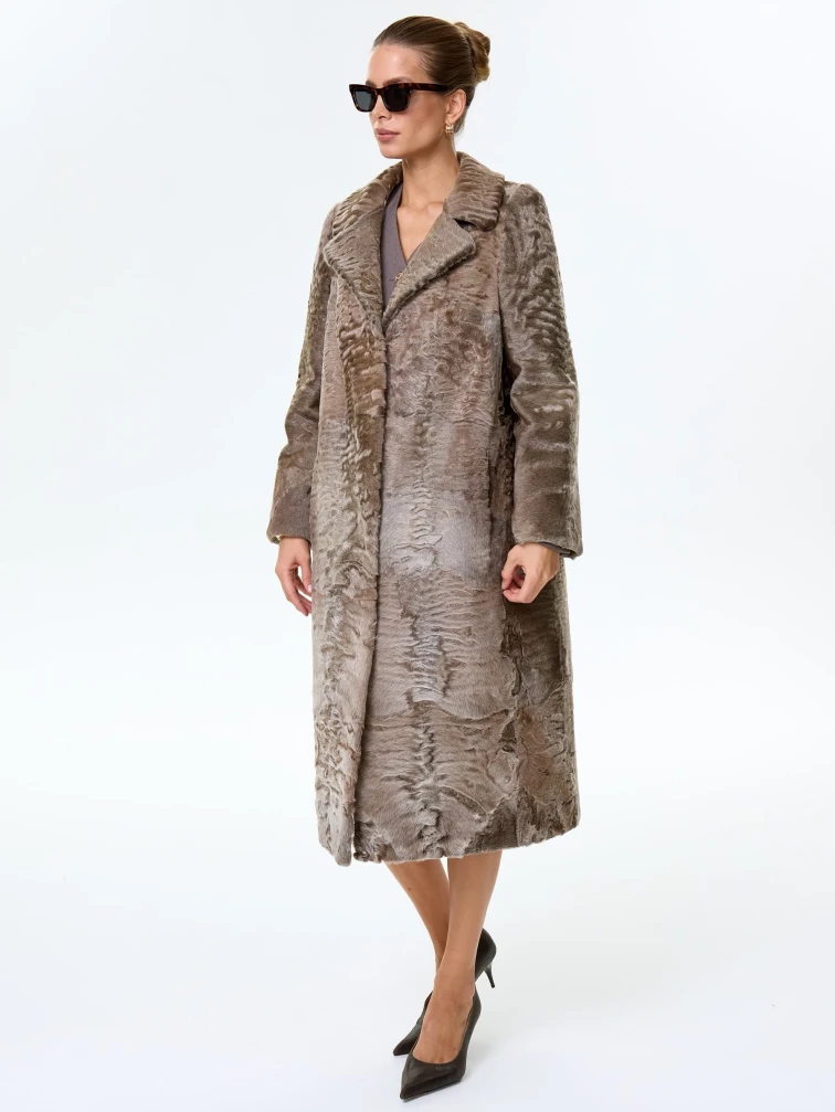 Товар длинная женская шуба из меха каракульчи премиум класса лола(ав), светло-коричневая, размер 50, артикул 33990 выполнен из каракульча с застежкой клипсы. Рассчитан на сезон: весна-осень. Длина изделия 118 см, силуэт прямой.