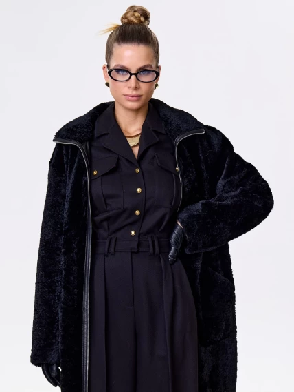 Товар длинное женское пальто из натуральной овчины астрагана премиум класса 2060, черное, размер 44, артикул 64320 выполнен из овчина "мерино" с застежкой молния. Рассчитан на сезон: осень-зима. Длина изделия 117 см, силуэт прямой.