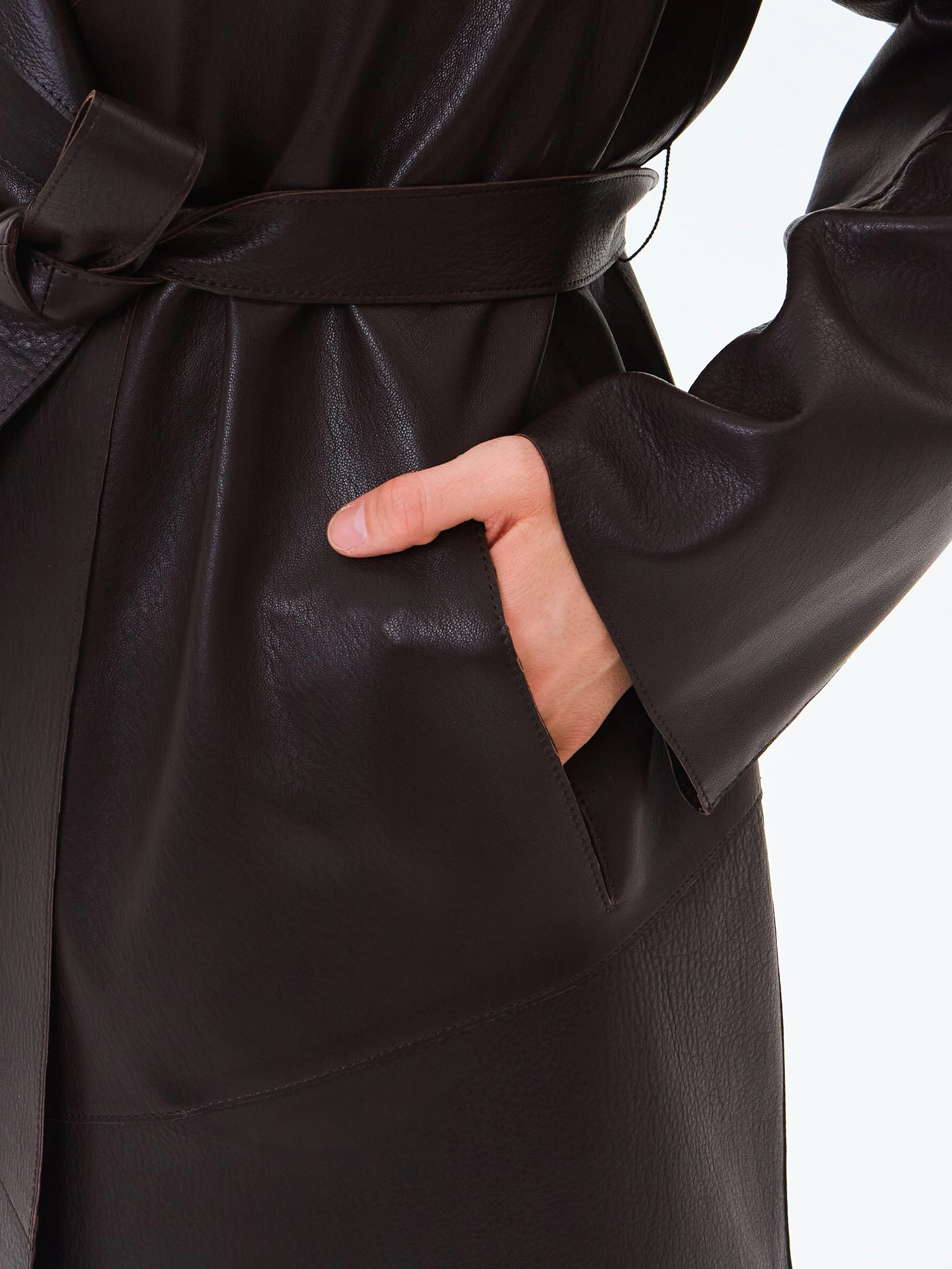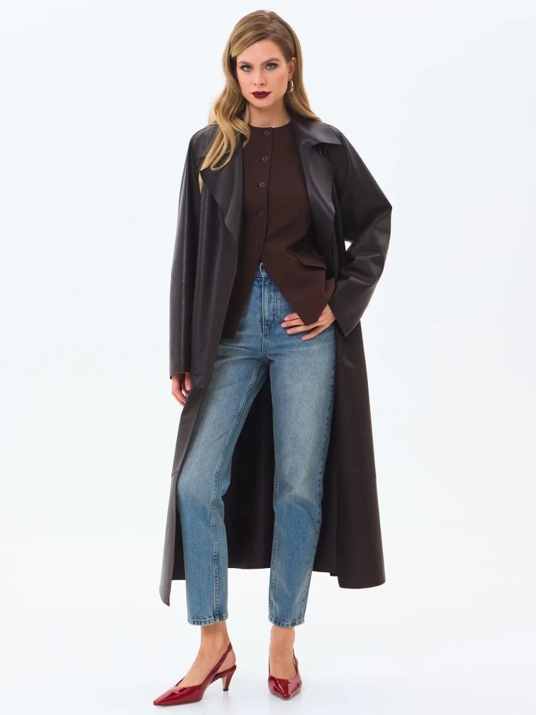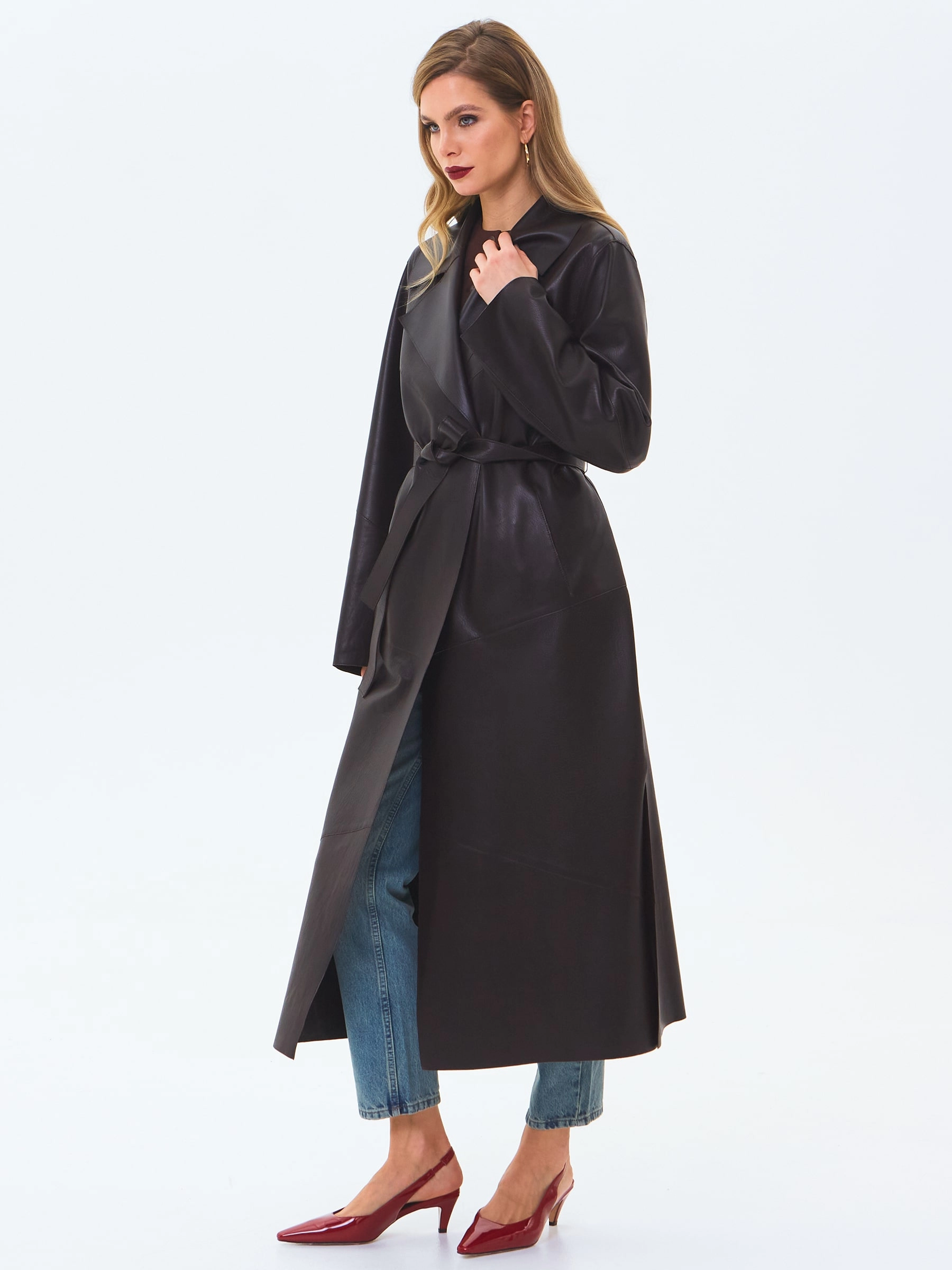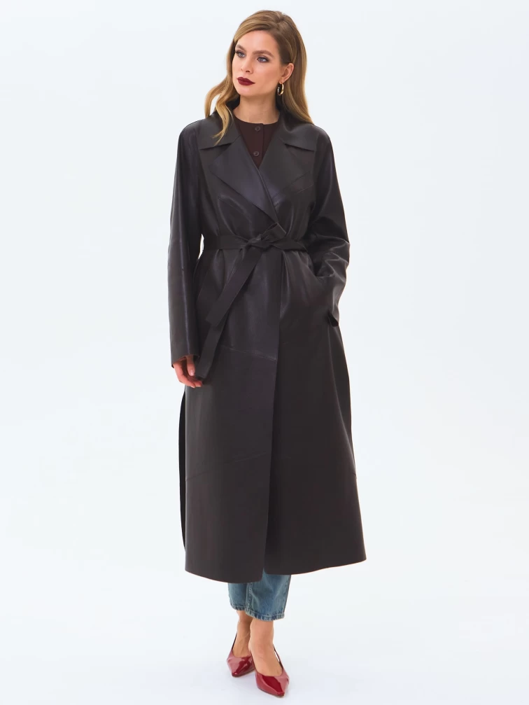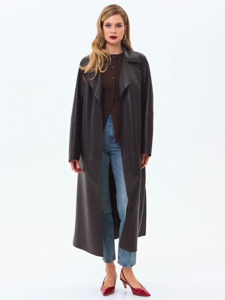 Длинный женский кожаный плащ премиум класса 3081, коричневый, размер 50, артикул 24660
