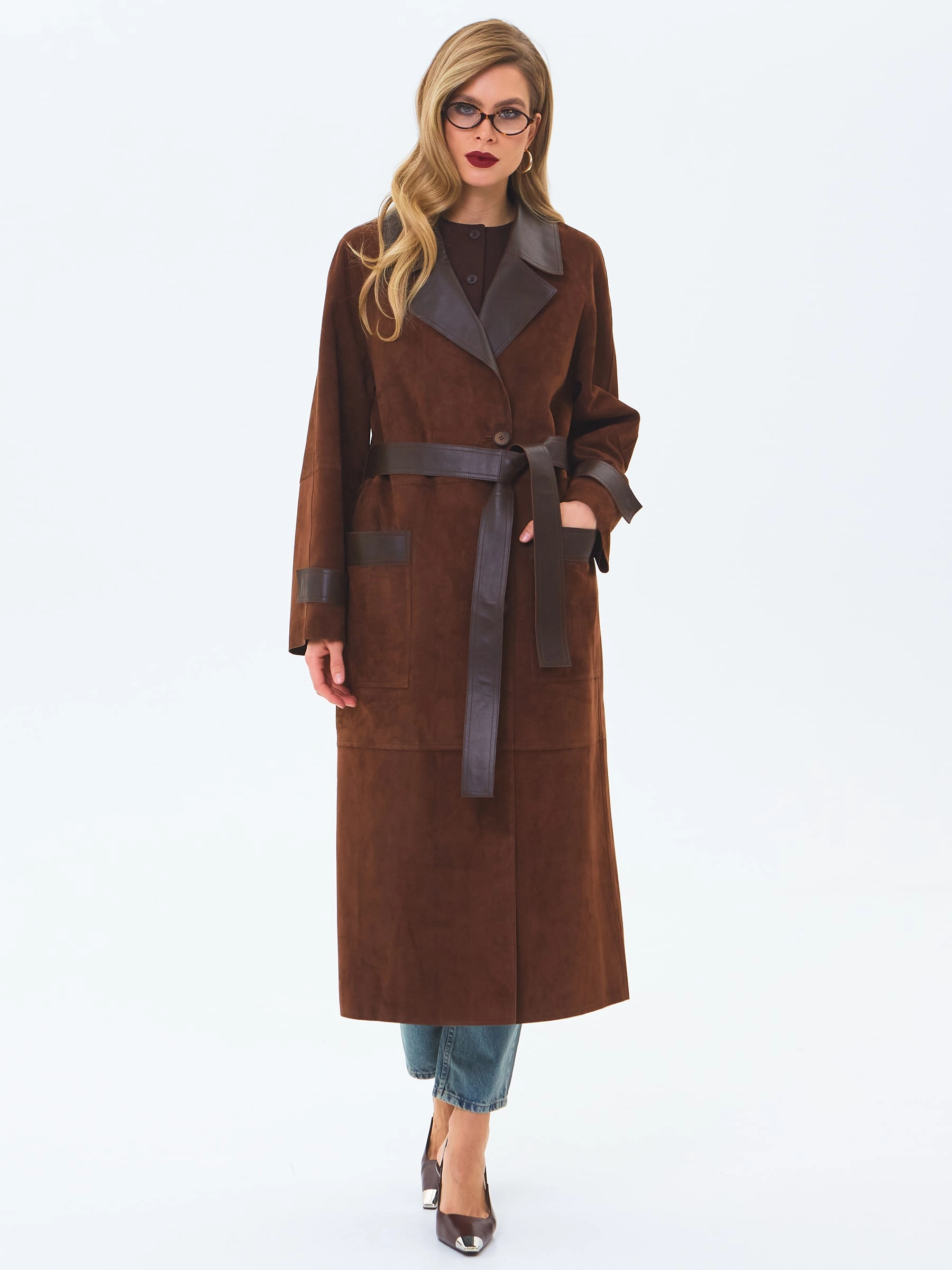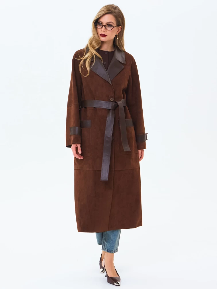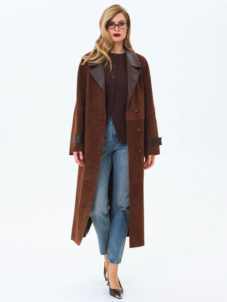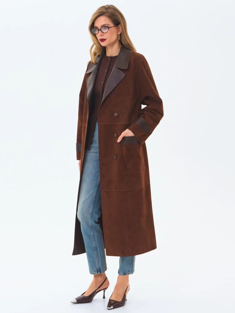 Для пошива длинного классического плаща с накладными карманами использовали тонкую пластичную замшу премиум класса. Изделие прямого силуэта без подклада дополнили английским воротником, патами на рукавах в гладкой кожи. Чтобы модель не сковывала шаг, сзади предусмотрели шлицу. Дополнительно обозначить талию поможет широкий пояс. Застежка-пуговицы.