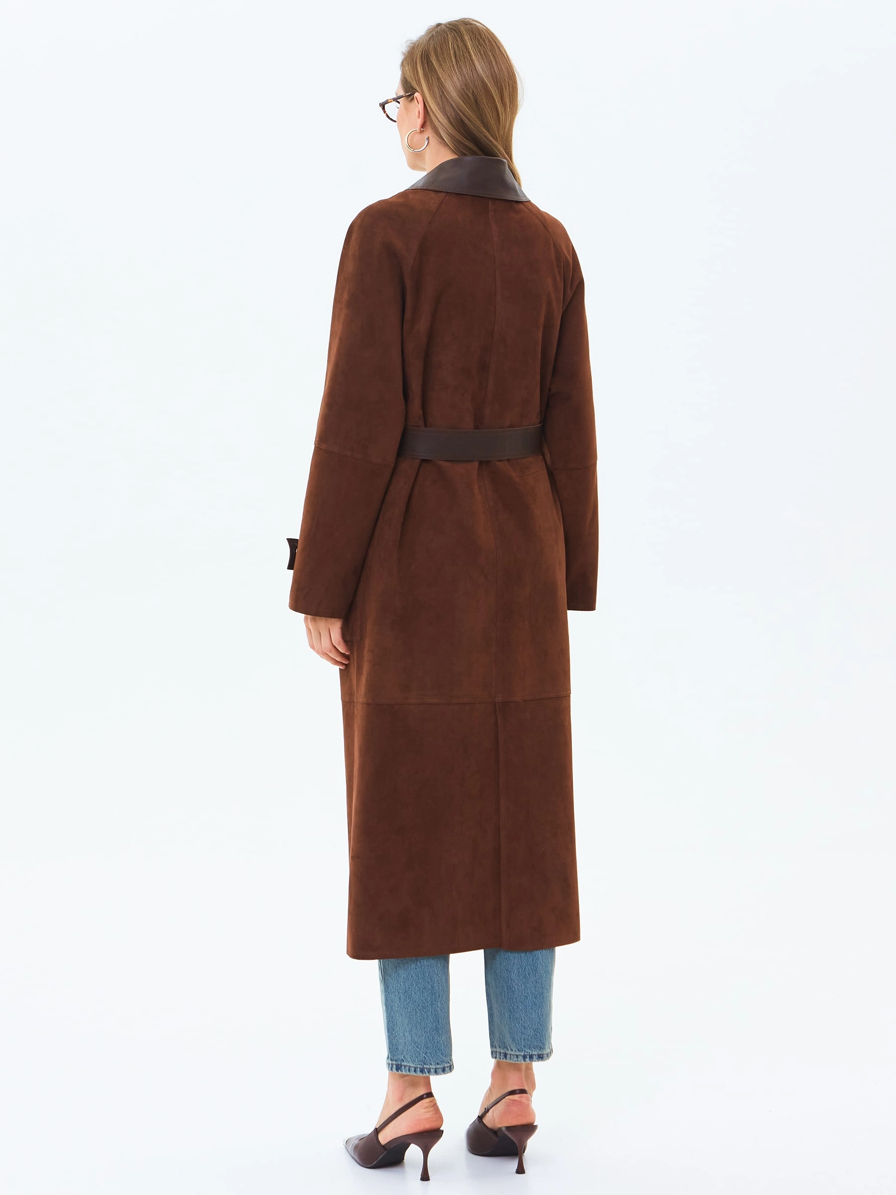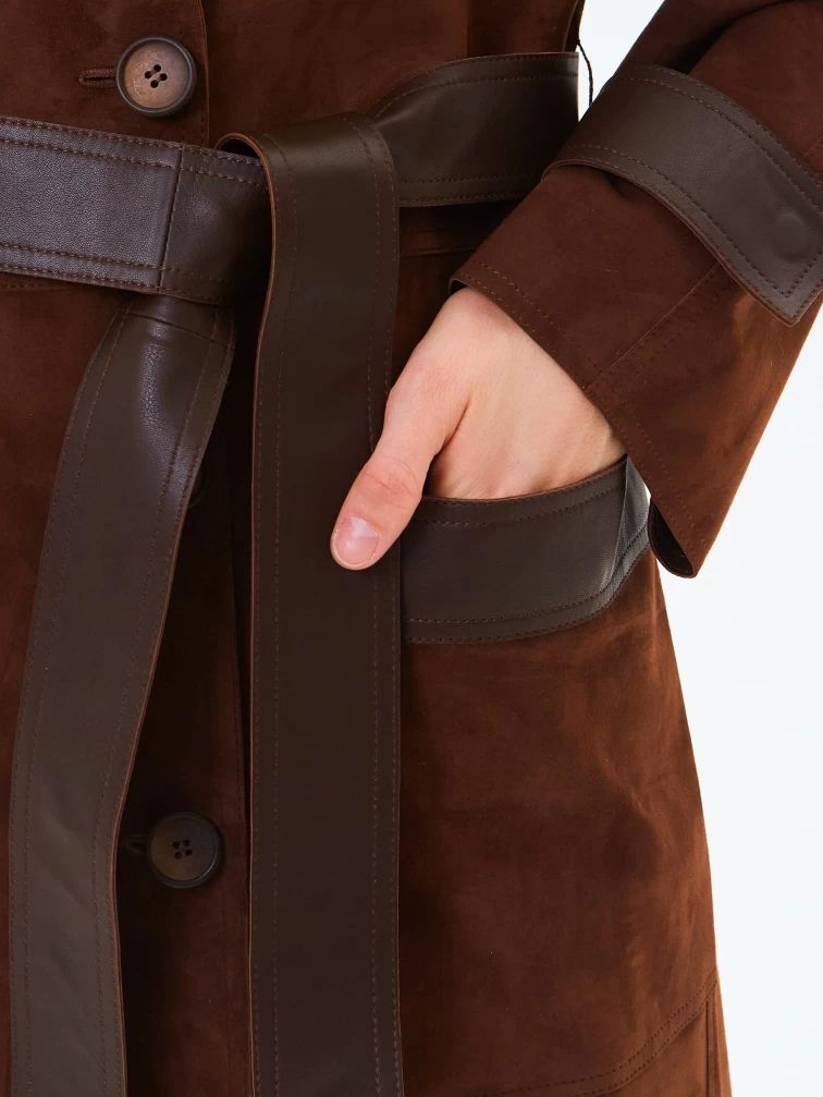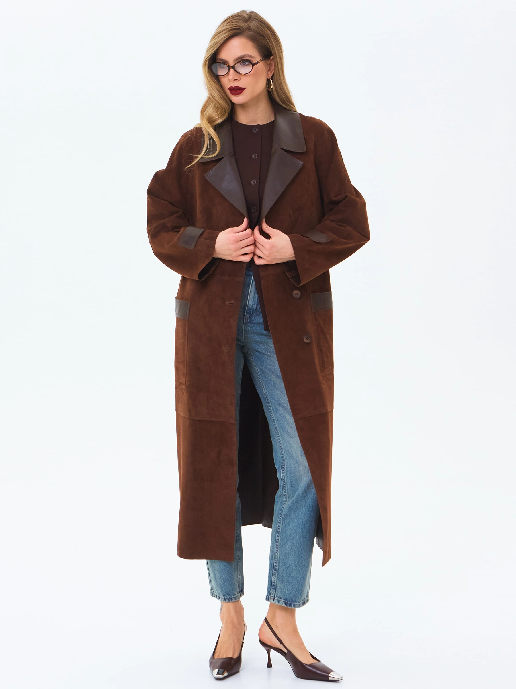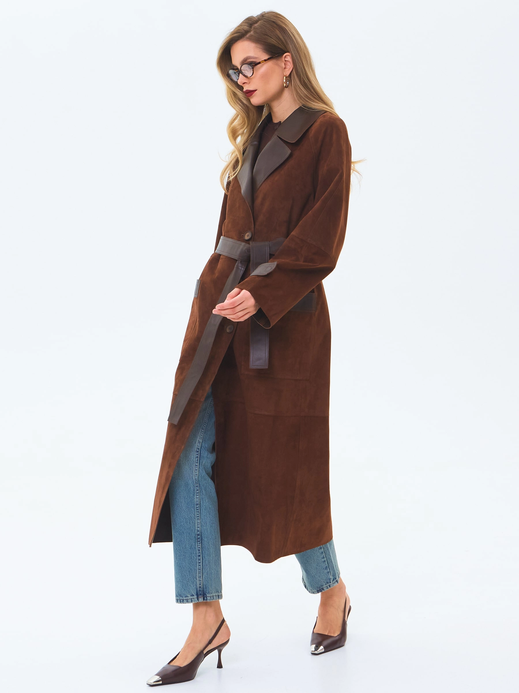 Для пошива длинного классического плаща с накладными карманами использовали тонкую пластичную замшу премиум класса. Изделие прямого силуэта без подклада дополнили английским воротником, патами на рукавах в гладкой кожи. Чтобы модель не сковывала шаг, сзади предусмотрели шлицу. Дополнительно обозначить талию поможет широкий пояс. Застежка-пуговицы.