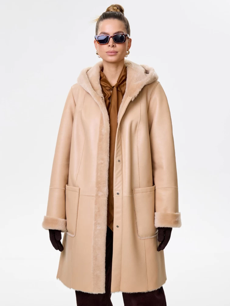 Женская классическая дубленка с капюшоном премиум класса 2004, бежевая, размер 54, артикул 62840