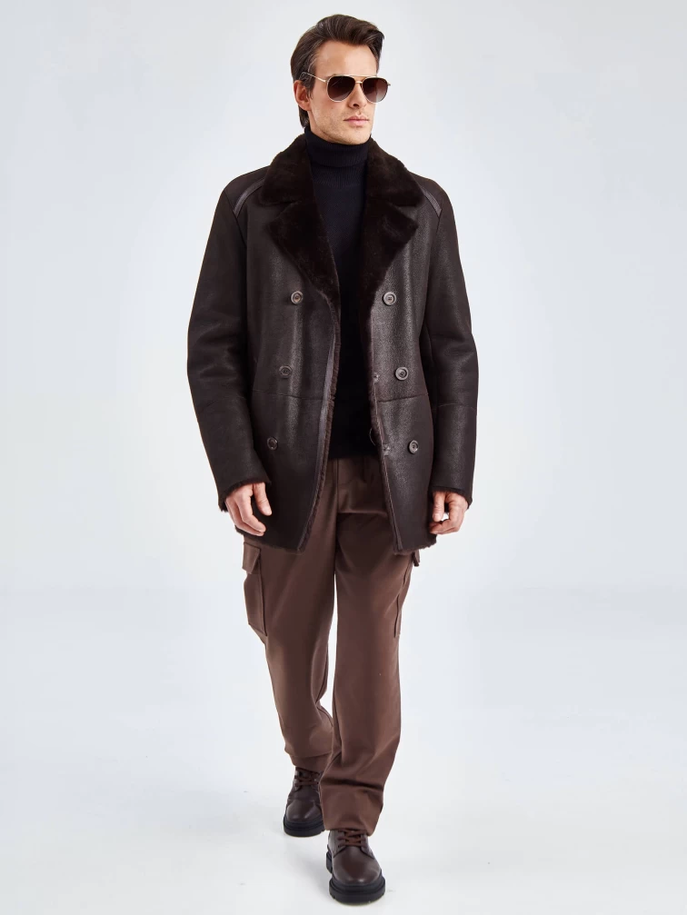 Стильная двубортная мужская дублёнка. Мериносная овчина высшего качества. Максимально густой мех прекрасно защитит от любого мороза. Новейшее устойчивое защитное покрытие. Английский воротник. Длина рукавов регулируется отворотом манжет. Чёткая, выверенная посадка по фигуре. Безупречная работа наших портных.