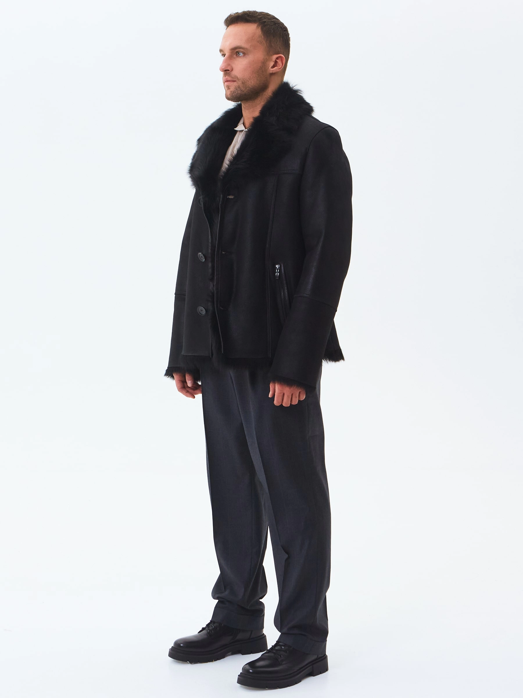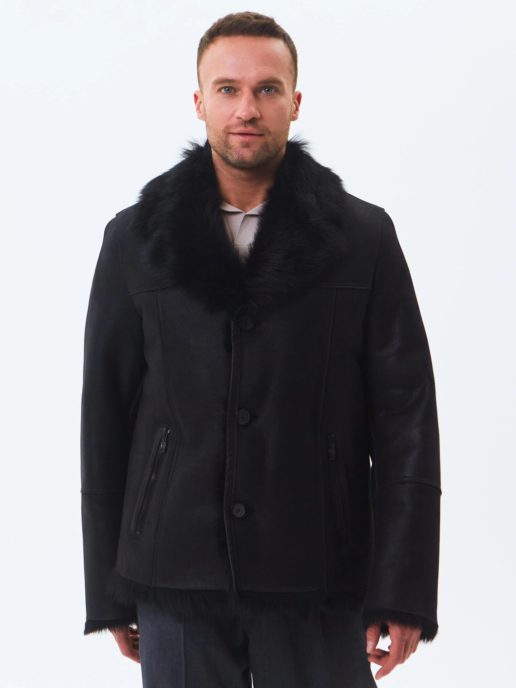 Стильная мужская дублёнка. Тосканская овчина высшего качества. Максимально густой, высокий мех прекрасно защитит от любого мороза. Новейшее устойчивое защитное покрытие. Английский воротник. Длина рукавов регулируется отворотом манжет. Чёткая, выверенная посадка по фигуре. Безупречная работа наших портных.