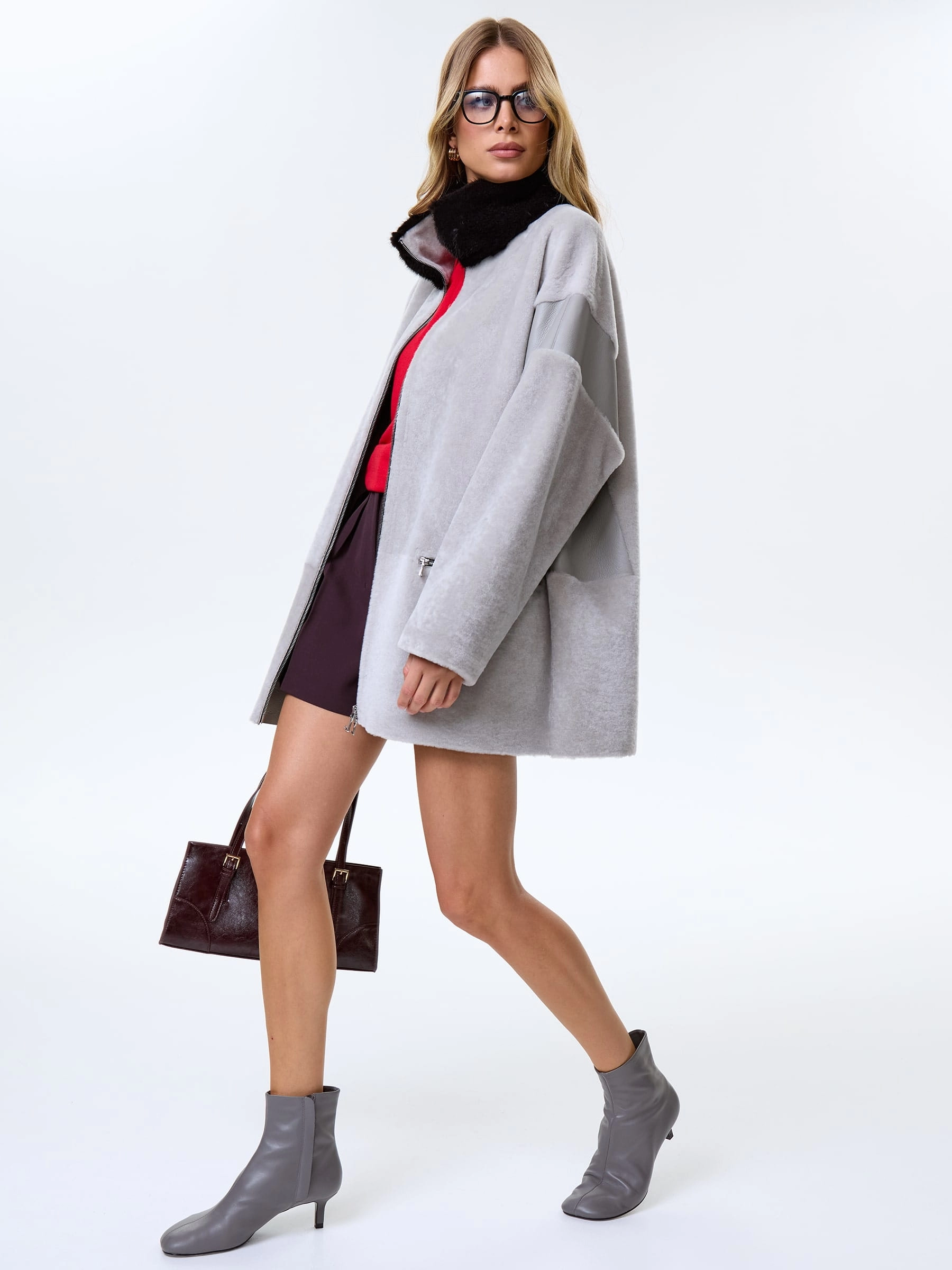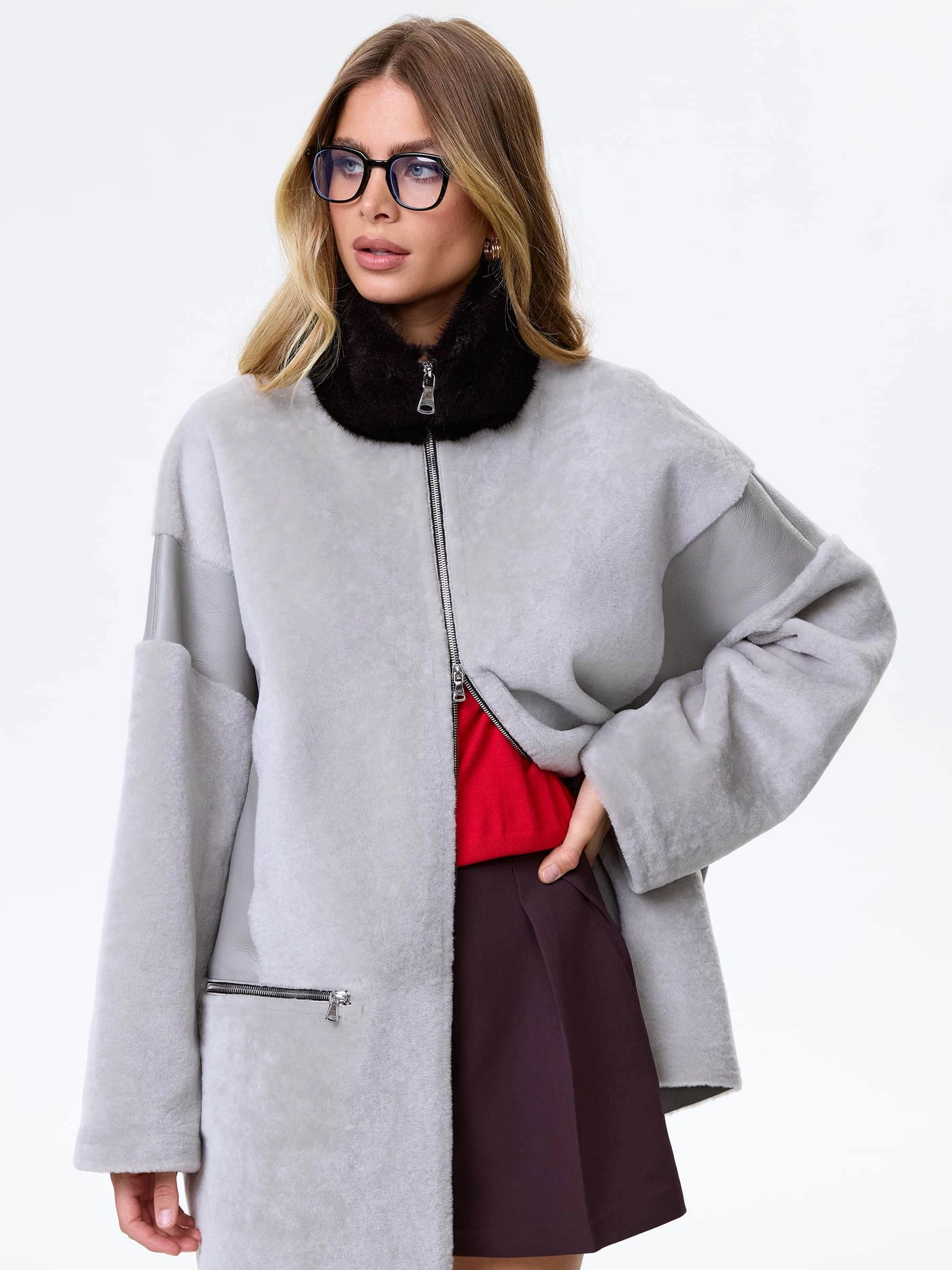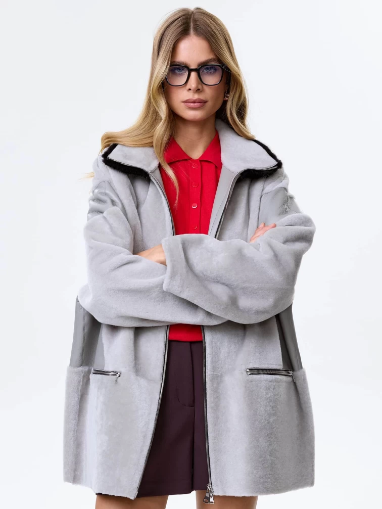 Товар дубленка на молнии с норковым воротником для женщин премиум класса 2057, серая, размер 44, артикул 64480 выполнен из овчина "мерино" с застежкой молния. Рассчитан на сезон: осень-зима. Длина изделия 77 см, силуэт свободный.