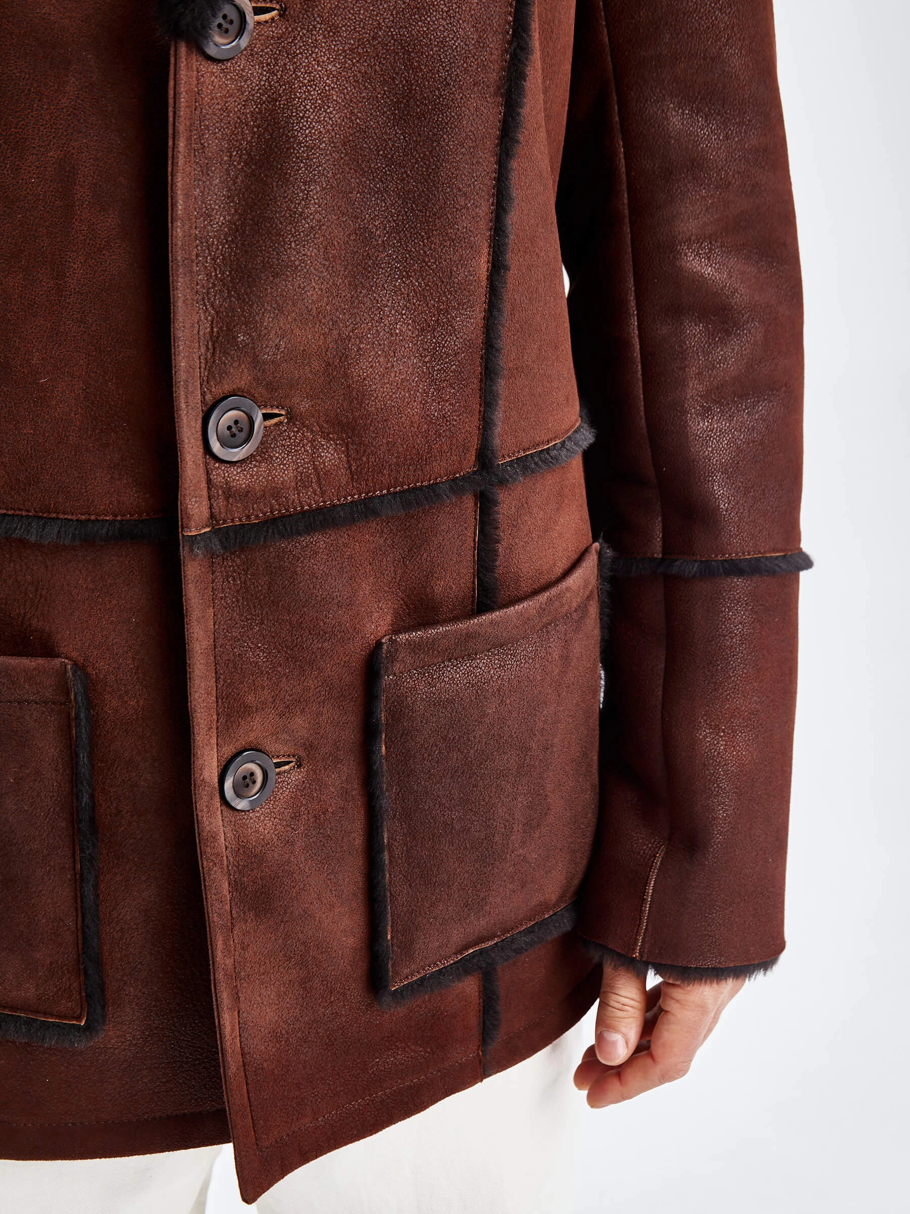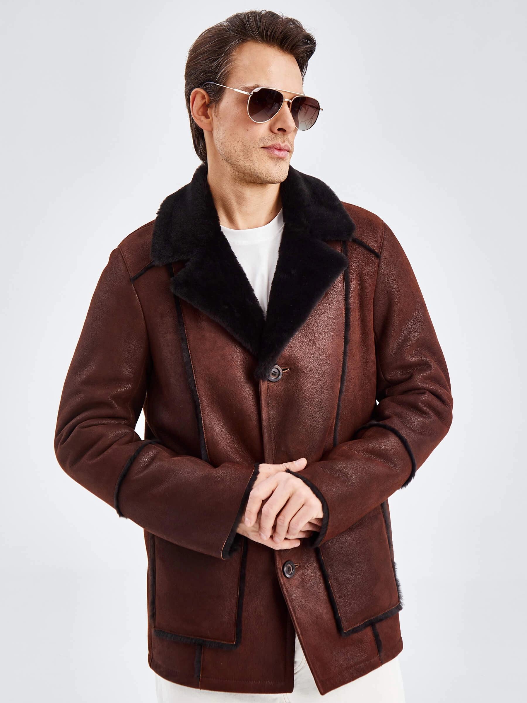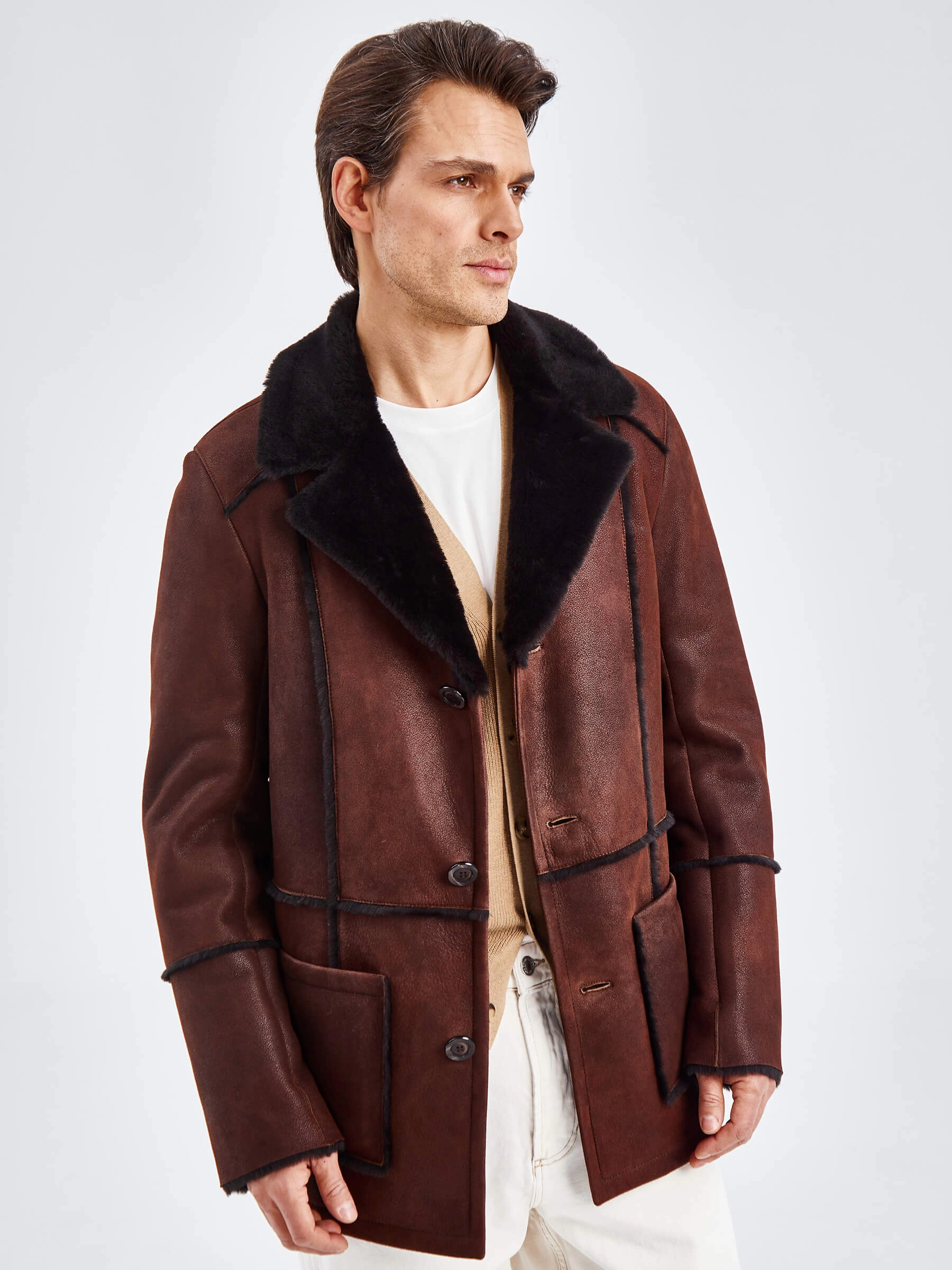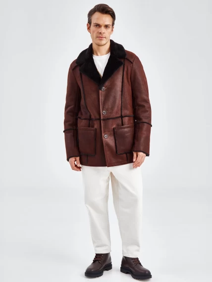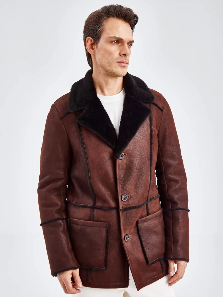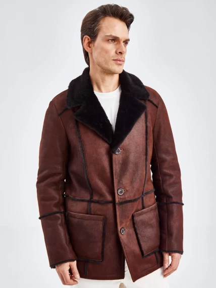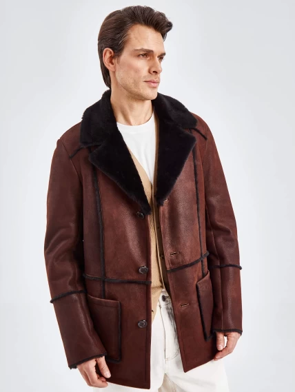 Товар дубленка пиджак с выпущенным мехом для мужчин премиум класса 434, виски, размер 54, артикул 71440 выполнен из овчина "мерино" с застежкой пуговицы. Рассчитан на сезон: осень-зима. Длина изделия 81 см, силуэт прямой.