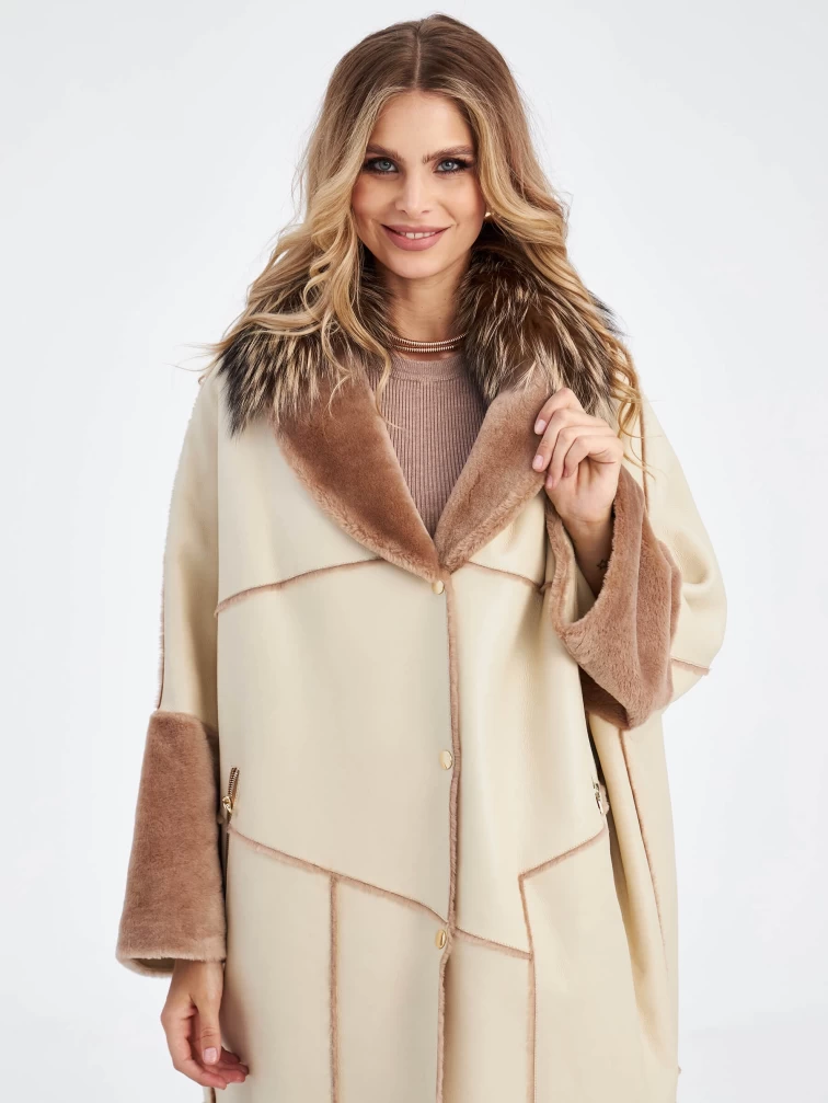 Товар стильная женская дубленка оверсайз с воротником лисицы премиум класса 2046, бежевая, размер 44, артикул 63180 выполнен из овчина "мерино" с застежкой молния. Рассчитан на сезон: осень-зима. Длина изделия 110 см, силуэт прямой.