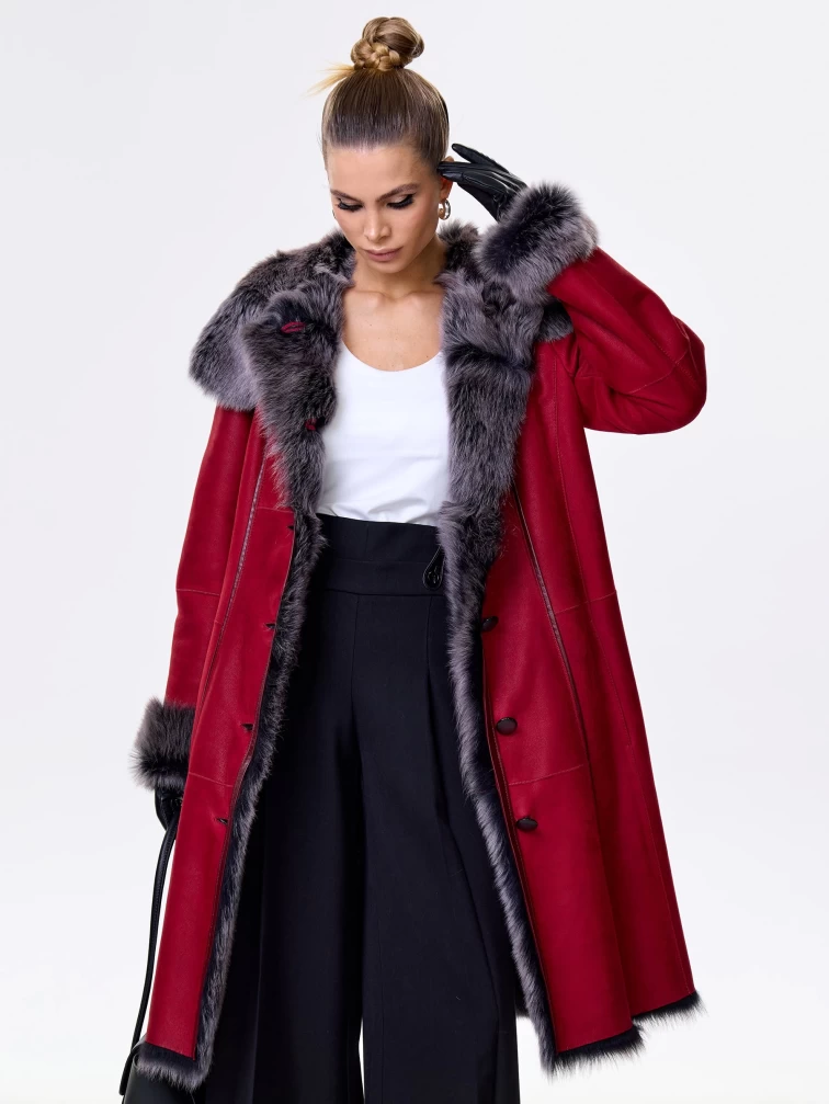 Длинная женская дубленка из тосканы с капюшоном 123нк, красная, размер 50, артикул 61903
