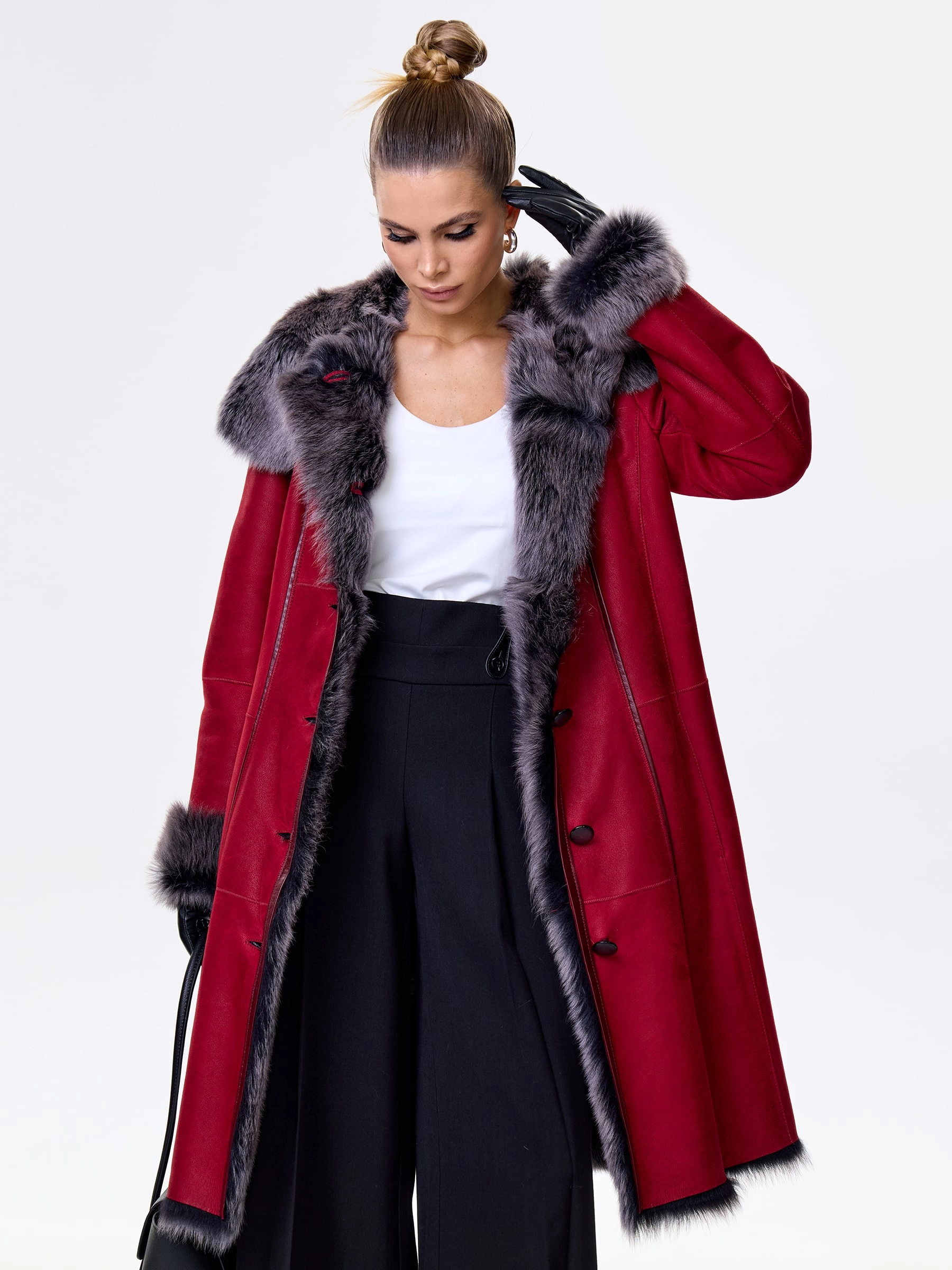 Длинная дублёнка с капюшоном из тосканской овчины. Роскошная полуприлегающая модель премиум-класса: густой нежнейший мех глубокого оттенк подарит королевское тепло даже в лютый мороз, а объёмный капюшон создаст уютный кокон от непогоды или элегантно ниспадет на плечи. Защитное покрытие убережёт от царапин, а идеальная посадка по фигуре, боковые карманы и длинный пояс подчеркнут силуэт — сочетайте с чёрными джинсами, вязаными платьями или кожаными брюками для безупречного зимнего образа! Преимущество: короткая длина, полуприлегающий крой - это мобильность для города и элегантность для вечера.