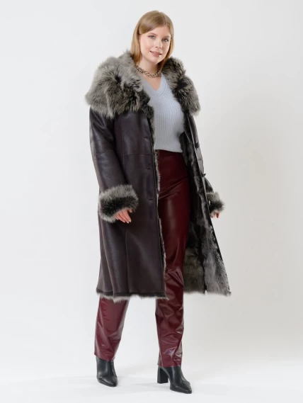 Женская длинная дубленка из тосканы с капюшоном 131, коричневая, размер 44, артикул 14290