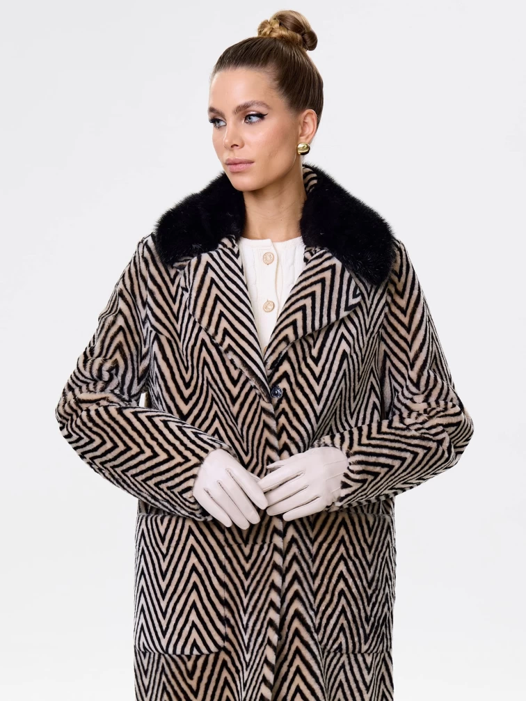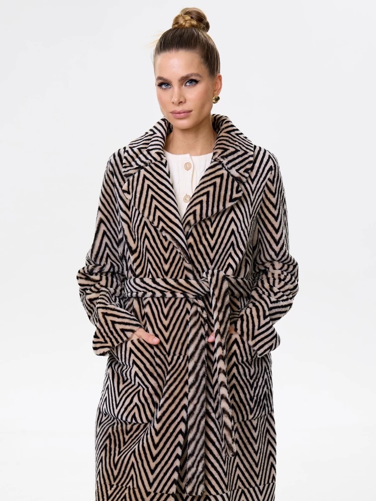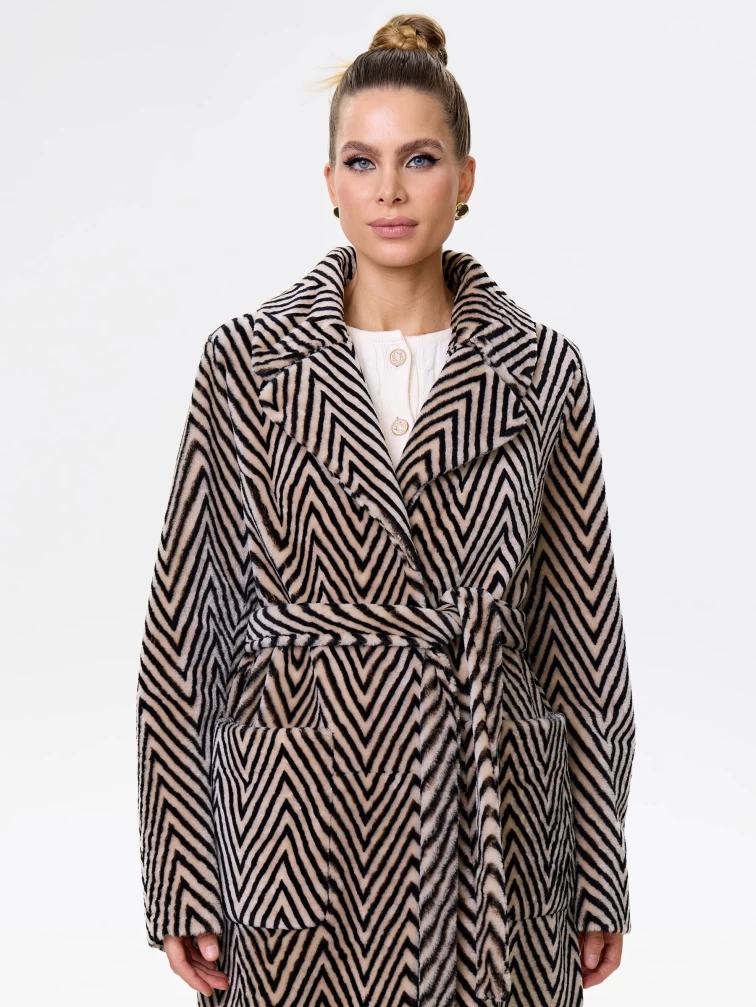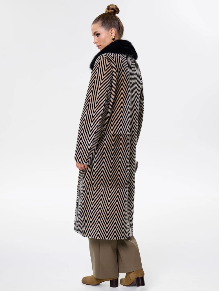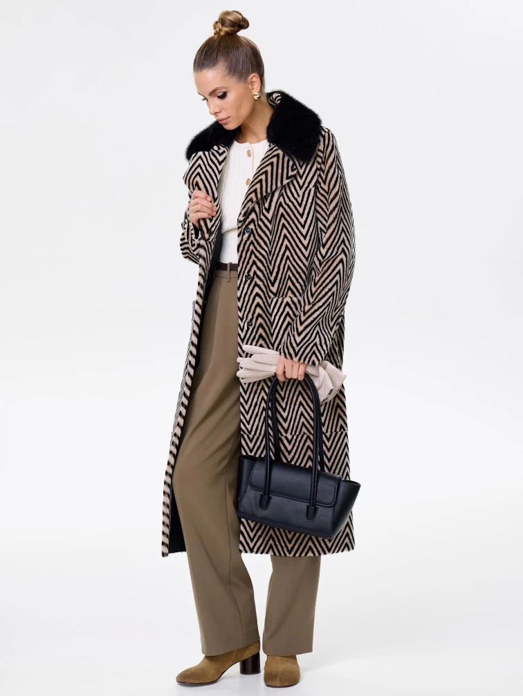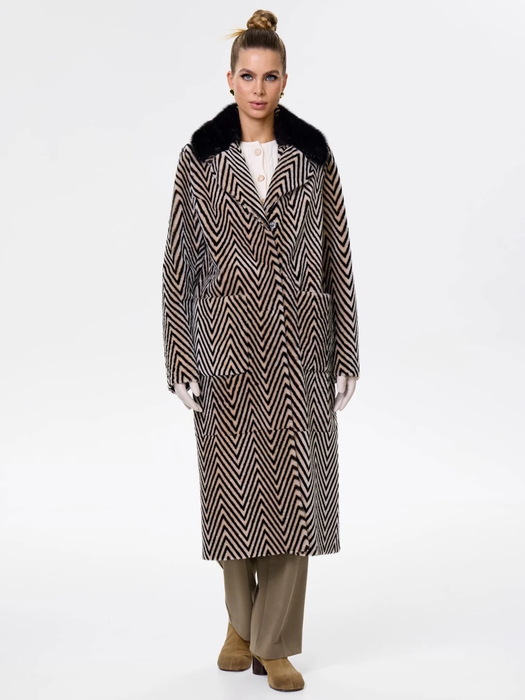 Роскошная двусторонняя дублёнка премиум-класса длиной 119 см: принтованный мех астрагана, то есть ягнёнка, с одной стороны и благородное бронзовое металлизированное покрытие — с другой. Свободный силуэт со съёмным английским воротником из густого чёрного меха норки и удобной застёжкой на кнопках создаёт образ исключительной элегантности. Два накладных кармана и длинный пояс подчёркивают дизайн. Совет стилиста: носите со стороной из астрагана и меховым воротником с платьем-миди и сапогами для вечера или со стороной-металлик без воротника с водолазкой, кожаными брюками и ботинками для дерзкого повседневного лука — максимальная универсальность в одной вещи.