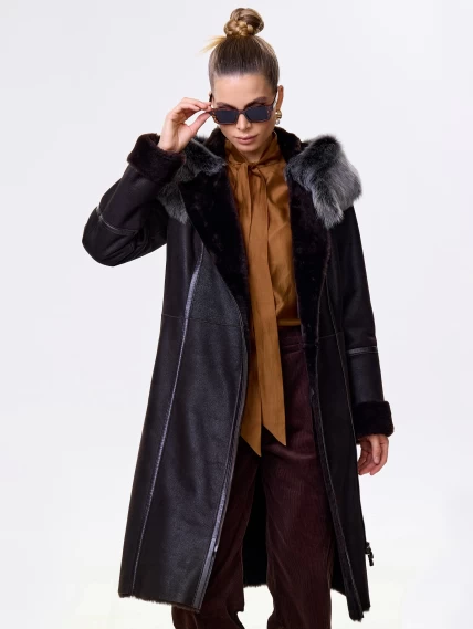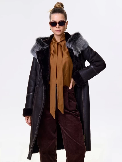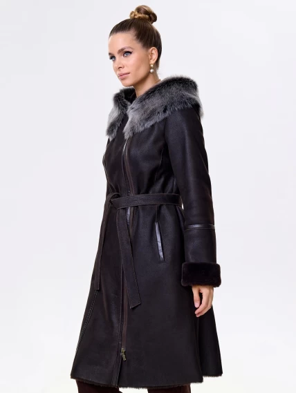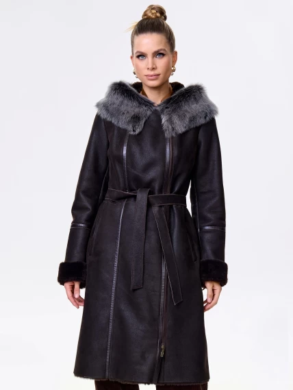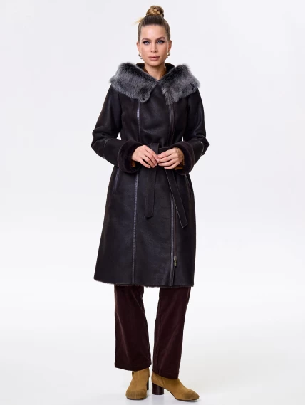 Женская дубленка с капюшоном из тосканы на молнии 265, коричневая, размер 42, артикул 61540