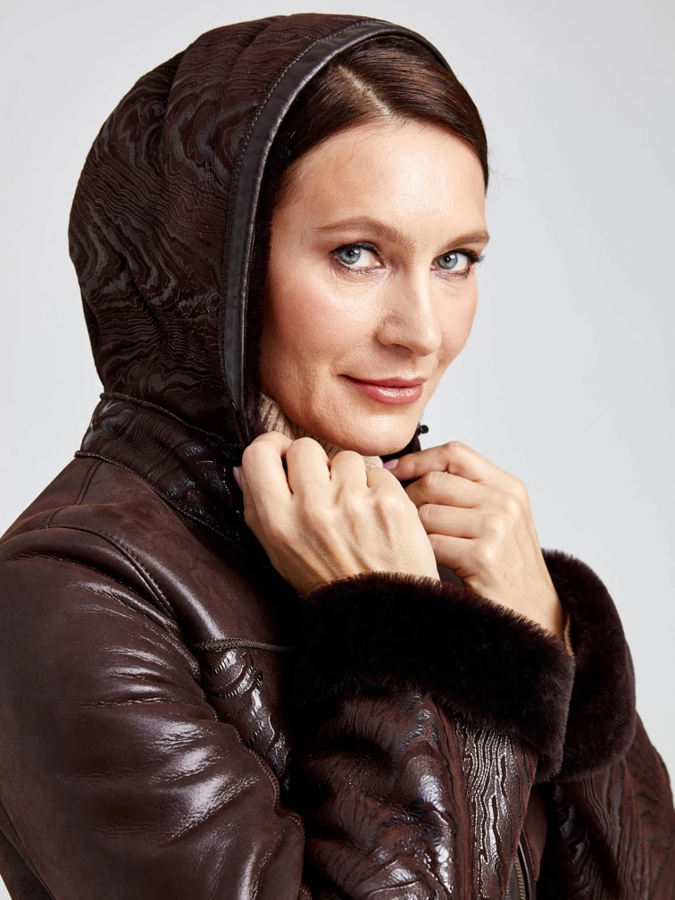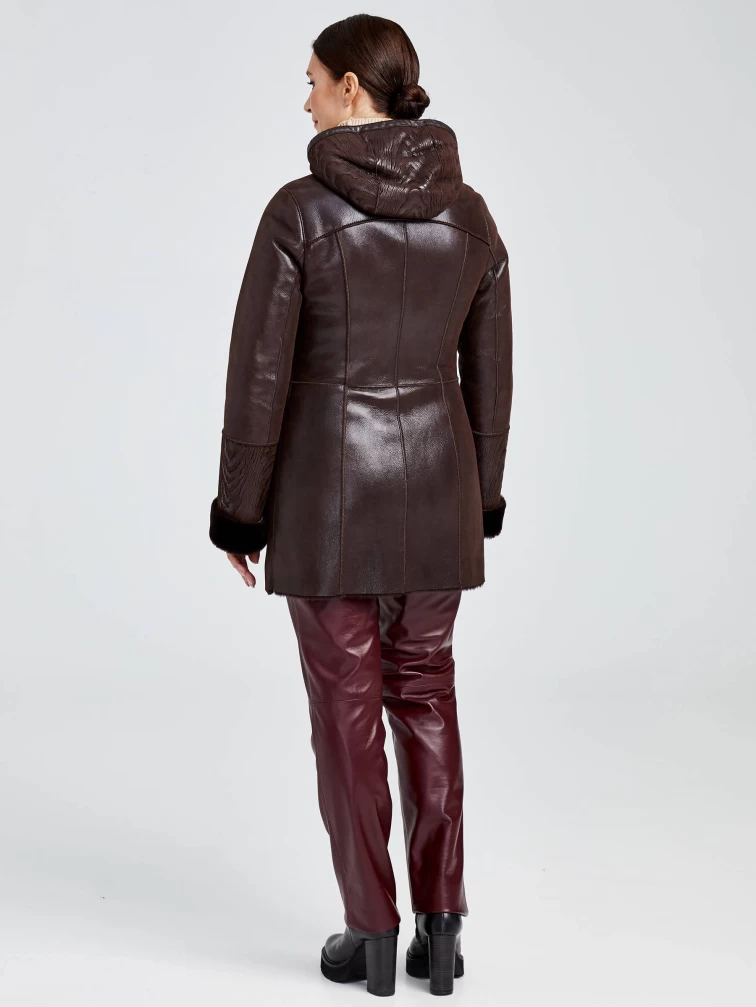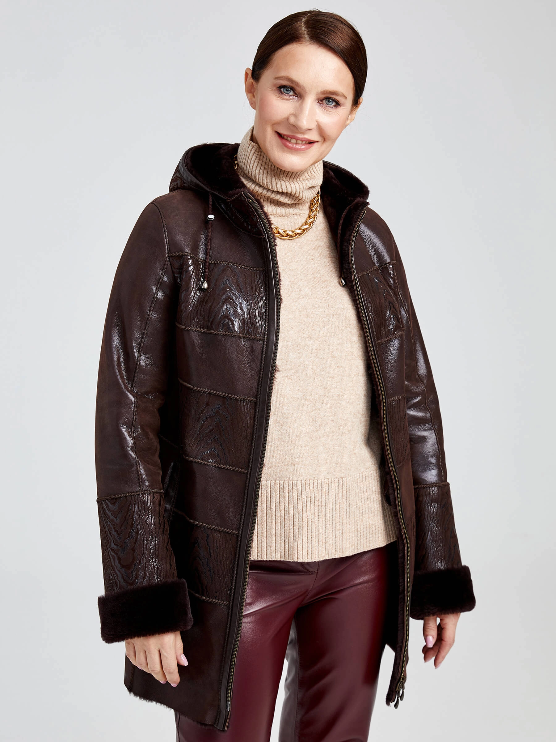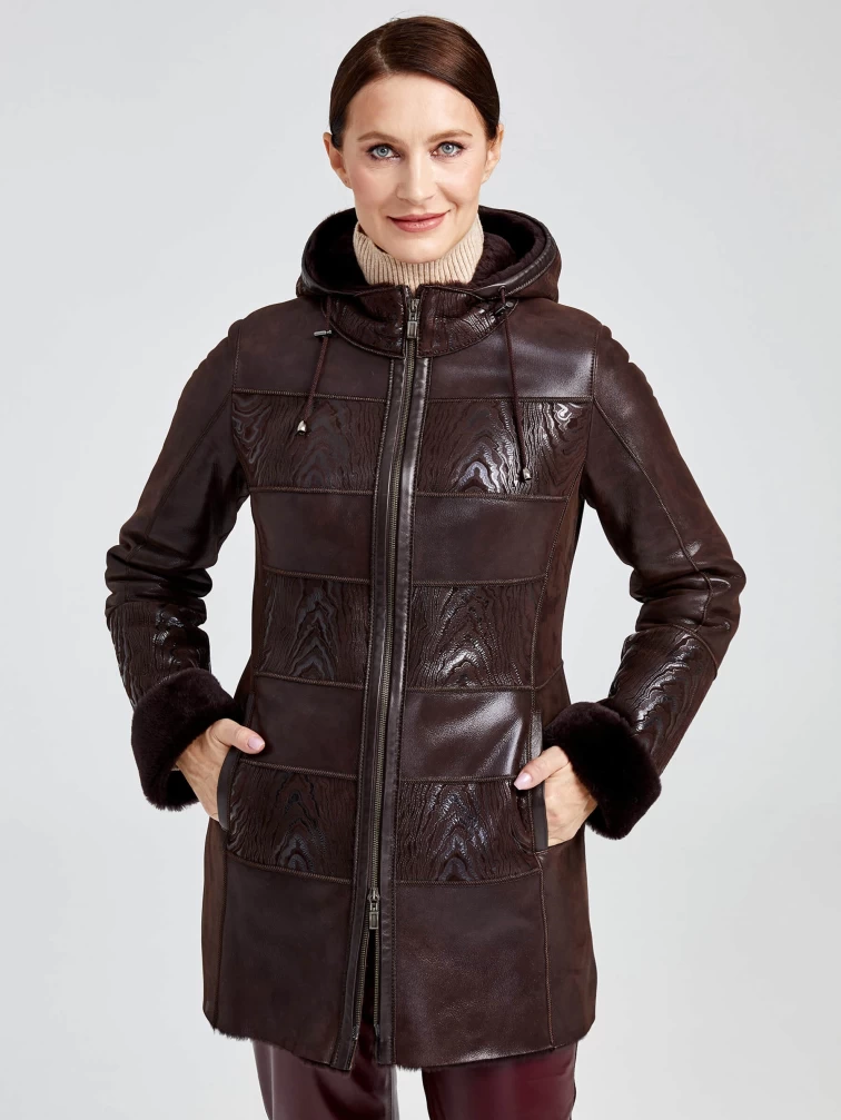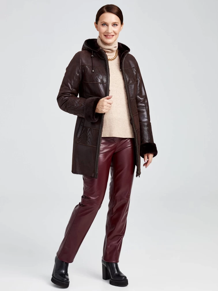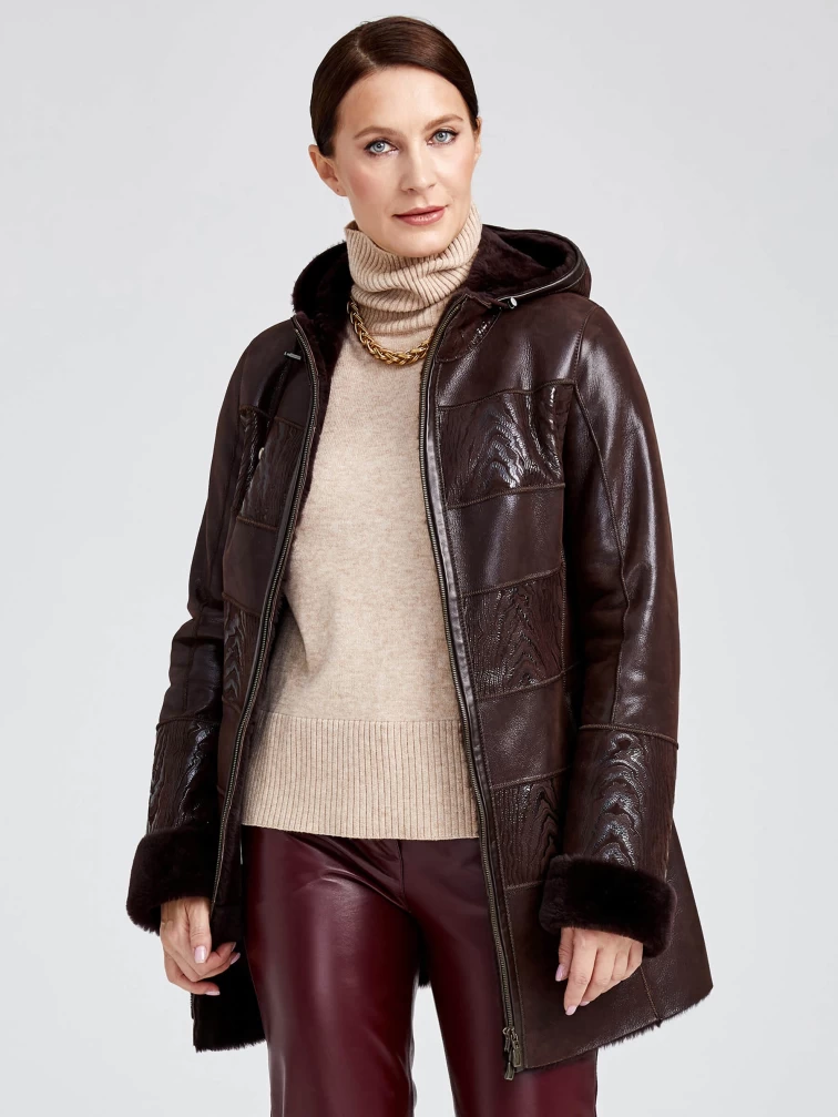 Товар короткая женская комбинированная дубленка с капюшоном 268, коричневая, размер 42, артикул 62360 выполнен из овчина "мерино" с застежкой молния. Рассчитан на сезон: осень-зима. Длина изделия 77 см, силуэт полуприлегающий.
