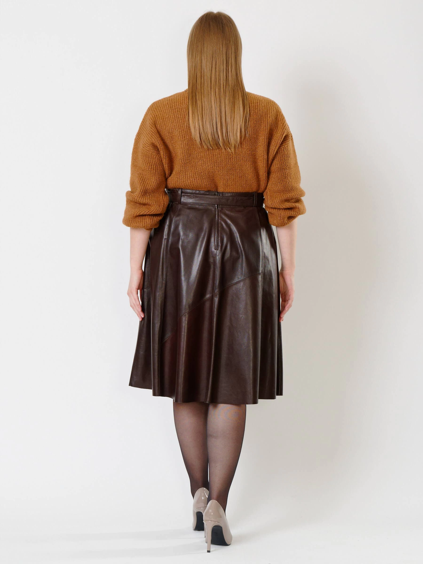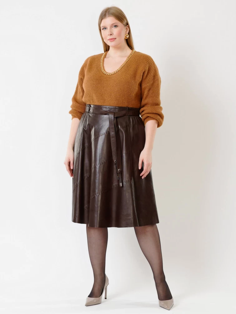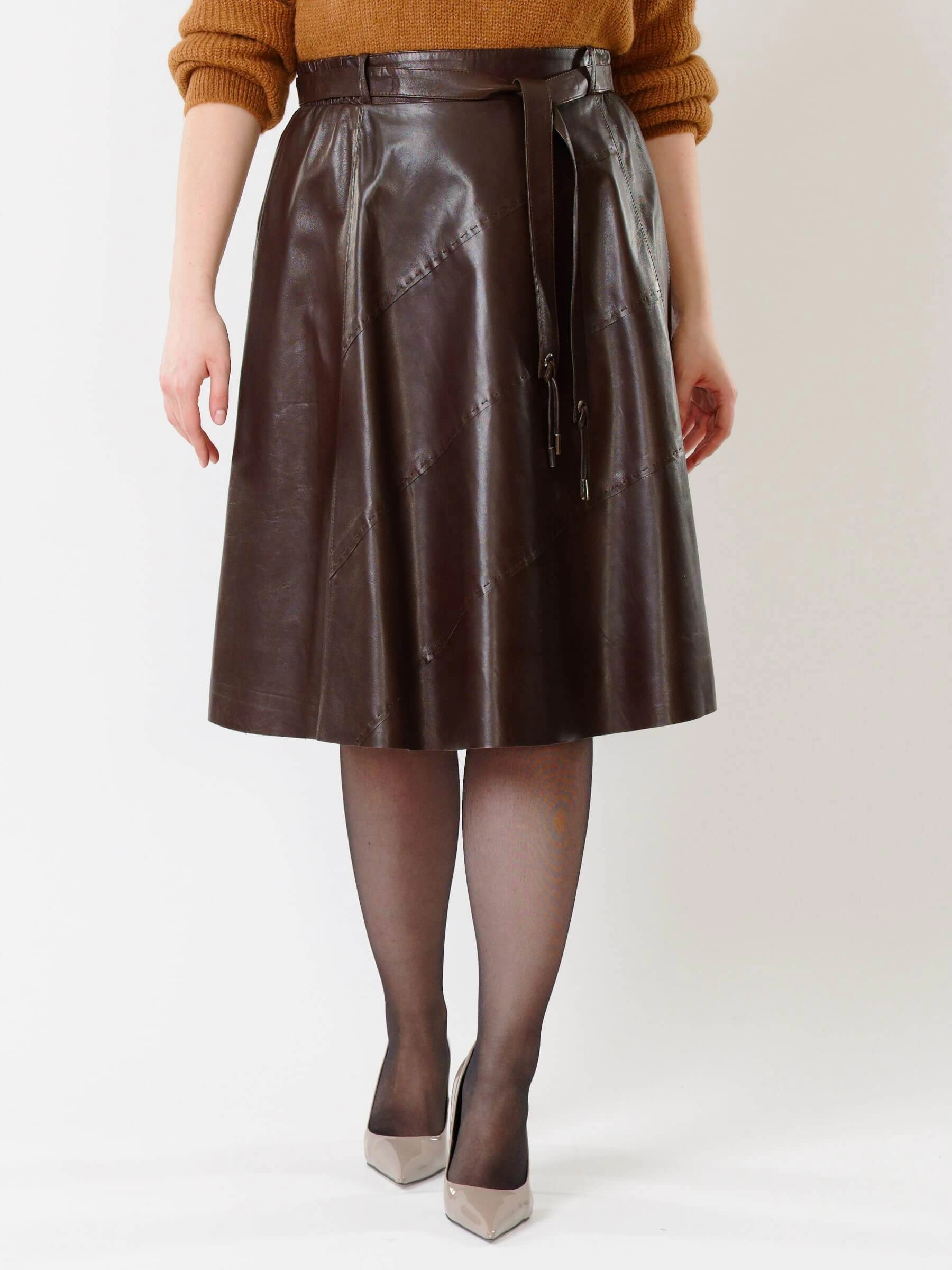 Товар коричневая кожаная юбка 01рс, размер 40, артикул 85132 выполнен из натуральной кожи с застежкой молния. Рассчитан на сезон: демисезон. Длина изделия 70 см, силуэт расклешенный.