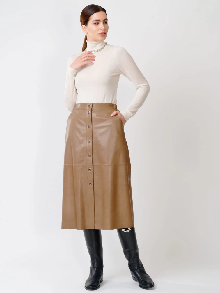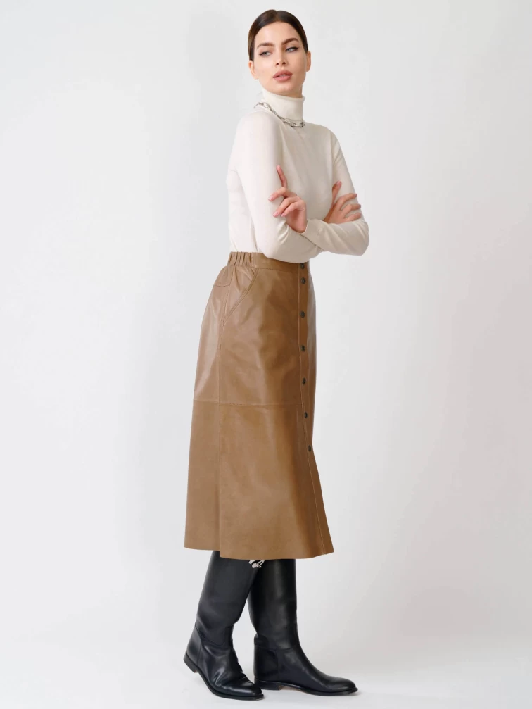 Длинная юбка из натуральной кожи в коричневом оттенке длиной 80 см на кнопках с расклешённым силуэтом обеспечивает безупречную посадку. Мягкая кожа теплого бежево-коричневого тона идеально сочетается с водолазками, объёмными свитерами и кожаными косухами. Дополните образ ботильонами или сапогами на каблуке в тон, добавьте тонкие аксессуары под золото или кожу — получите стильный лук на любой случай. Эта модель в нежном карамельном цвете идеальна для создания элегантных, уютных и одновременно дерзких образов.