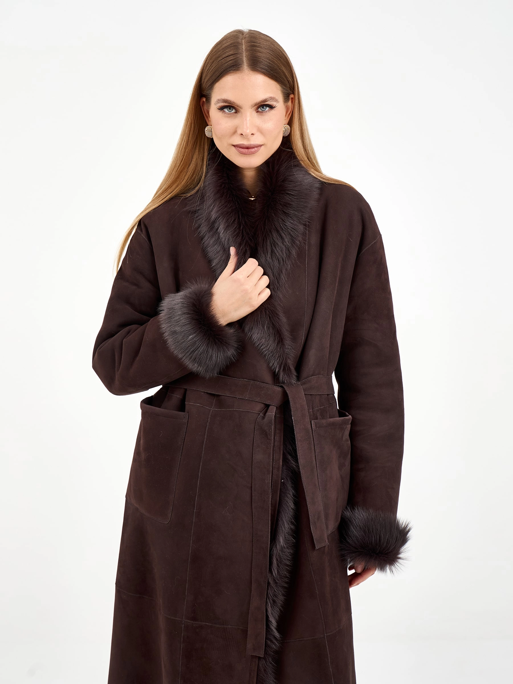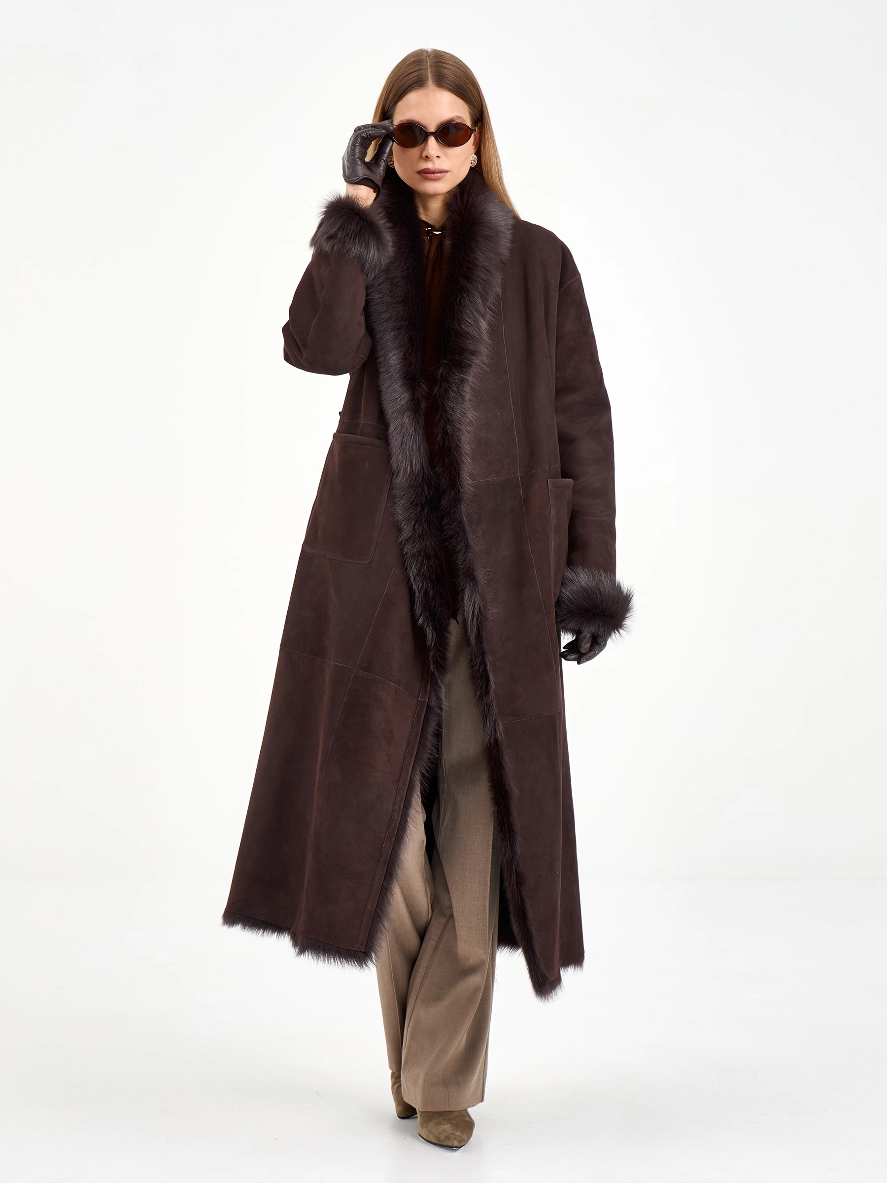 Эта длинная дубленка из натуральной овчины без капюшона воплощает современную классику. Свободный силуэт и запах, фиксируемый поясом, дарят комфорт и универсальность. Благодаря роскошной тосканской овчине и шалевидному воротнику модель выглядит по-настоящему дорого. Для создания законченного образа наденьте ее с водолазкой, кожаными брюками и уггами — это идеальный ансамбль для города в холодные дни.