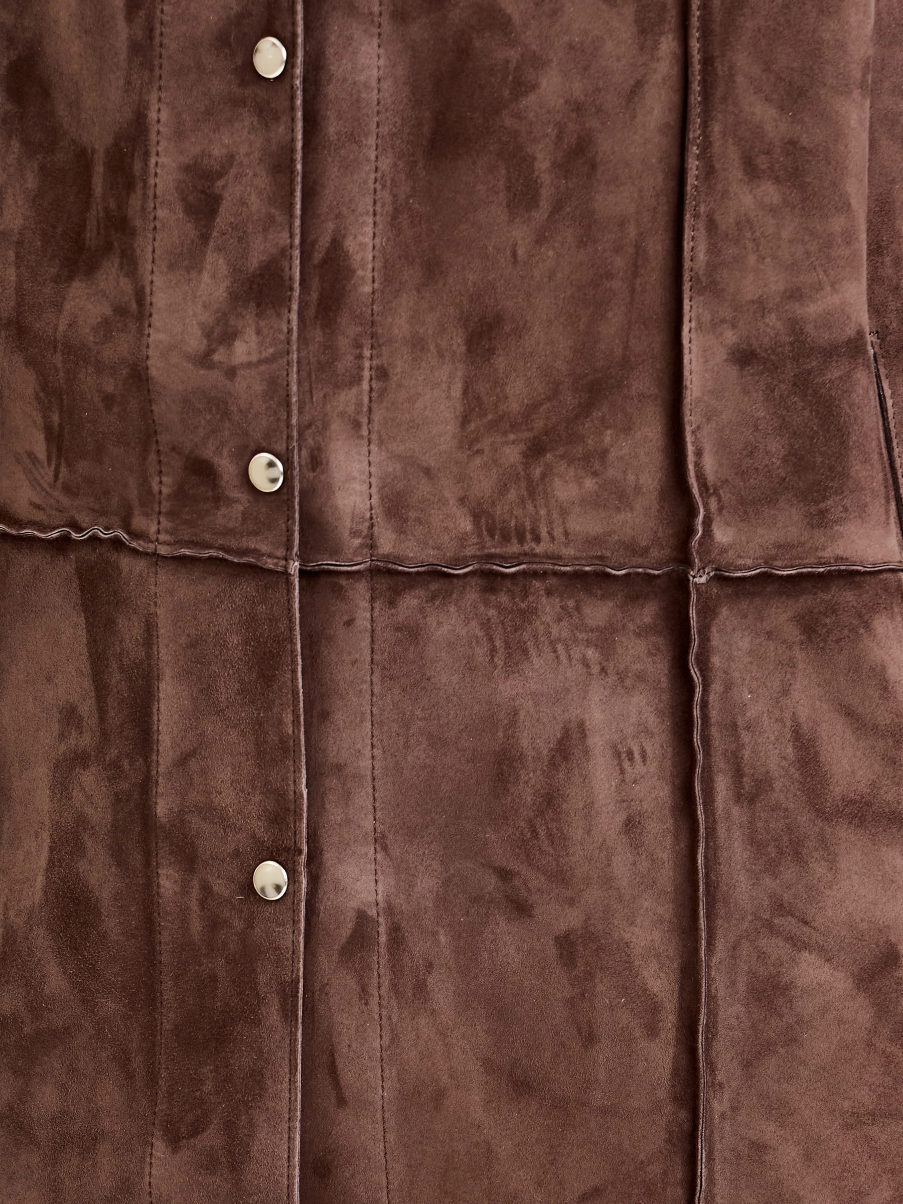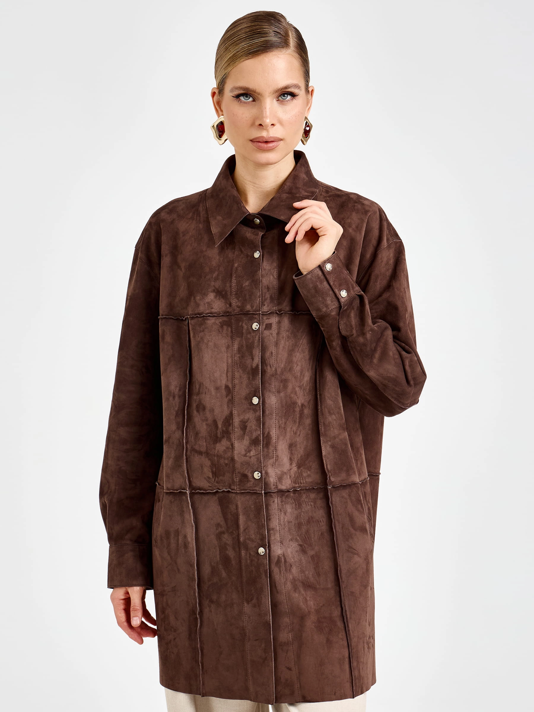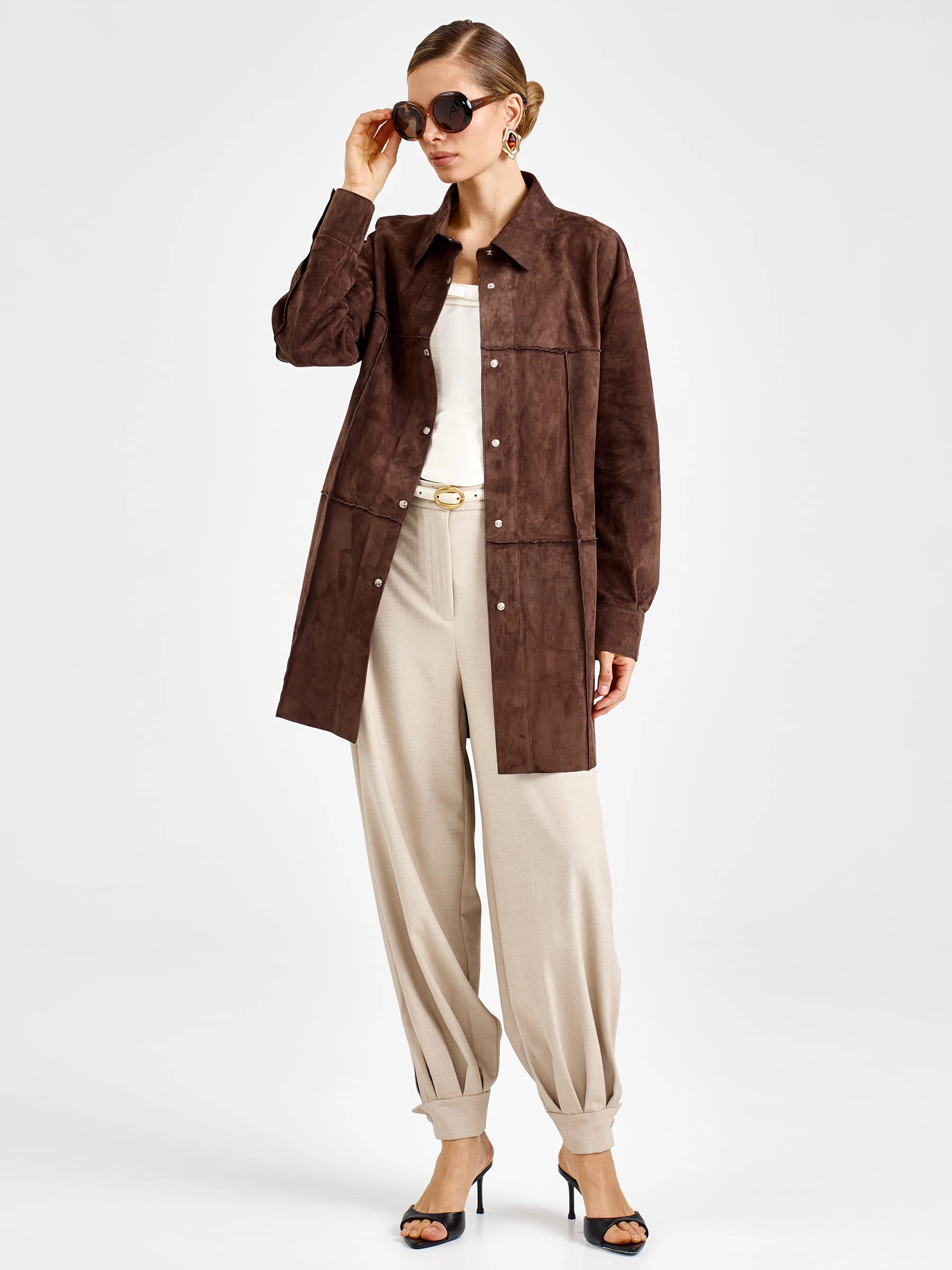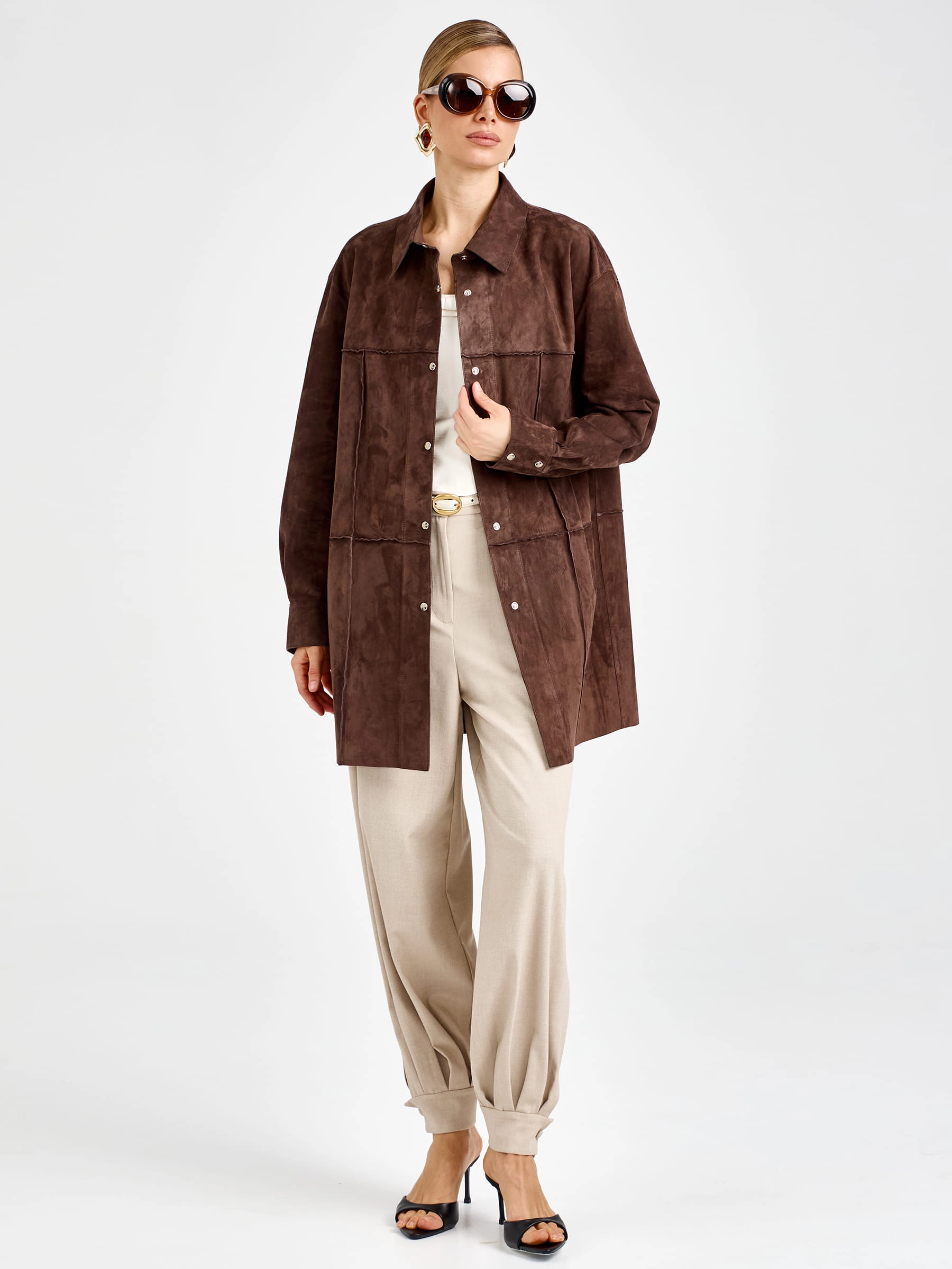 Товар коричневая женская замшевая куртка премиум класса 3108з, размер 42, артикул 92230 выполнен из натуральной замши с застежкой кнопки. Рассчитан на сезон: весна-лето. Длина изделия 85 см, силуэт свободный.
