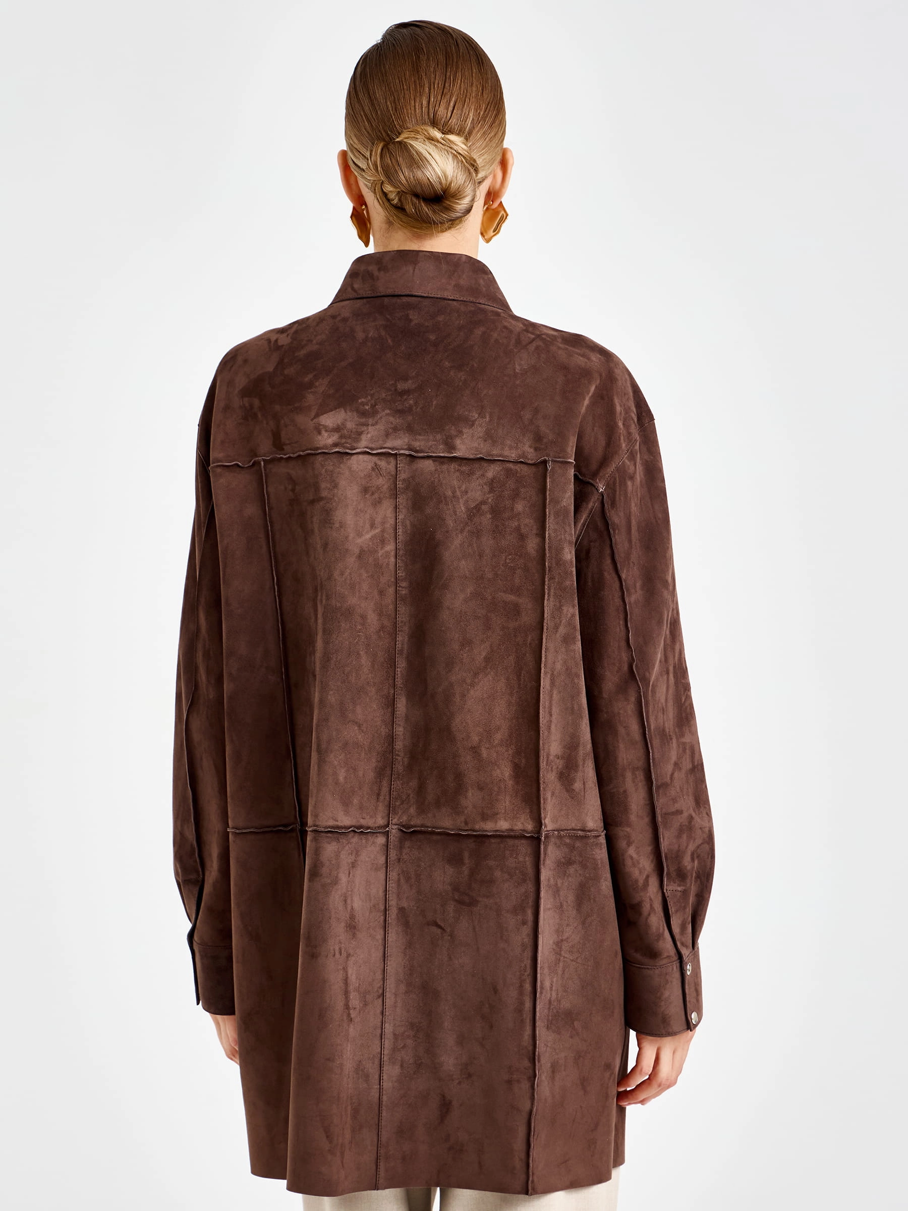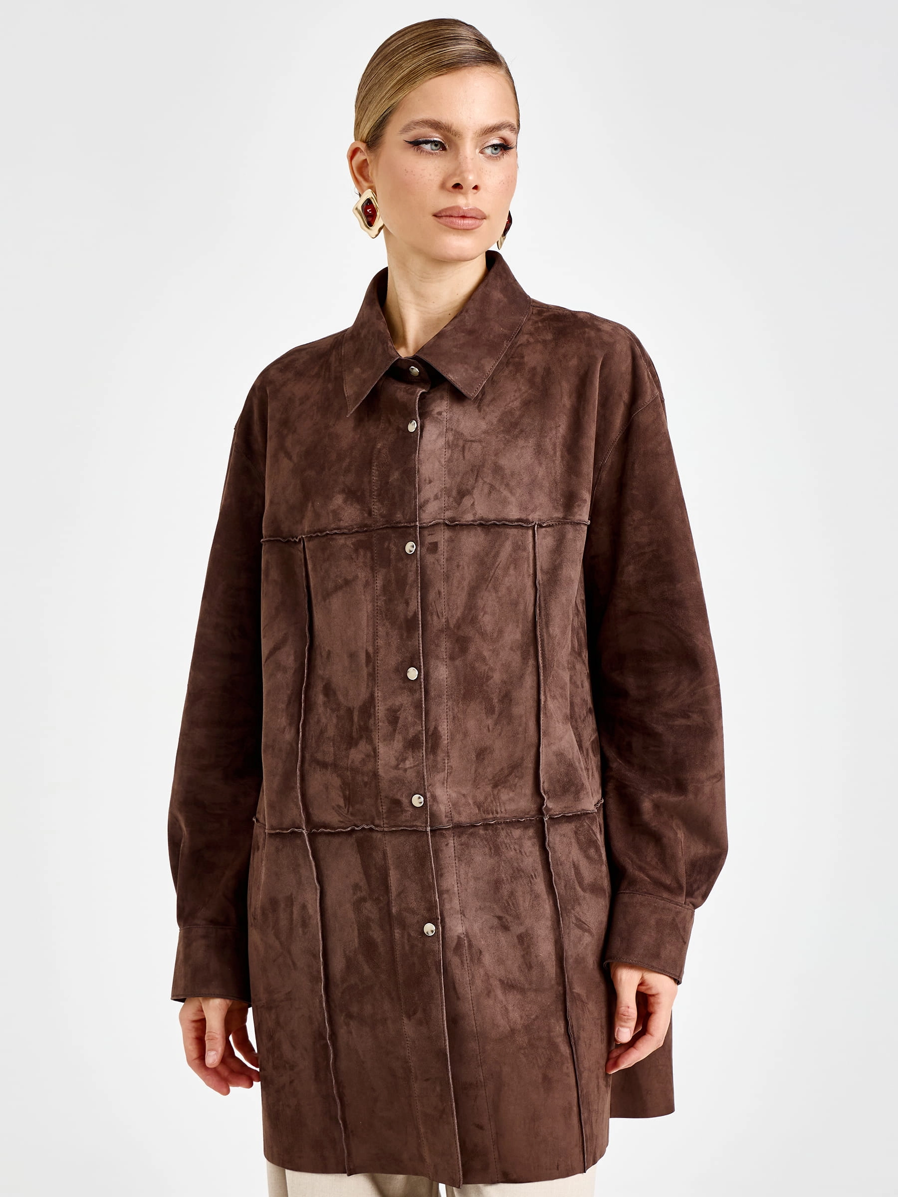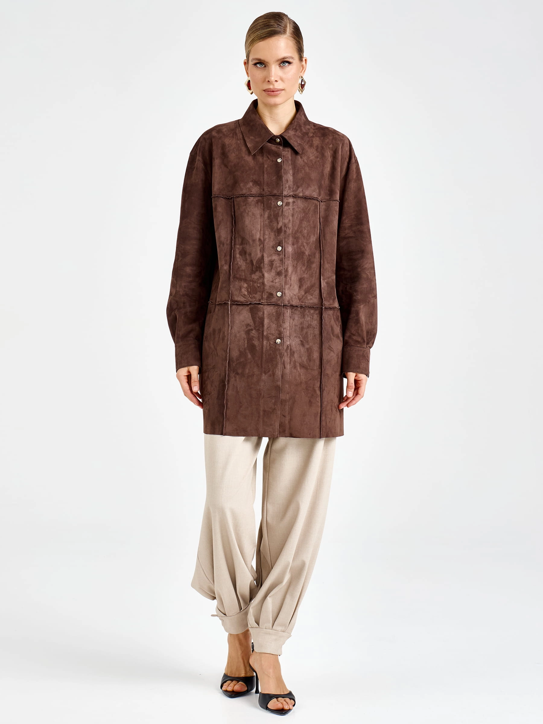 Ощутите невесомость роскоши! Эта легкая женская куртка из натуральной замши премиум-класса длиной 85 см мгновенно покоряет своей утонченной простотой и благородством. Свободный силуэт с модным спущенным рукавом, дополненным изящным манжетом на кнопках, дарит абсолютную свободу движений и создает расслабленный, элегантный образ. Мягкий отложной воротник и аккуратные врезные карманы подчеркивают минималистичный характер модели. Особая деталь — деликатная отстрочка в тон, которая мягко выделяет линии кроя, напоминая изысканный кант и добавляя графичности без лишней контрастности. Застежка на кнопках продумана до мелочей: ею застегивается не только само изделие, но и манжеты рукавов, что позволяет регулировать посадку и создавать идеальный образ. Замша премиум-класса дарит нежнейшую фактуру и тактильный комфорт, а полное отсутствие подкладки делает куртку невероятно легкой, позволяя материалу дышать и мягко облегать фигуру, словно вторая кожа.
