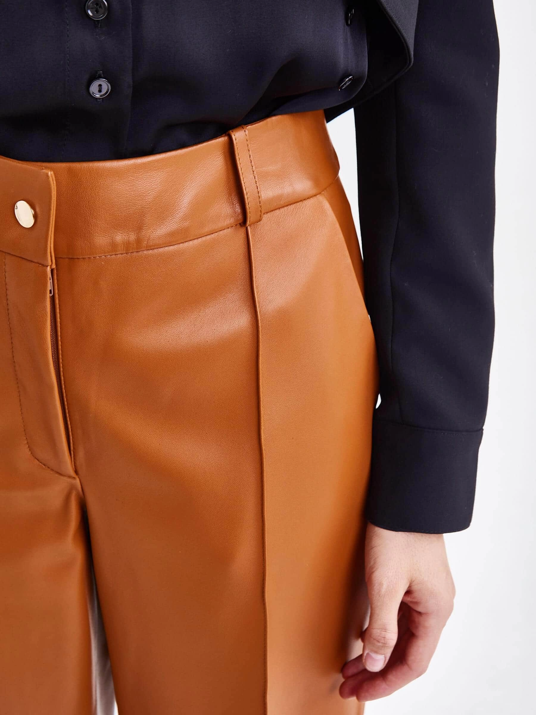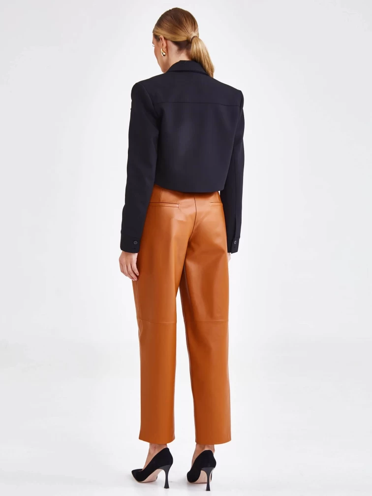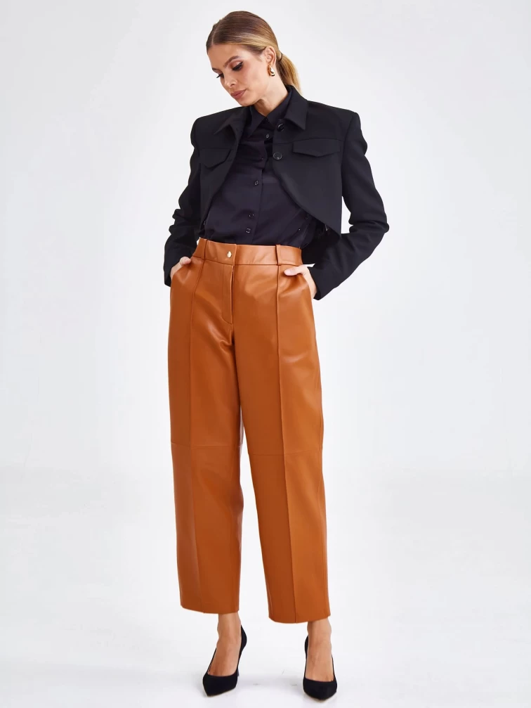 Создать эффектный образ помогут брюки со стрелками из натуральной кожи премиум-класс. Прямой крой, средняя посадка, удобные боковые карманы.