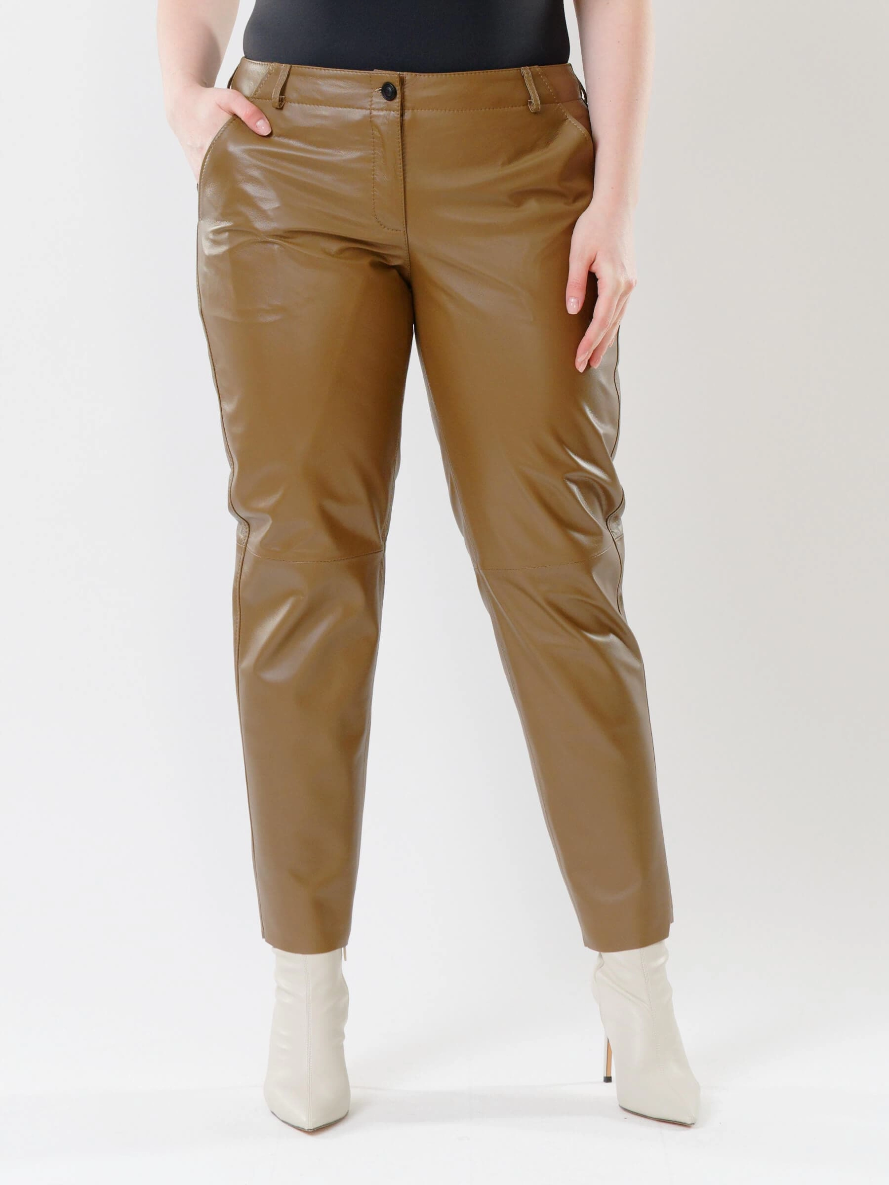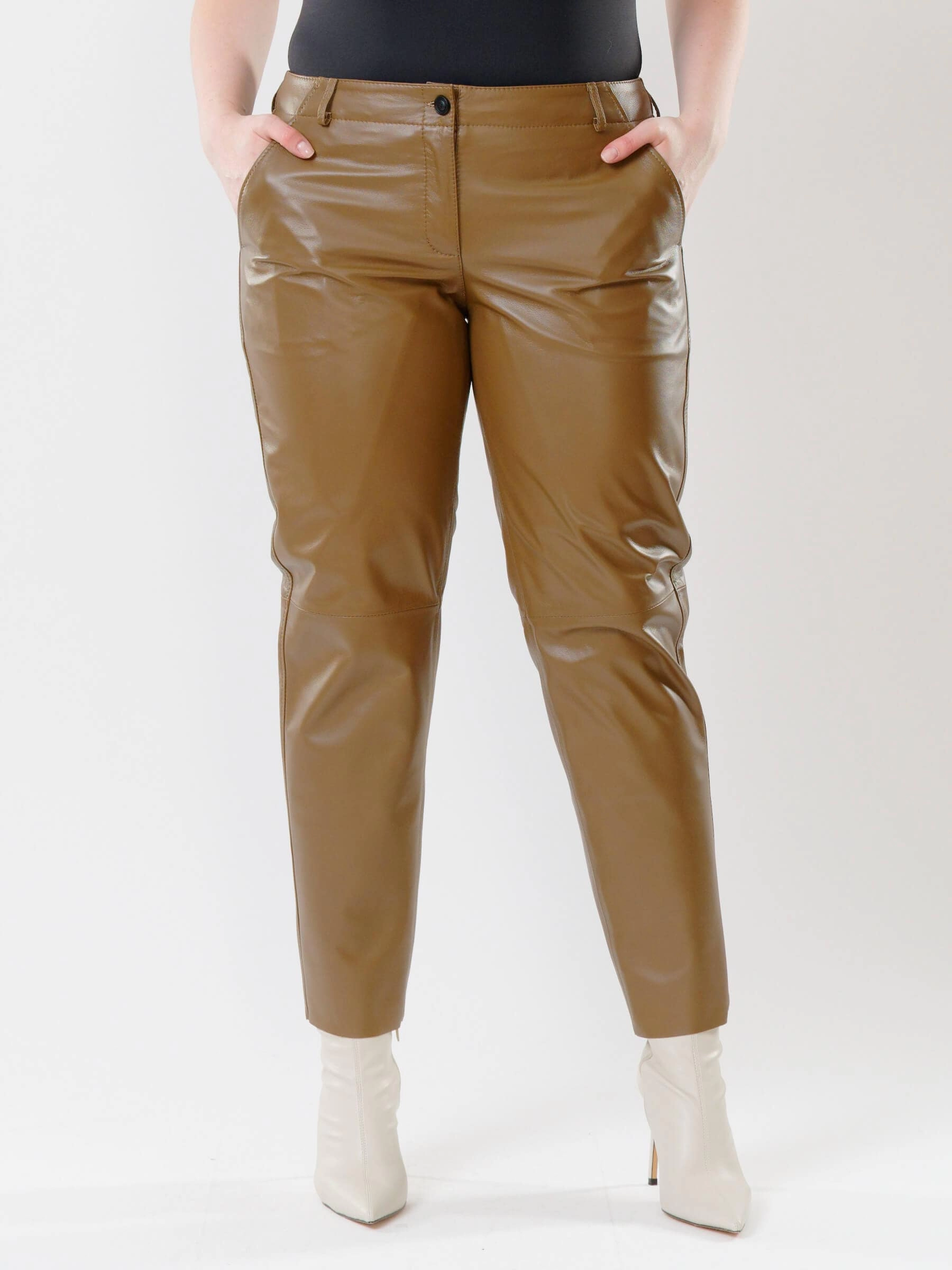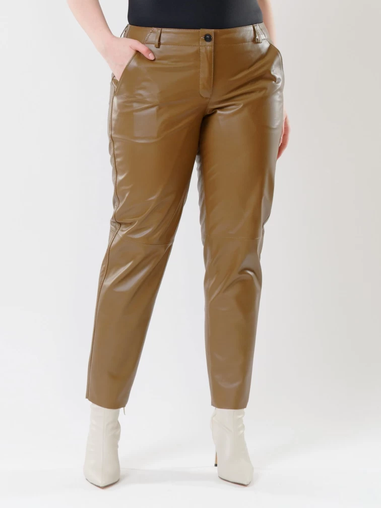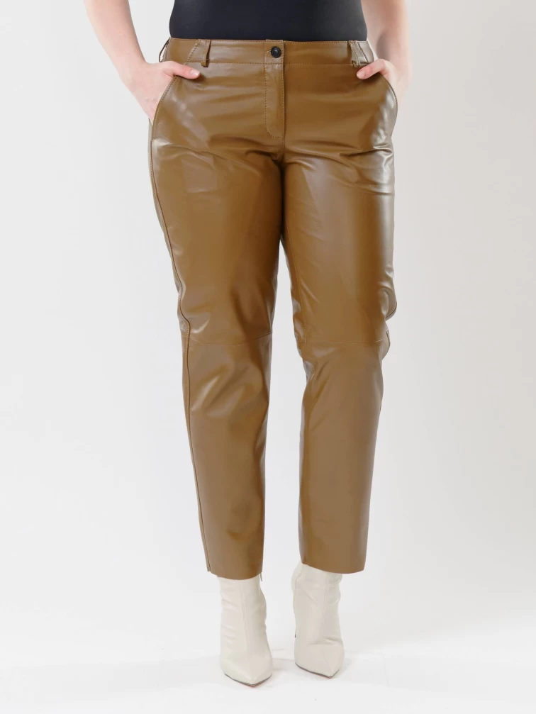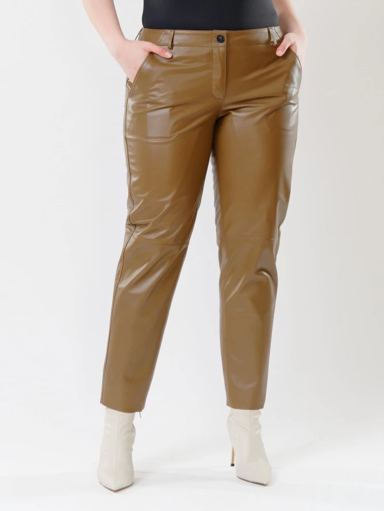 Товар коричневые зауженные женские кожаные брюки 03, размер 48, артикул 85522 выполнен из натуральной кожи с застежкой молния. Рассчитан на сезон: демисезон. Длина изделия 98 см, силуэт зауженный.