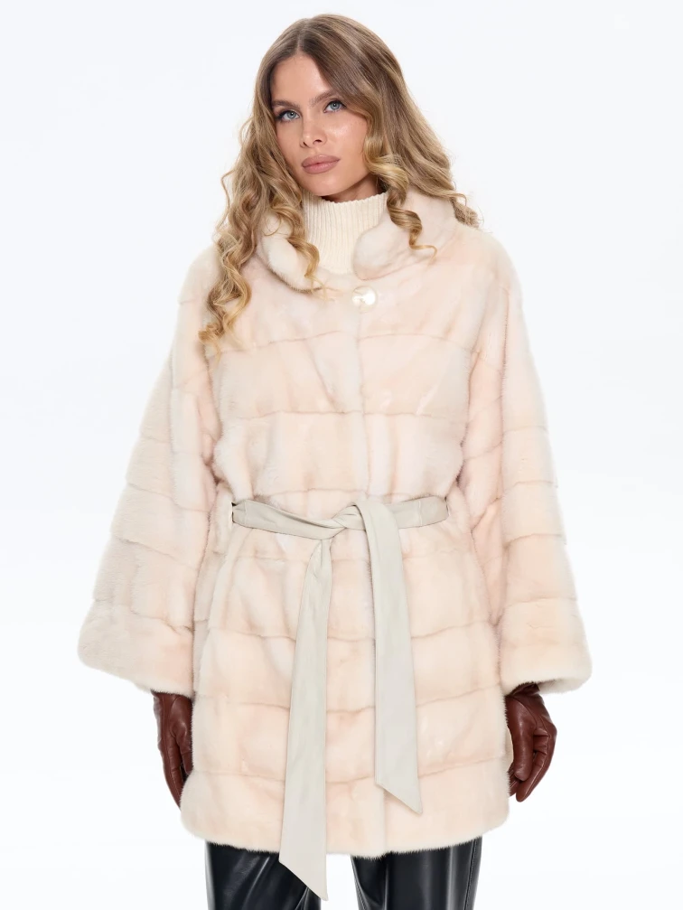 Короткую шубу прямого покроя выполнили из элитной натуральной норки с густым глянцевым ворсом и равномерным окрасом в диагональной раскладке. Тщательная ручная отборка шкурок гарантирует идеальную мягкость. Спущенный крой рукавов создает модный силуэт, который визуально смягчает линию плеч, добавляет образу лёгкости и не стесняет движения, что делает модель идеальной для вождения и активных прогулок. Воротник-стойка подчёркивает шею, создаёт лаконичный контур и прекрасно сочетается с шарфами и объемными аксессуарами. Скрытые клипсы надёжно фиксируют изделие, не повреждая мех и сохраняя чистоту линий. Модель дополнена двумя боковыми карманами и широким кожаным поясом
