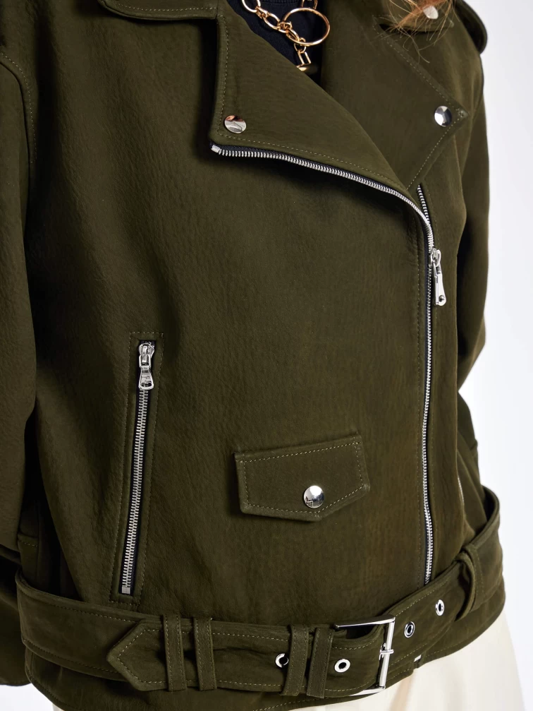Товар короткая кожаная куртка косуха с поясом для женщин премиум класса 3052, хаки, размер 44, артикул 23460 выполнен из натуральной кожи. Рассчитан на сезон: весна-осень. Длина изделия 60 см, силуэт свободный.