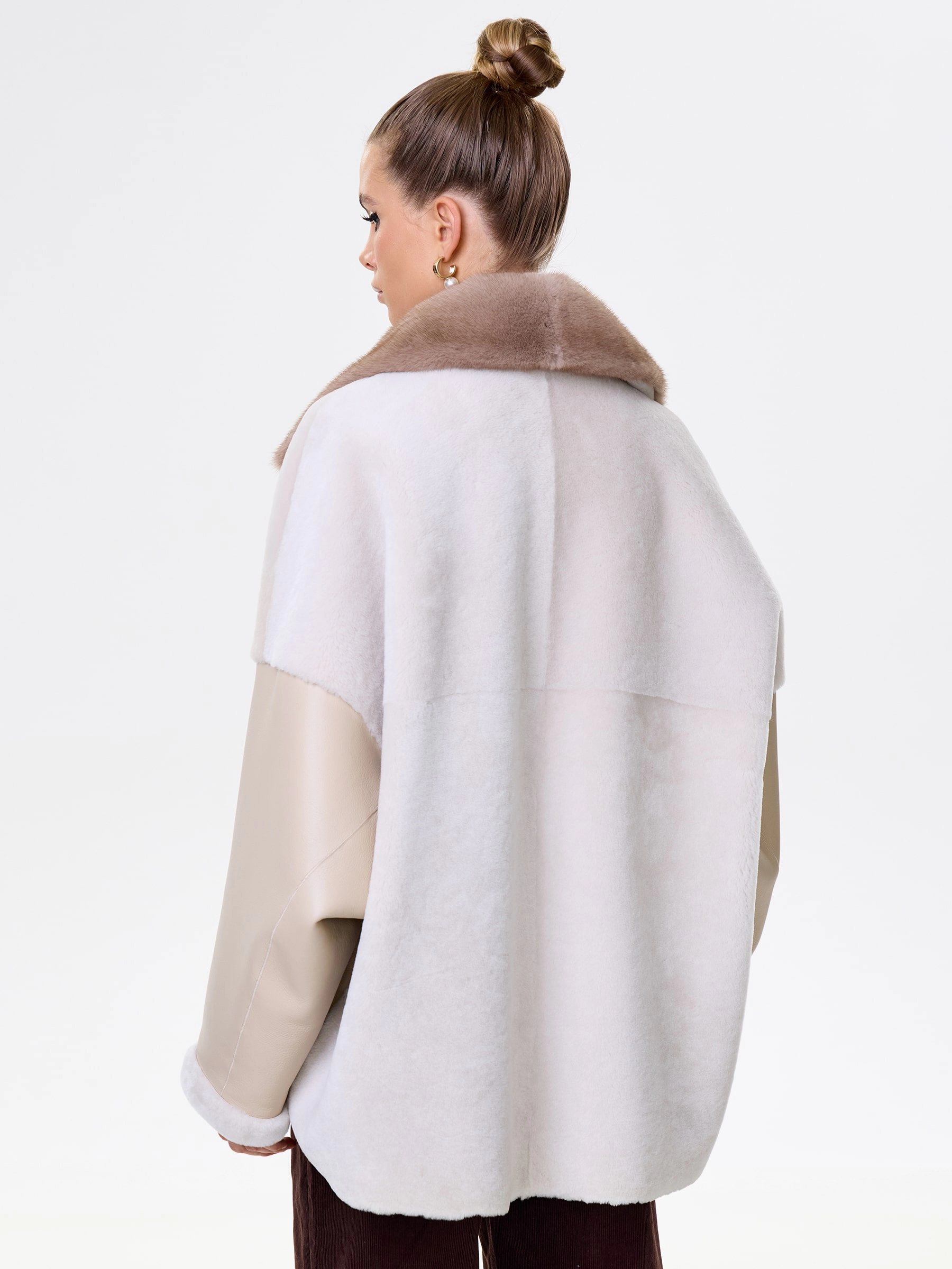 Товар короткая женская дубленка с норковым воротником премиум класса 2034, бежевая, размер 52, артикул 64180 выполнен из овчина "мерино" с застежкой молния. Рассчитан на сезон: осень-зима. Длина изделия 76 см, силуэт свободный.