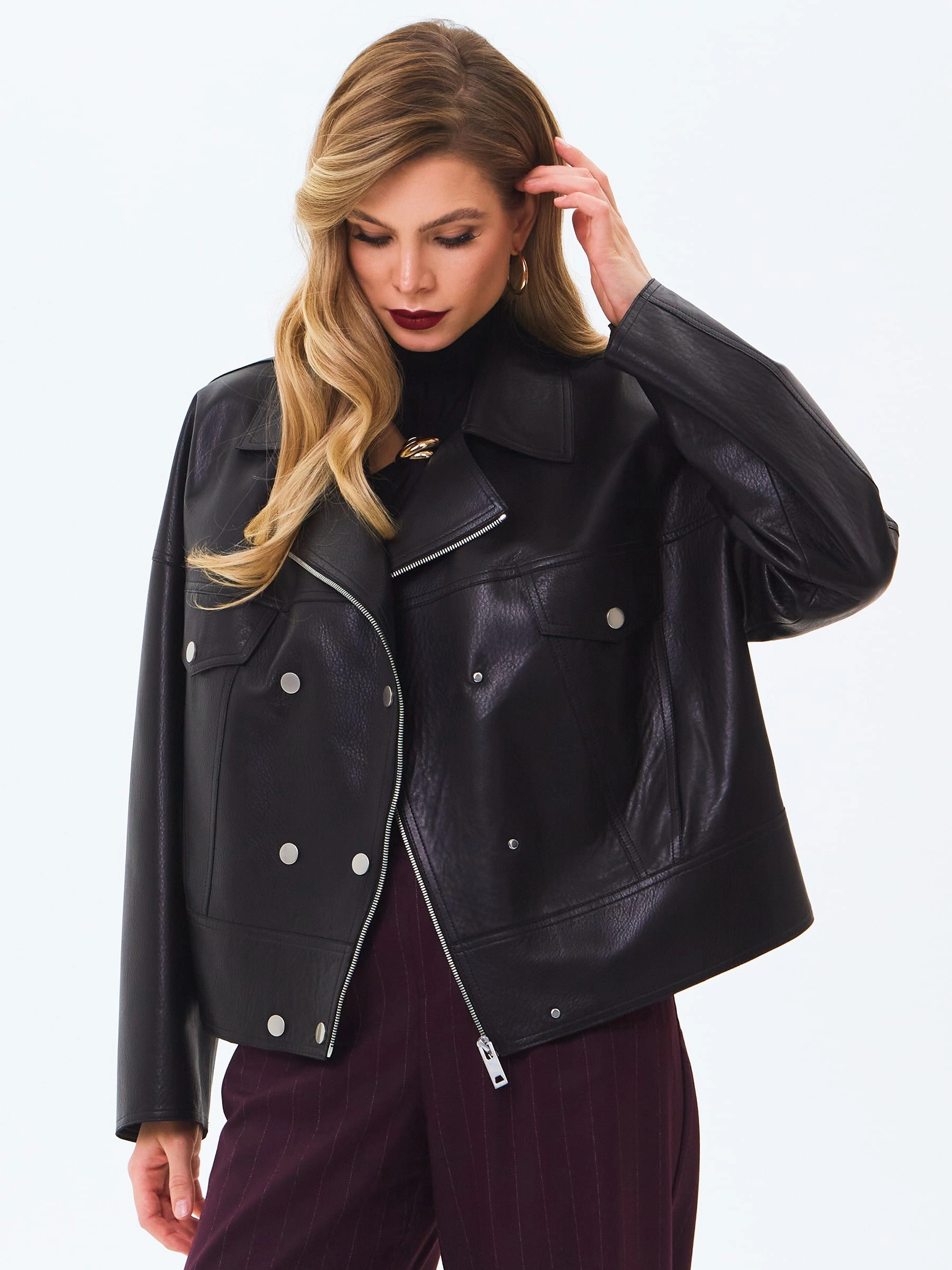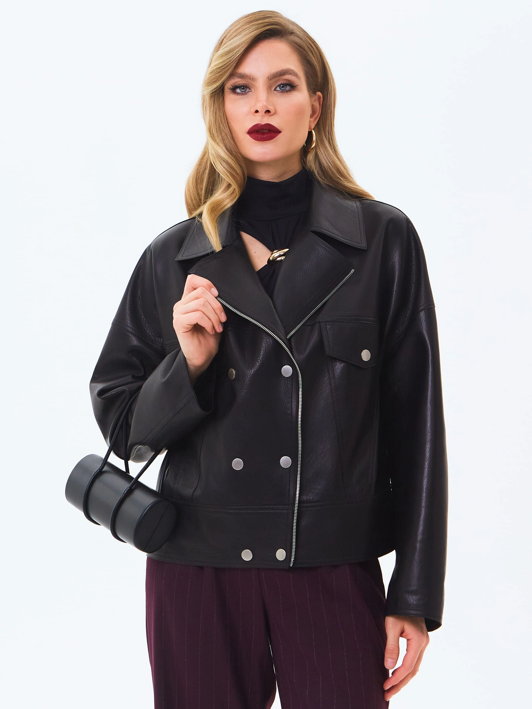 Короткая женская кожаная куртка косуха премиум класса 3085, черная, размер 46, артикул 24610