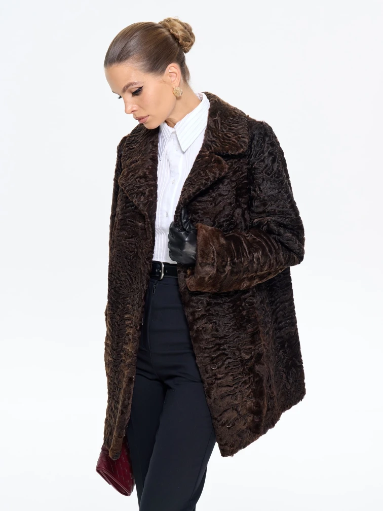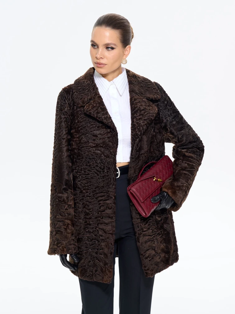Товар короткая женская шуба из меха каракульчи алиса, коричневая, размер 48, артикул 65560 выполнен из мех каракульчи с застежкой клипсы. Рассчитан на сезон: весна-осень. Длина изделия 80 см, силуэт прямой.