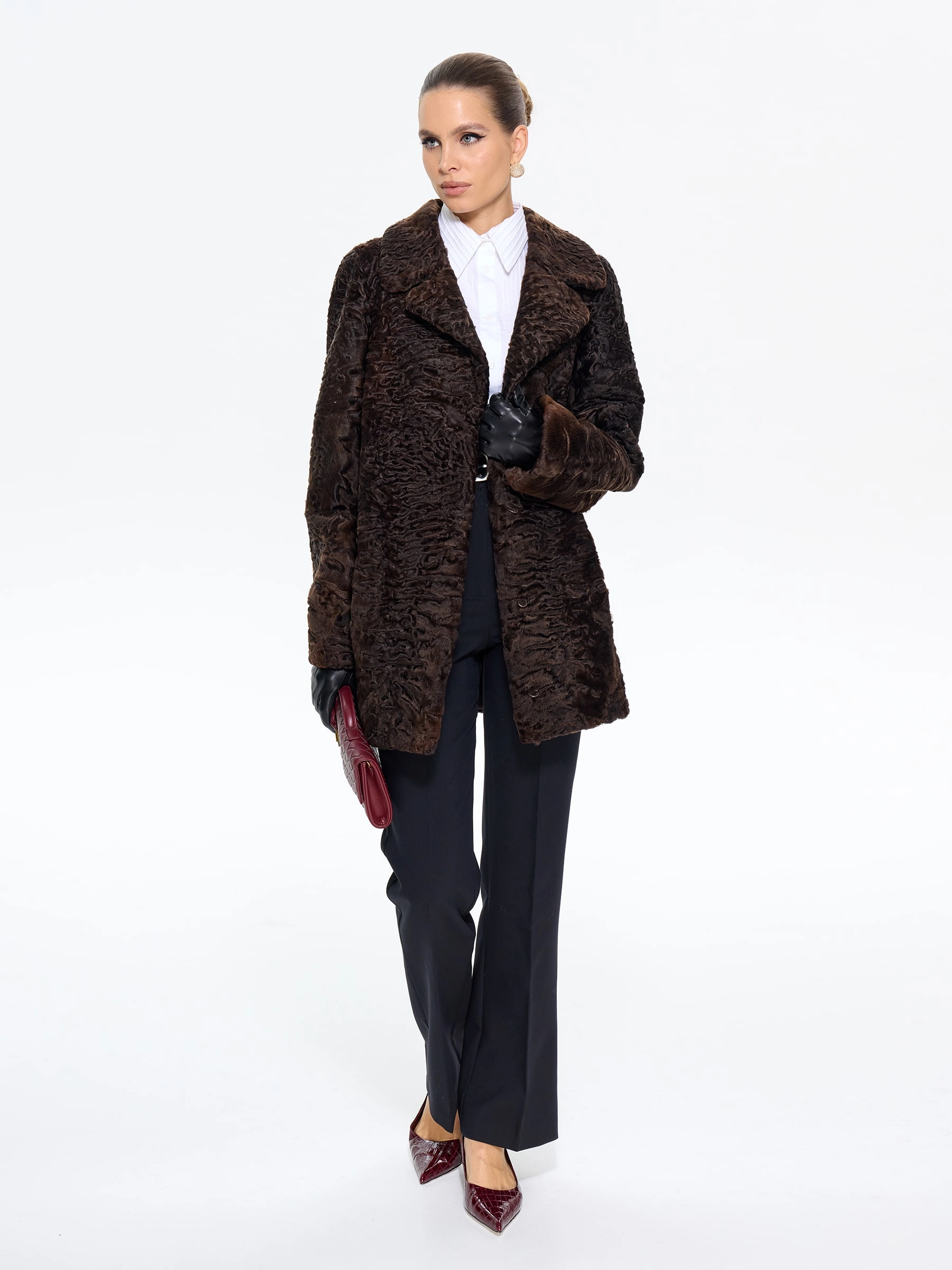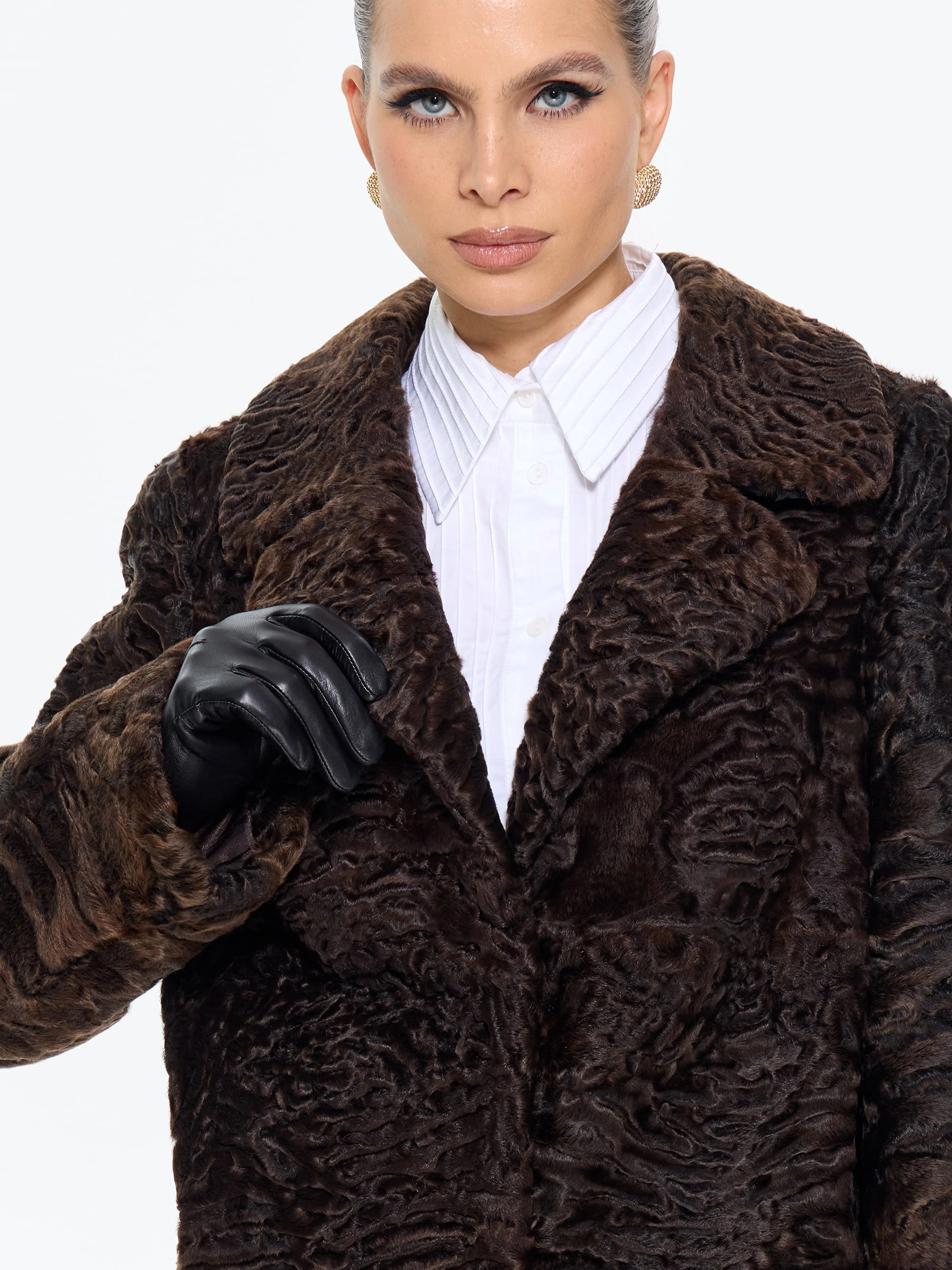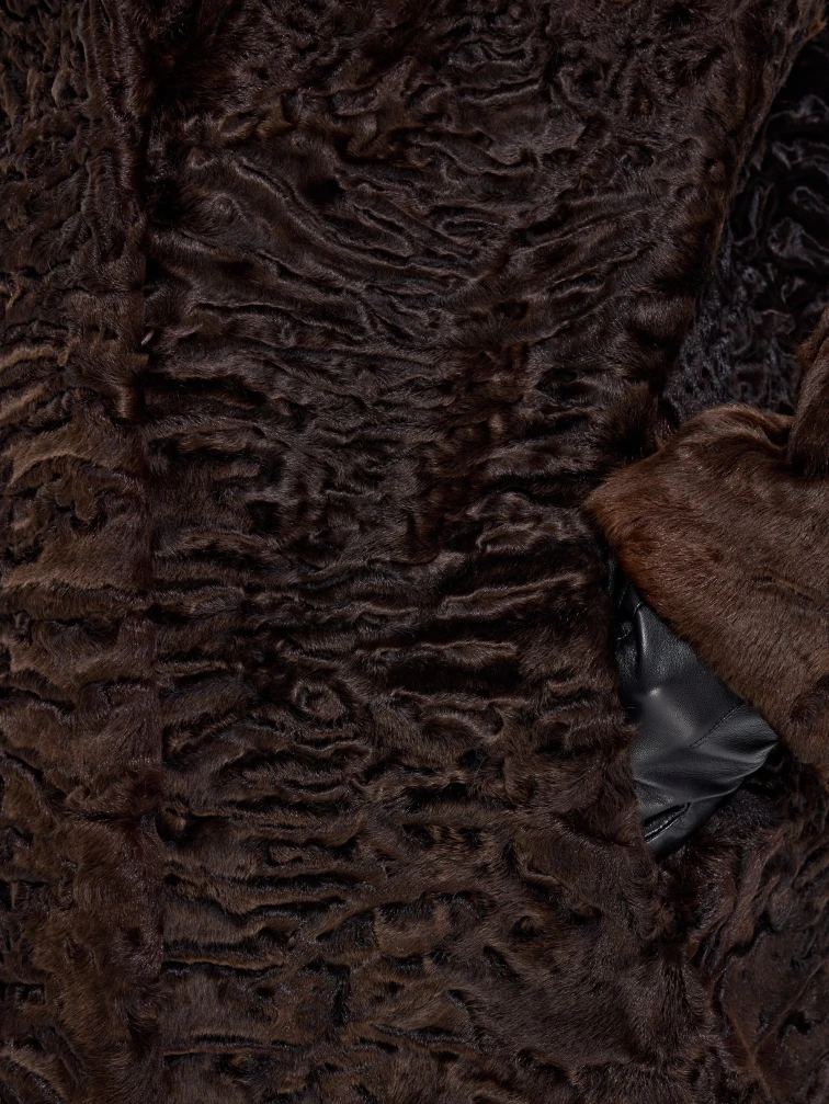 Элегантная шуба из меха каракульчи премиум-класса с английским воротником прямого силуэта. Классическая длина 80 см и втачной рукав создают утонченный образ, который дополнит кожаными перчатками и сапогами-челси для повседневной элегантности или с платьем-футляром для вечернего выхода. Эта модель — воплощение вечного шарма и аристократического стиля в коричневом оттенке.