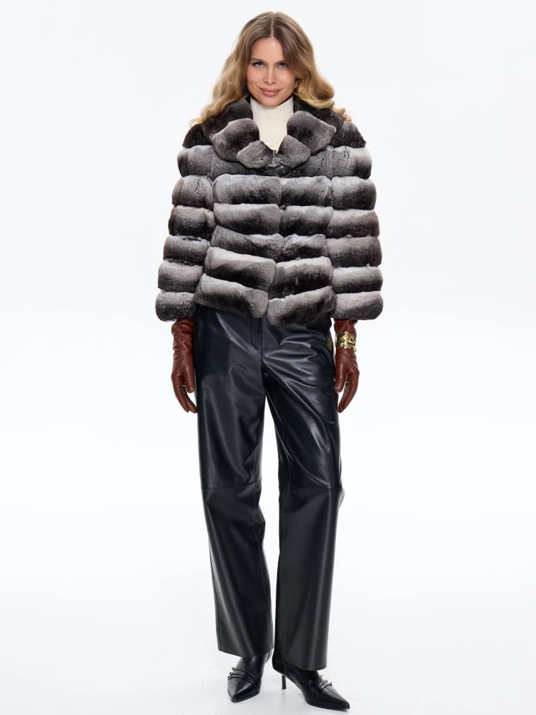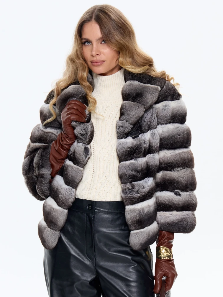 Короткую шубу прямого кроя выполнили из эксклюзивного меха шиншиллы — невесомого, с уникальным серебристо-голубым переливом и облачной мягкостью, где хаотичный рисунок волосков и мерцающий блеск невозможно воспроизвести искусственно. Укороченный крой акцентирует талию и идеально сочетается с юбками и брюками с высокой посадкой, в то время как воротник-шале драпируется элегантными волнами, заменяя аксессуары. Вискозная подкладка, шелковистая на ощупь, защищает деликатный мех от контакта с кожей, а скрытые клипсы обеспечивают фиксацию без видимых элементов, делая эту куртку воплощением эксклюзивности, которая требует уверенности, но вознаграждает владелицу уникальным образом, недоступным в масс-маркете — это инвестиция в статус, а не в практичность.