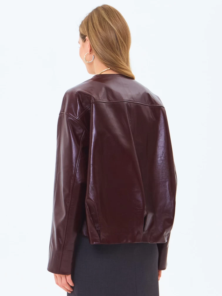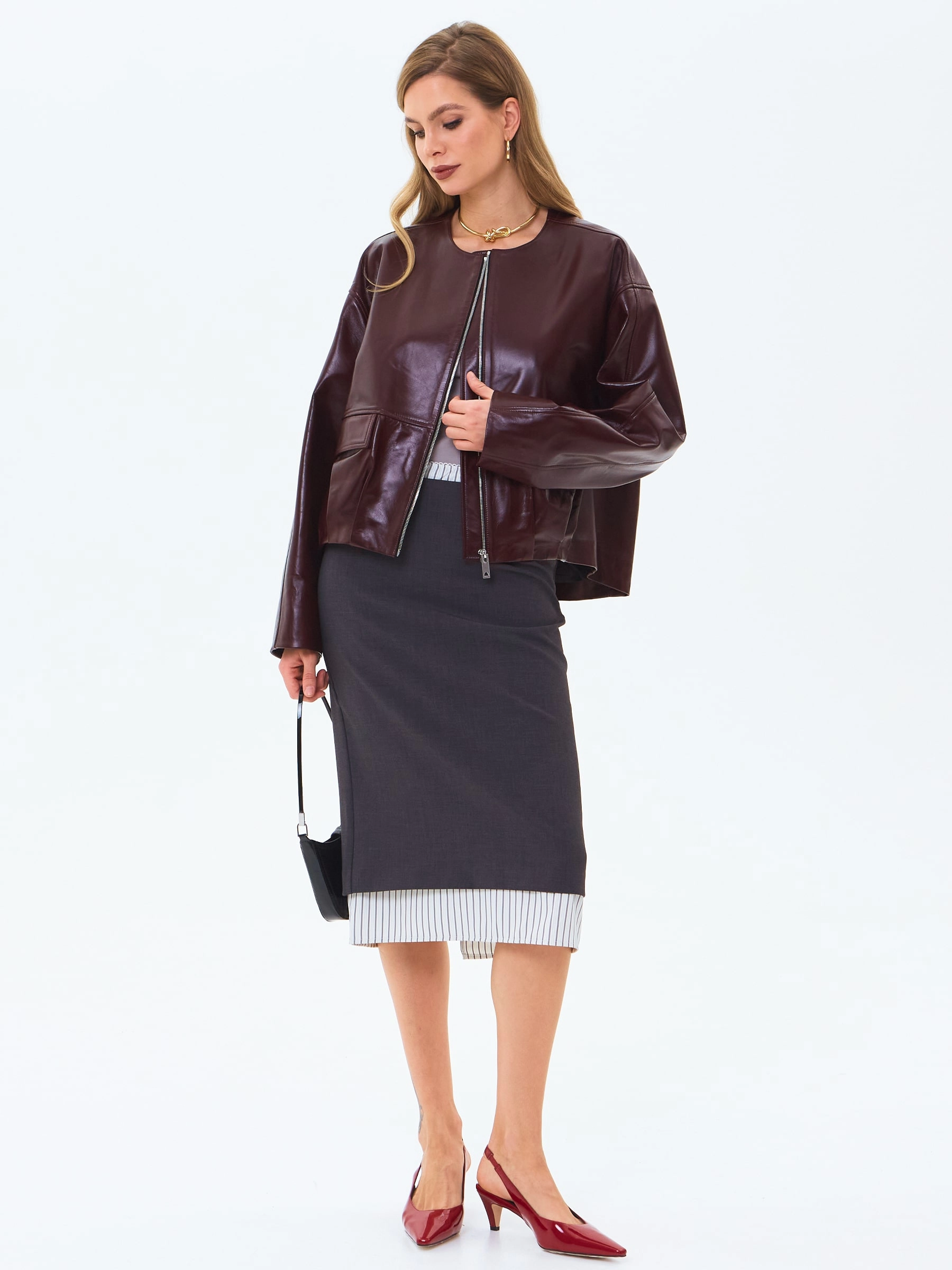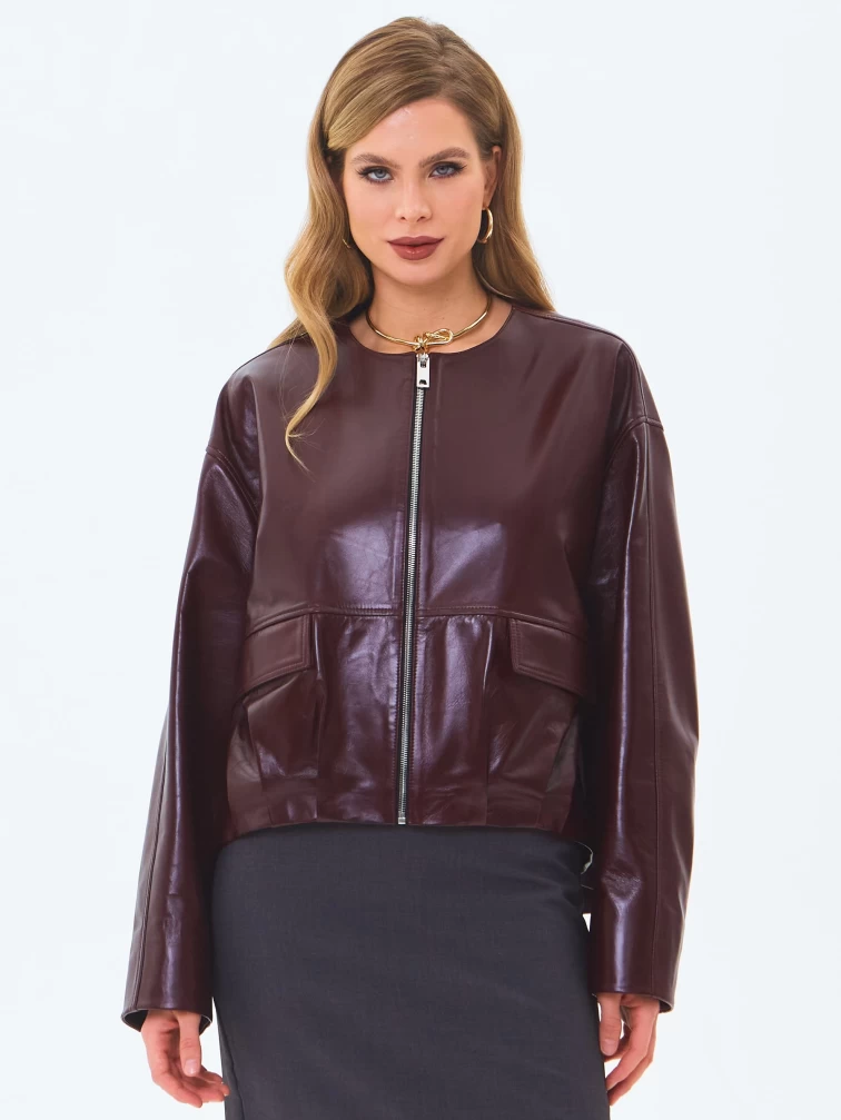 Короткую куртку бомбер с круглым воротом выполнили из тонкой гладкой кожи премиум класс. Модель свободного кроя и двумя накладными карманами с клапанами застегивается молнией.
