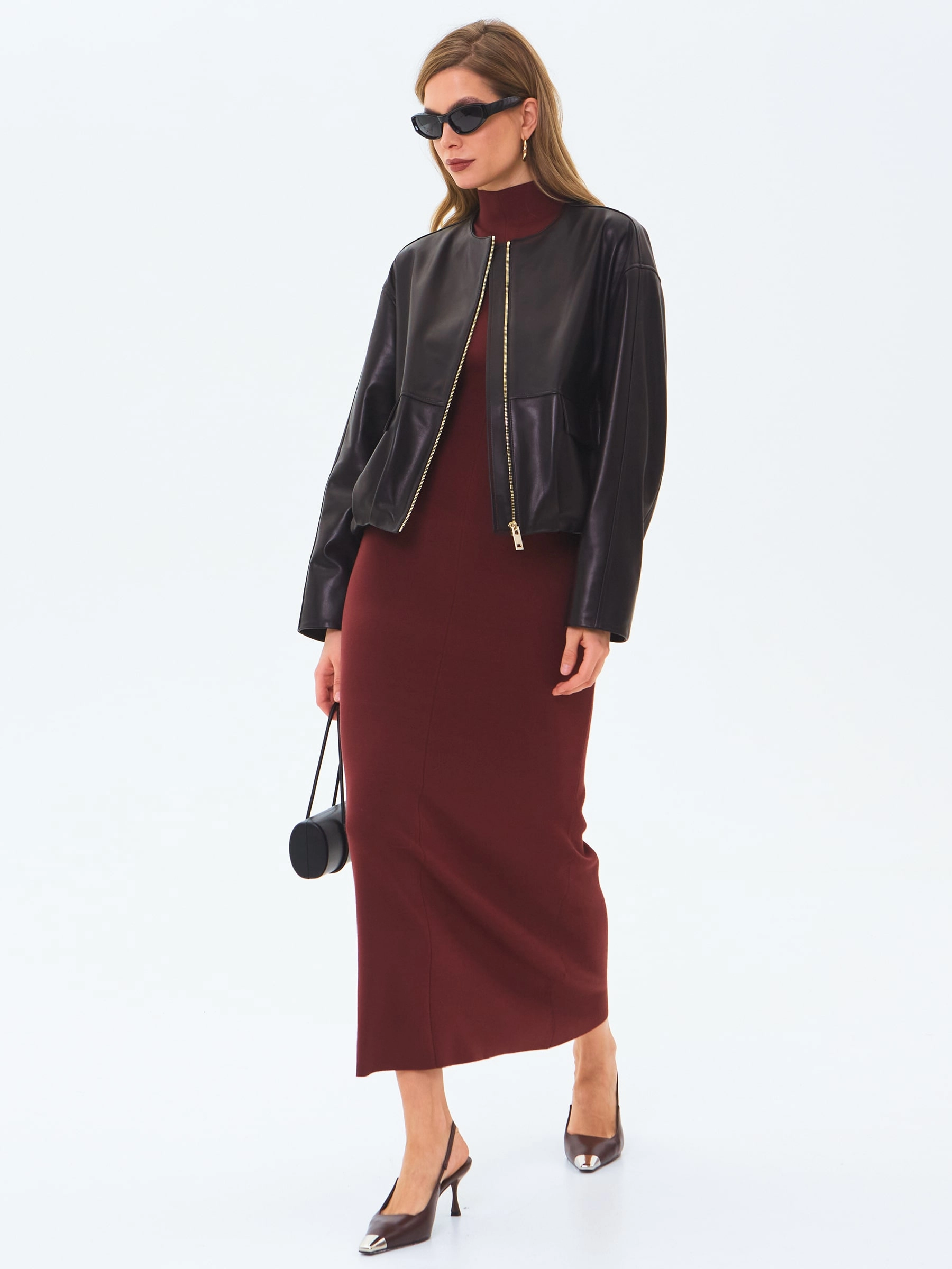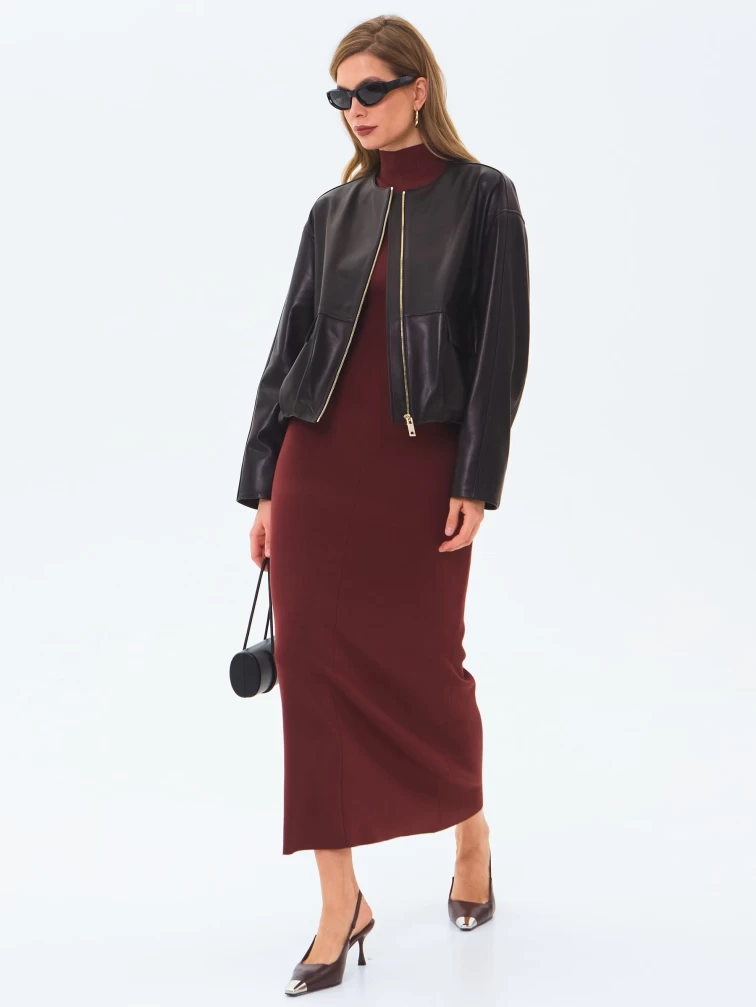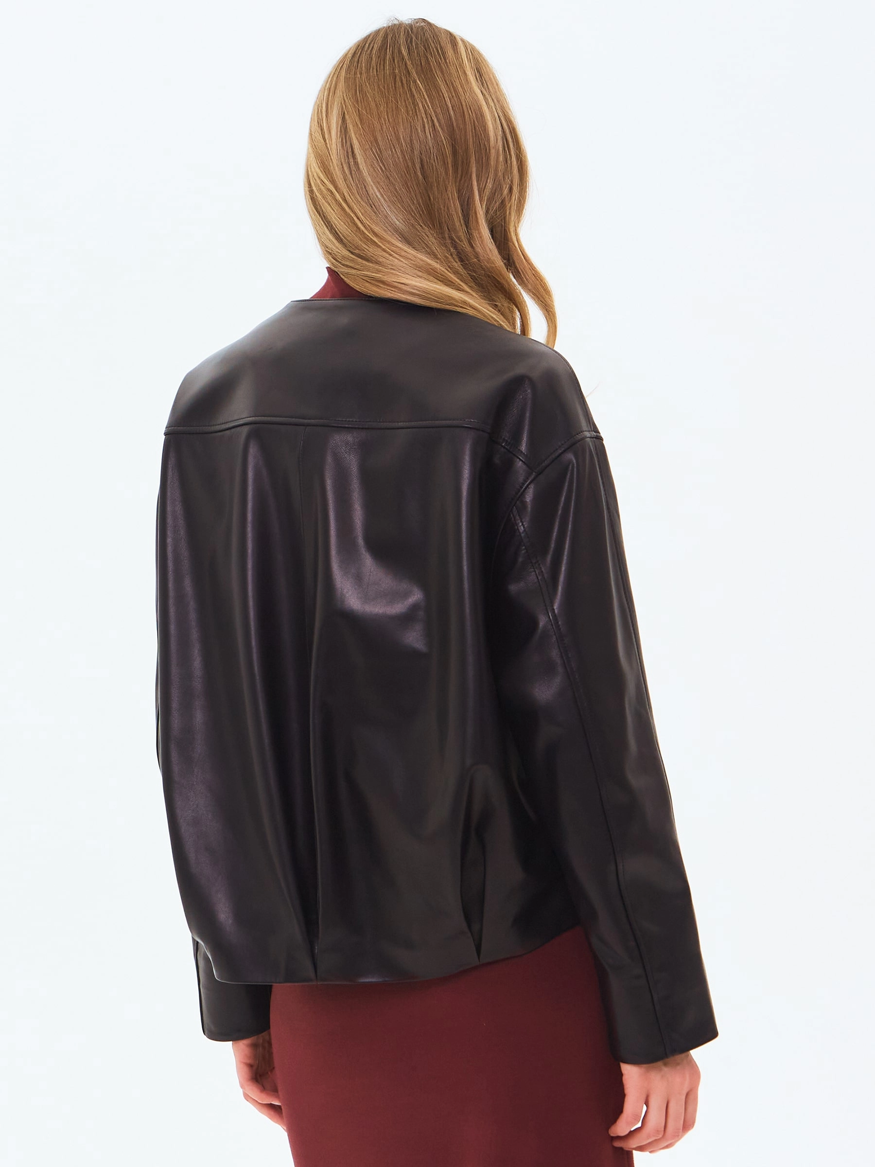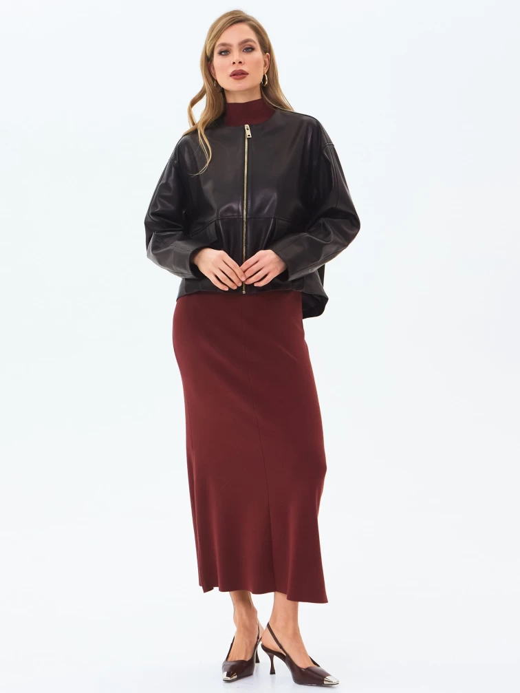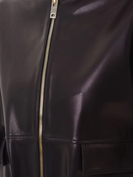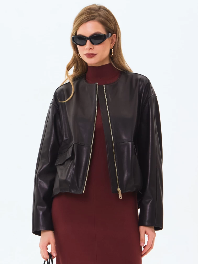 Короткую куртку бомбер с круглым воротом выполнили из тонкой гладкой кожи премиум класс. Модель свободного кроя и двумя накладными карманами с клапанами застегивается молнией.